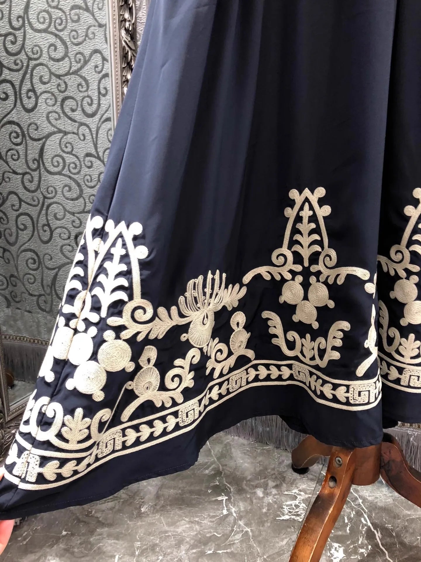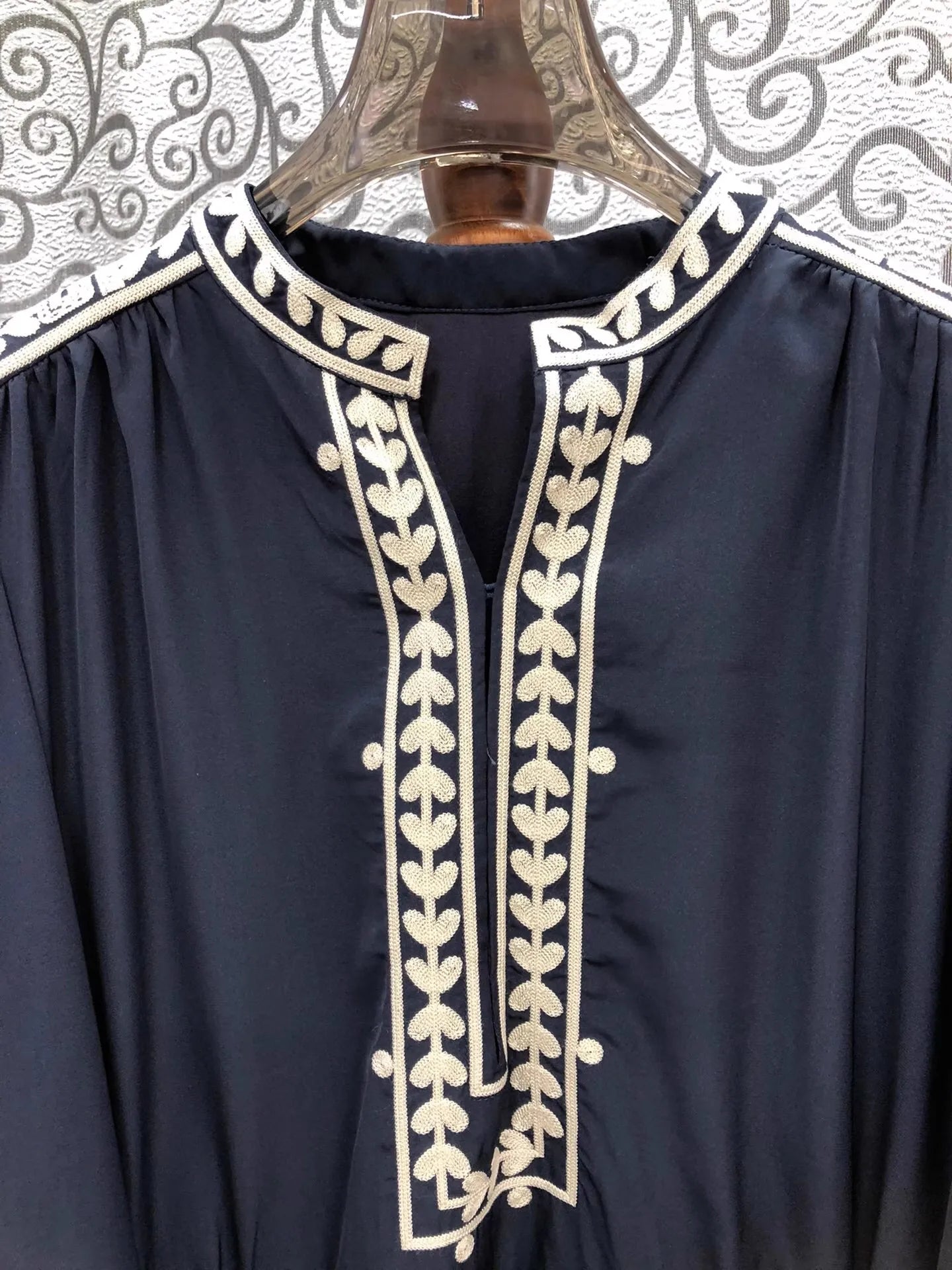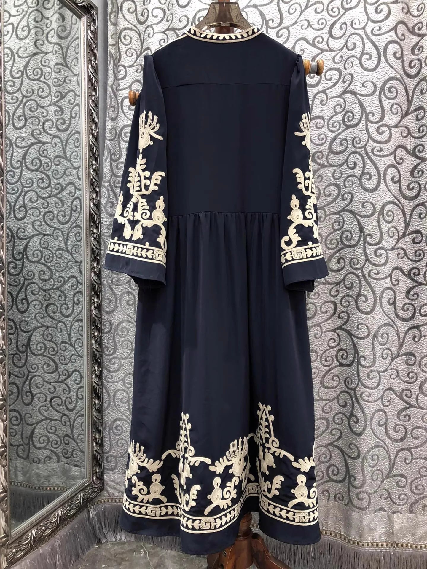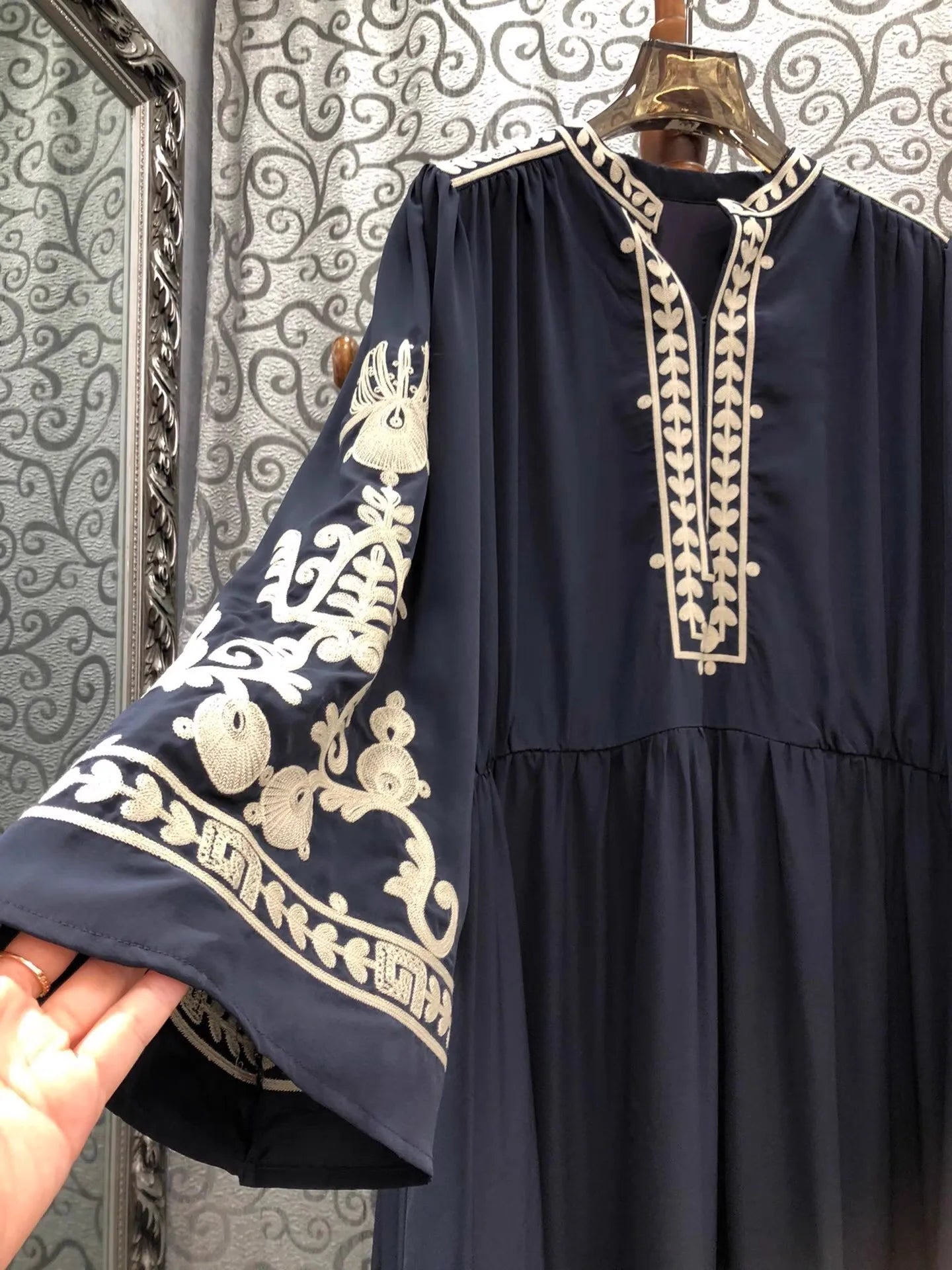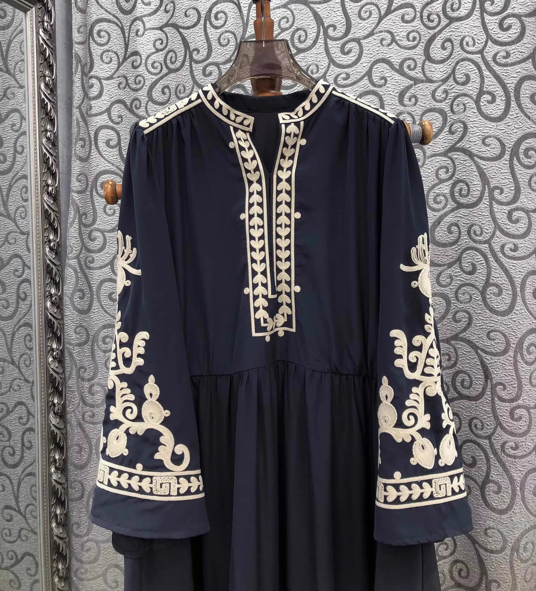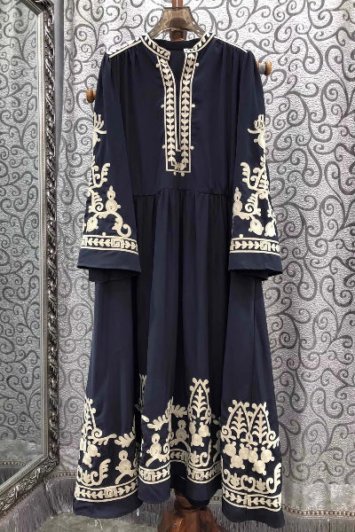 Transition into autumn with the effortless comfort of this midi-length dress, a beautifully styled piece for your high street wardrobe. The lightweight woven viscose fabric drapes gracefully in a loose fit, maintaining an anti-wrinkle finish. It features an elegant O-neckline and full sleeves, while the floral pattern is subtly accented with tasteful embroidery, providing a simple yet refined textural dimension to this chic design.