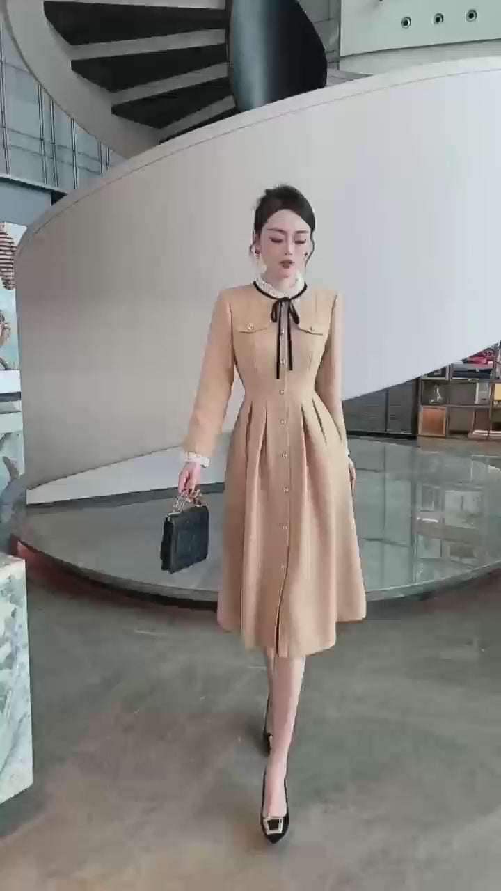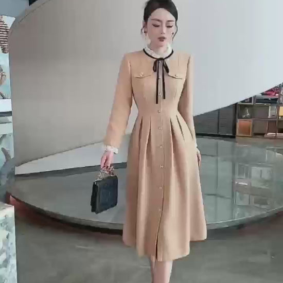 A beautifully tailored piece for the autumn season, this midi-length dress offers a sophisticated take on high street style. Crafted from a structured woven wool-polyester blend, the fabric maintains a smooth, anti-wrinkle drape in a timeless A-line silhouette. It features a refined stand collar and elegant full-length sleeves, while delicate appliqués subtly enhance the solid hue, lending a simple, chic textural focus to this essential design.