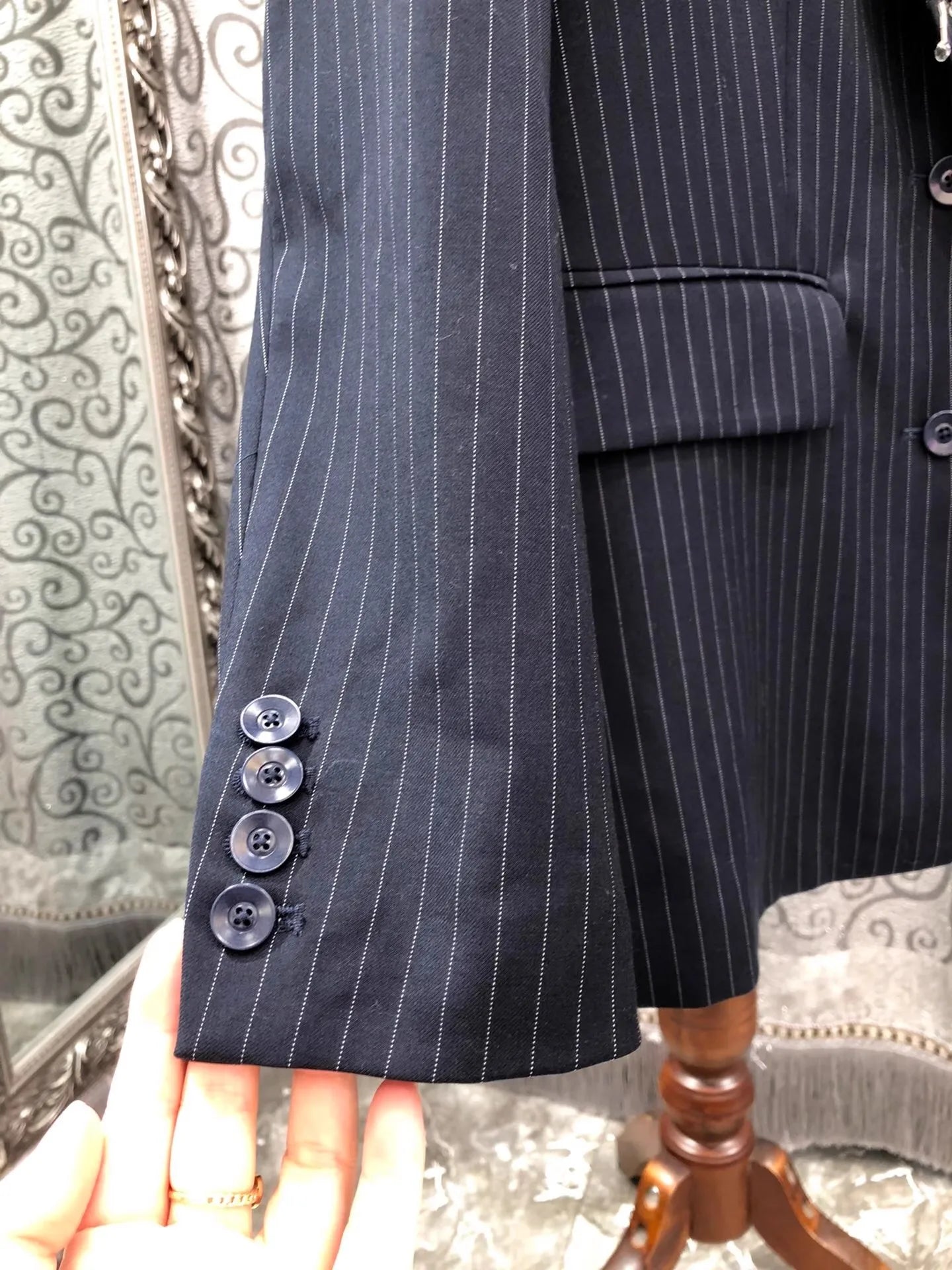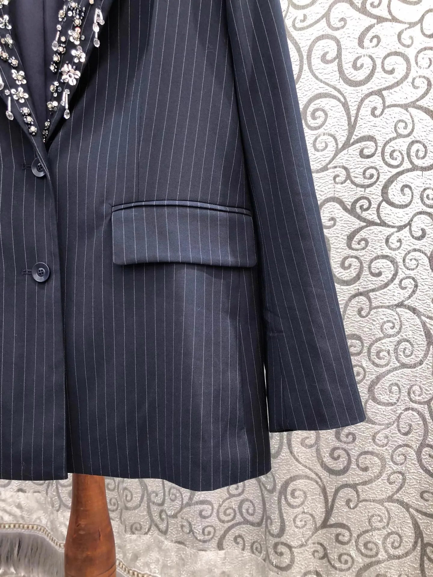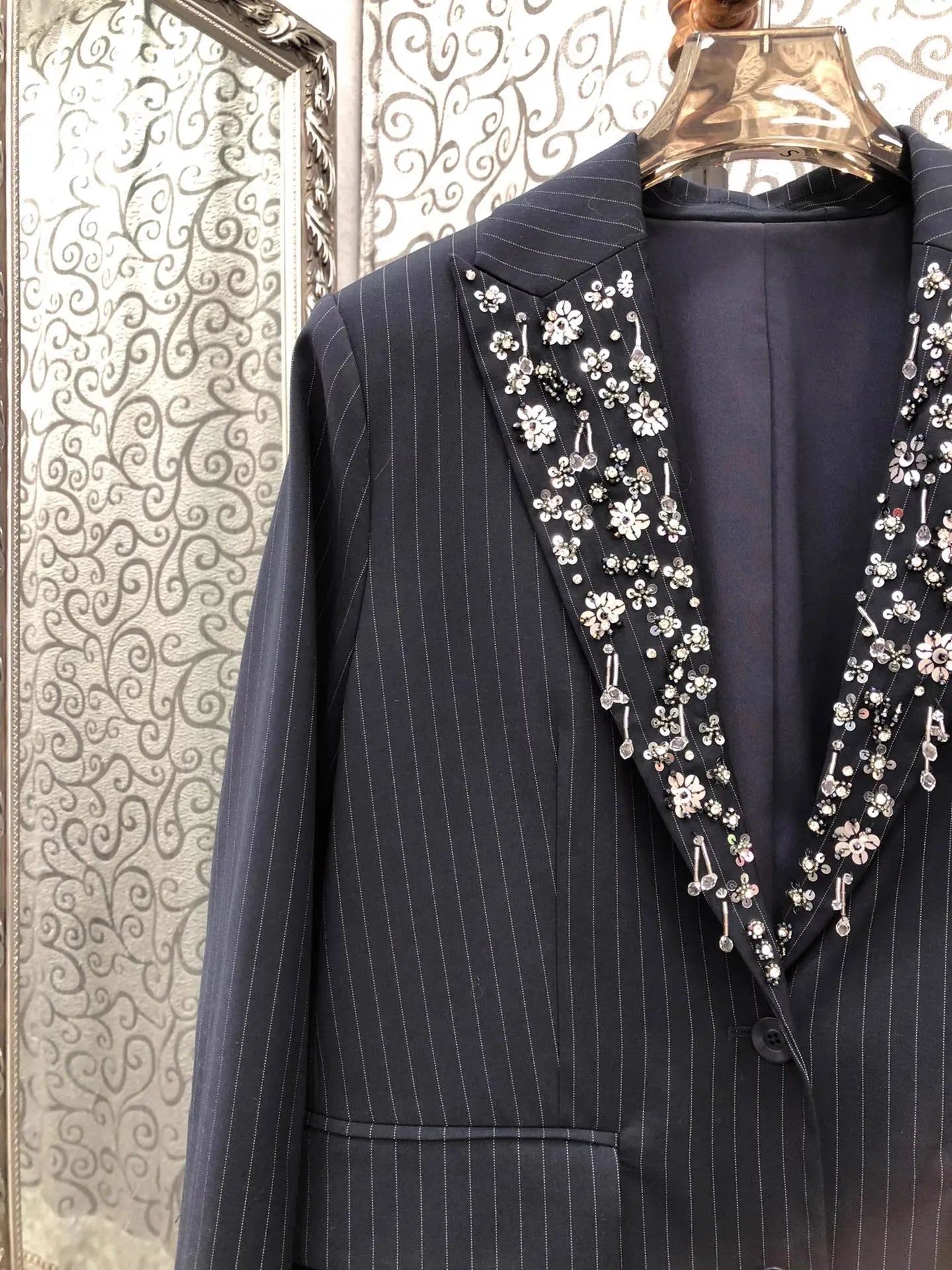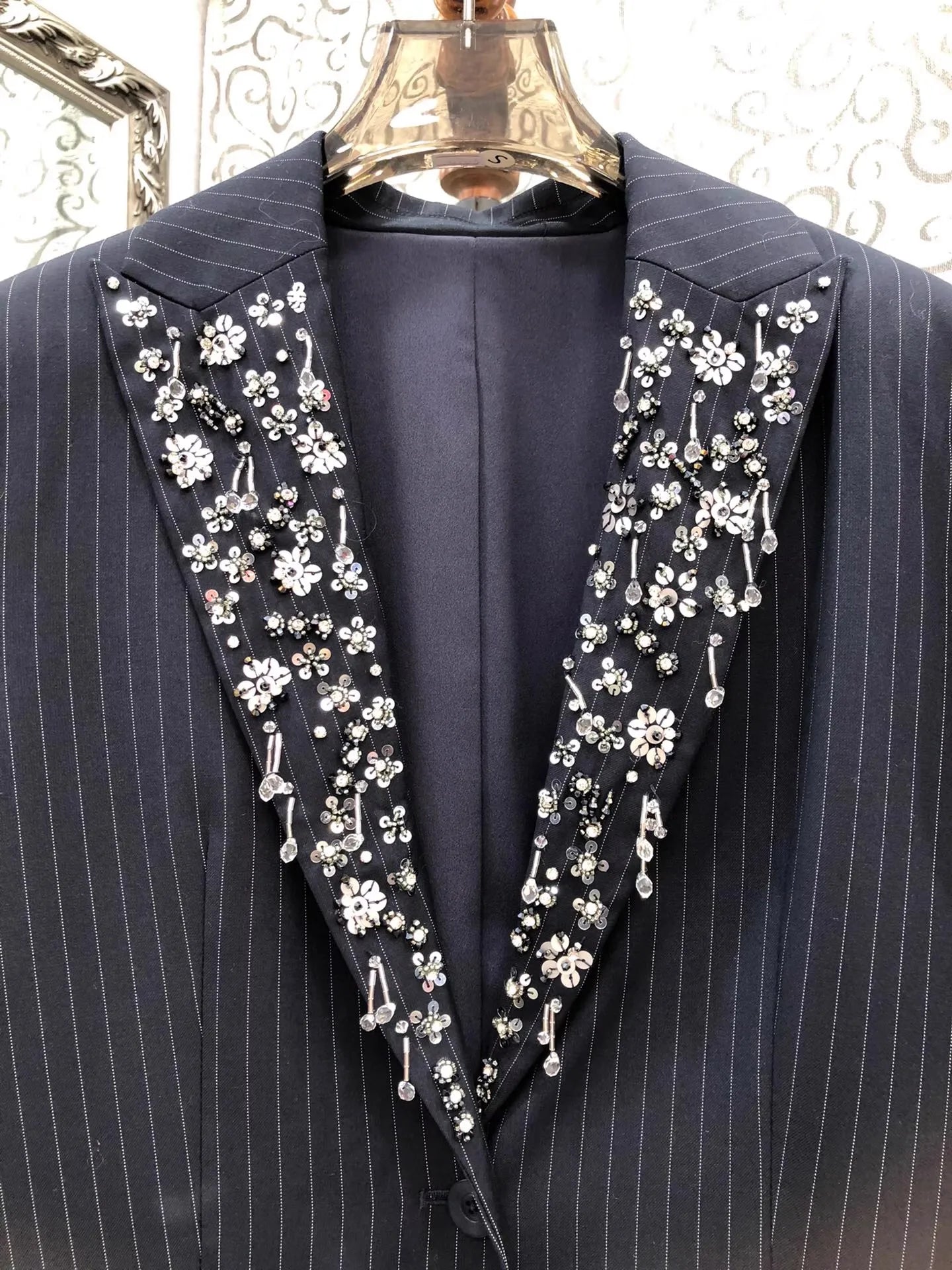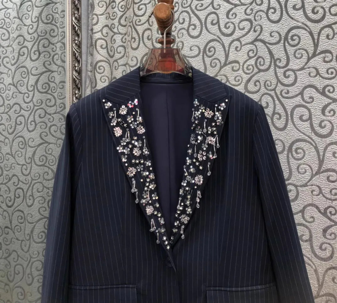 This blazer is a sharp, sophisticated piece designed to instantly elevate your professional or high-street wardrobe. Crafted from a comfortable woven polyester, rayon, and spandex blend, the fabric maintains a structured, anti-wrinkle finish in a versatile regular length. It features a classic notched collar and a streamlined single-breasted closure. The subtle striped pattern is beautifully enhanced with nail bead embroidery and delicate beading, lending a unique, textural focus to this timeless design.