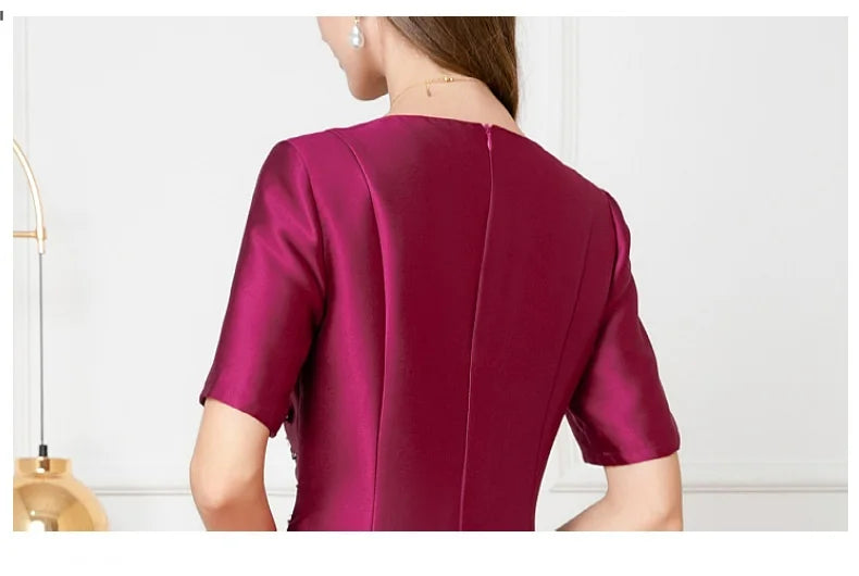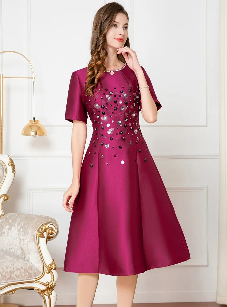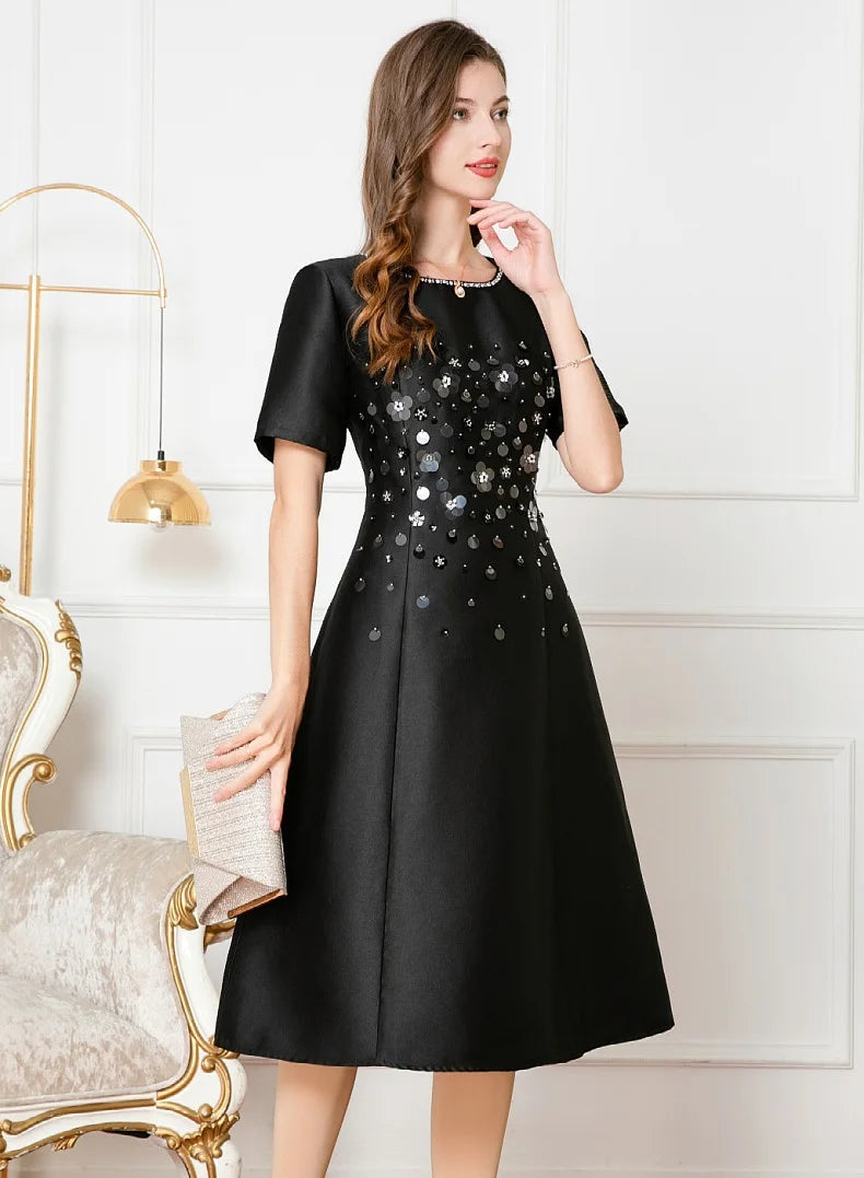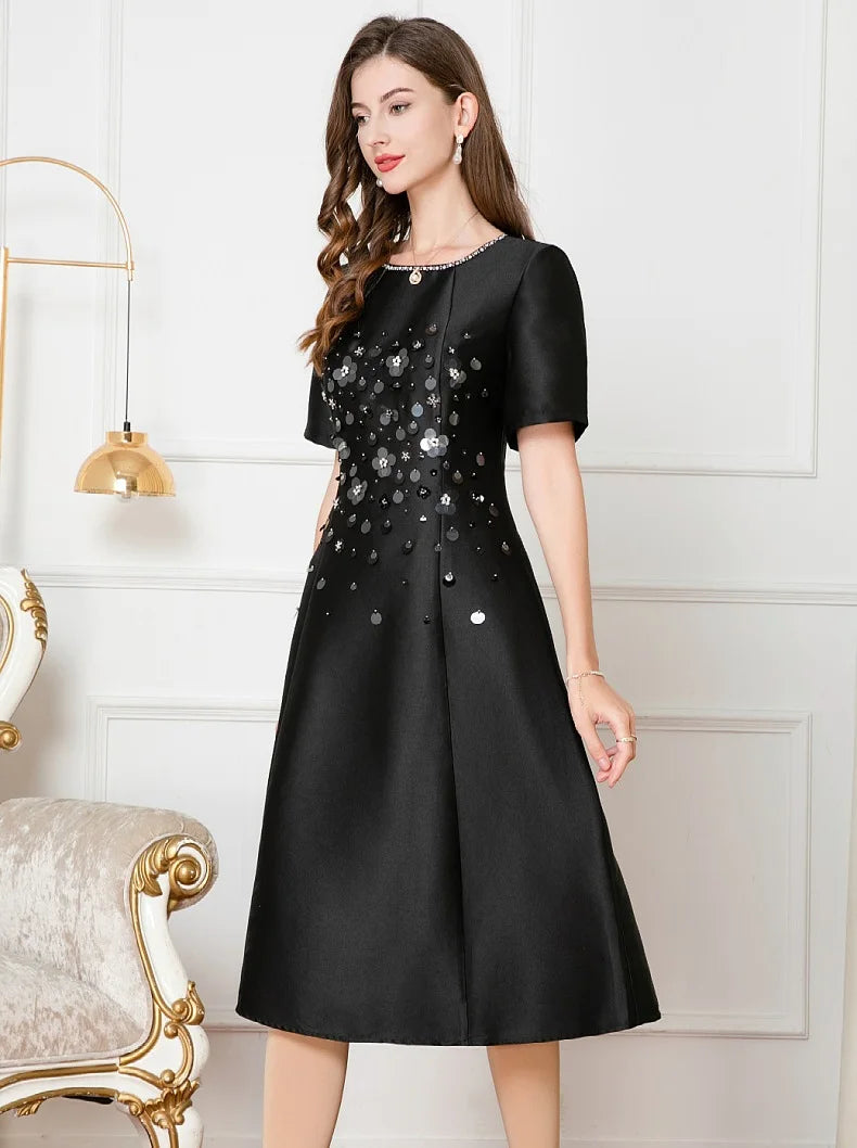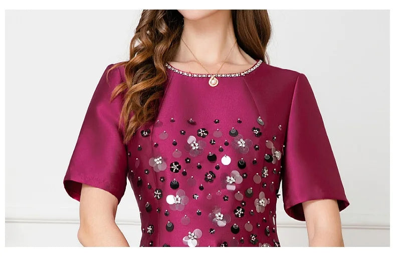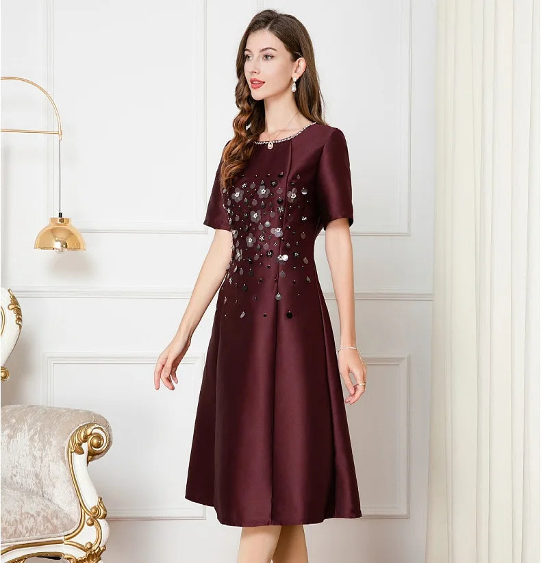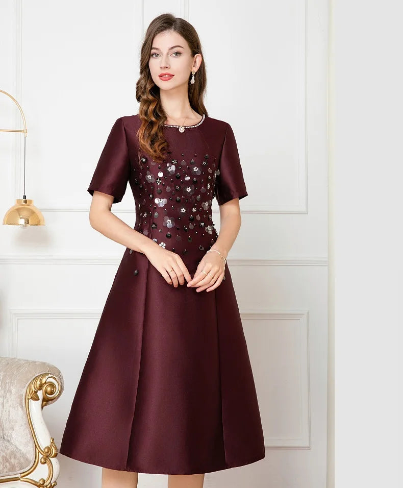 Dresses Length: Tea-Length | Silhouette: A-Line | Built-in Bra: NO | Style: Party | Weaving method: knitted | Logo/graphic design: embroidered | Fabric Type: cotton polyester | Technics: Beaded | Feature: anti-wrinkle, TRANSLUCENT | Sleeve Style: Regular | Waistline: Empire | Neckline: O-Neck | Fashion Element: Simple | Sleeve Length(cm): Short | Decoration: Beading | Pattern Type: Solid |