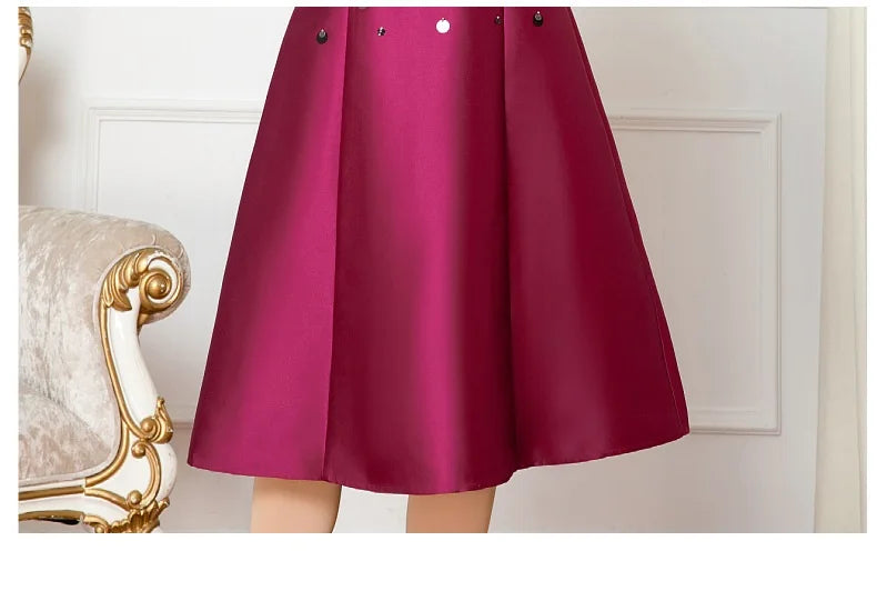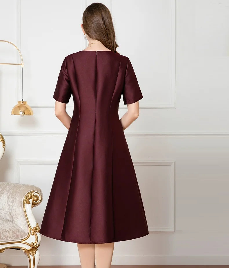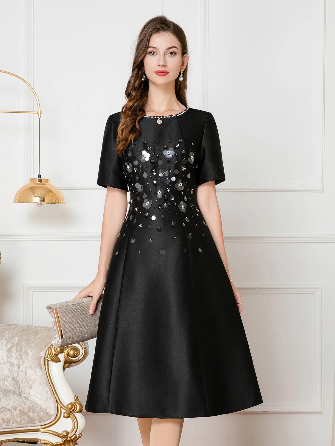 Gracefully feminine with a modern twist, this tea-length dress features an A-line silhouette and delicate beaded details that subtly catch the light. The O-neck and empire waist create a timeless shape that flatters effortlessly—perfect for elegant gatherings where simplicity speaks volumes.