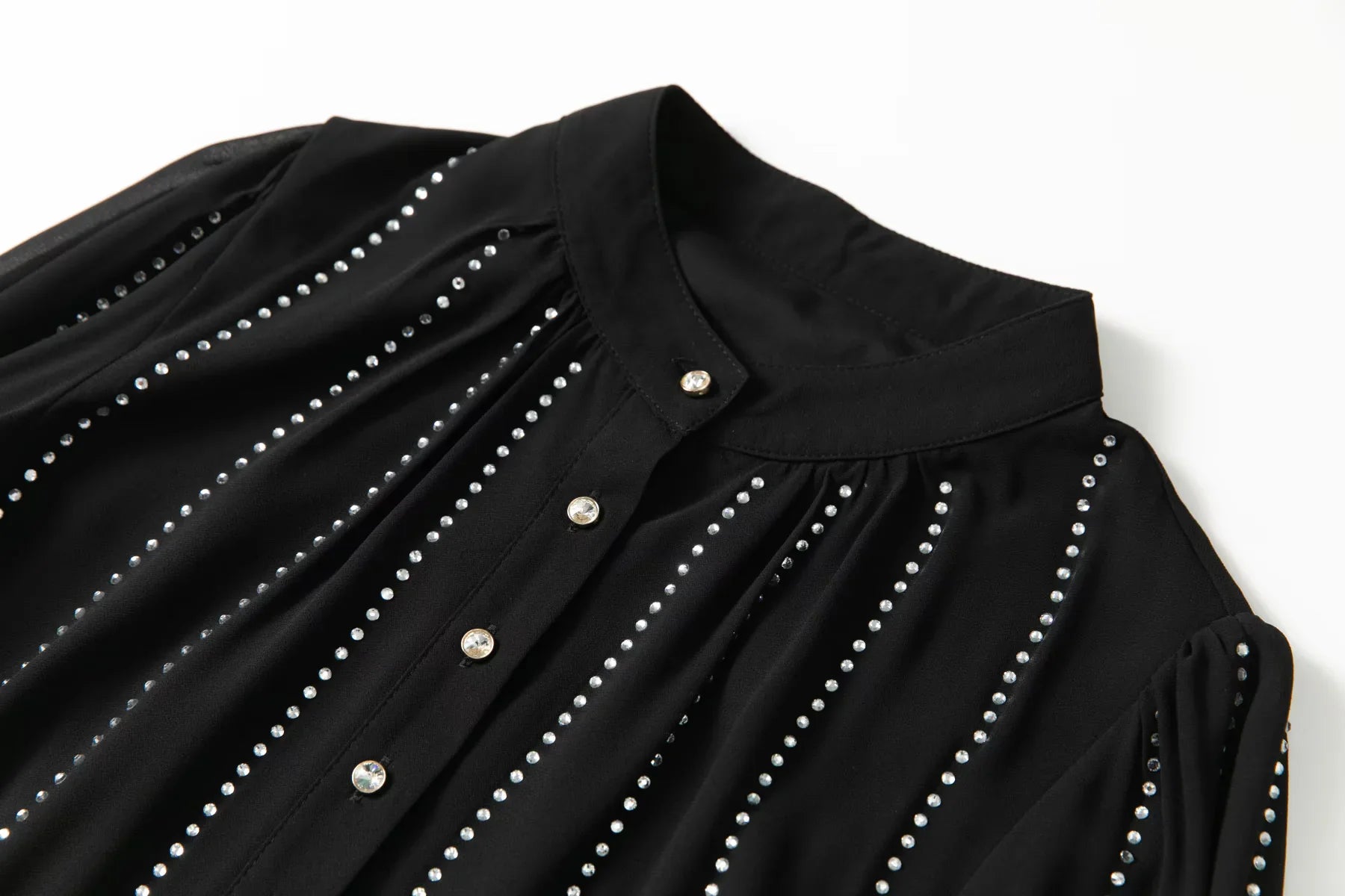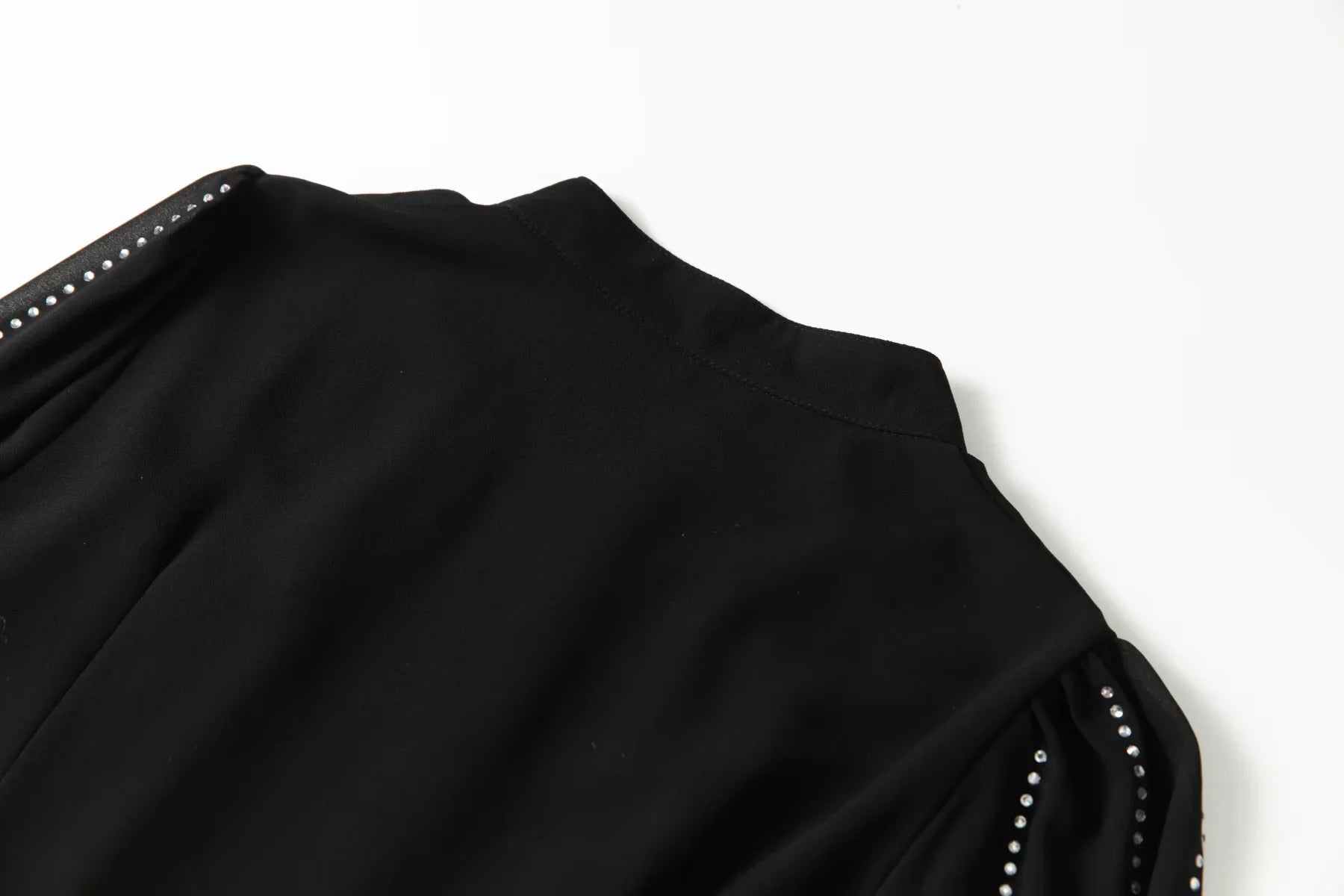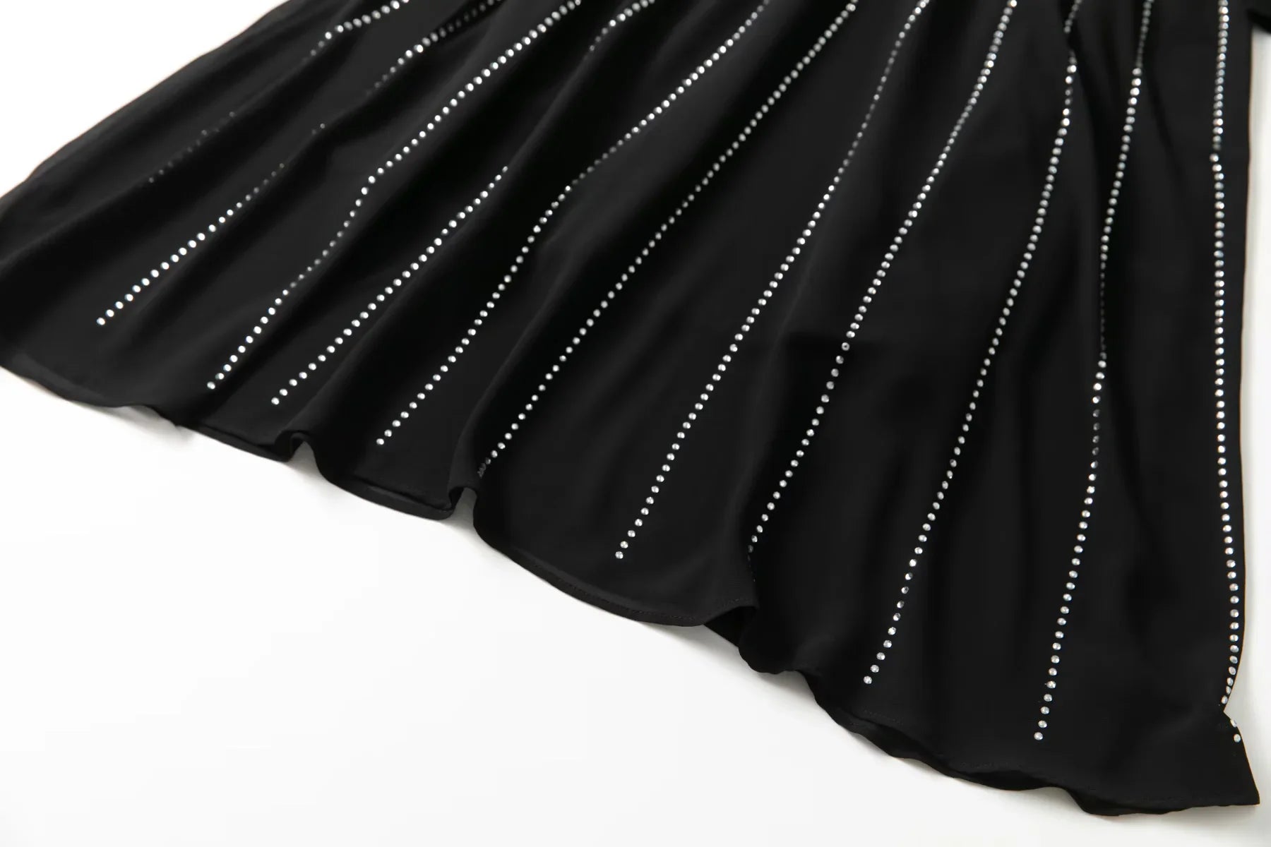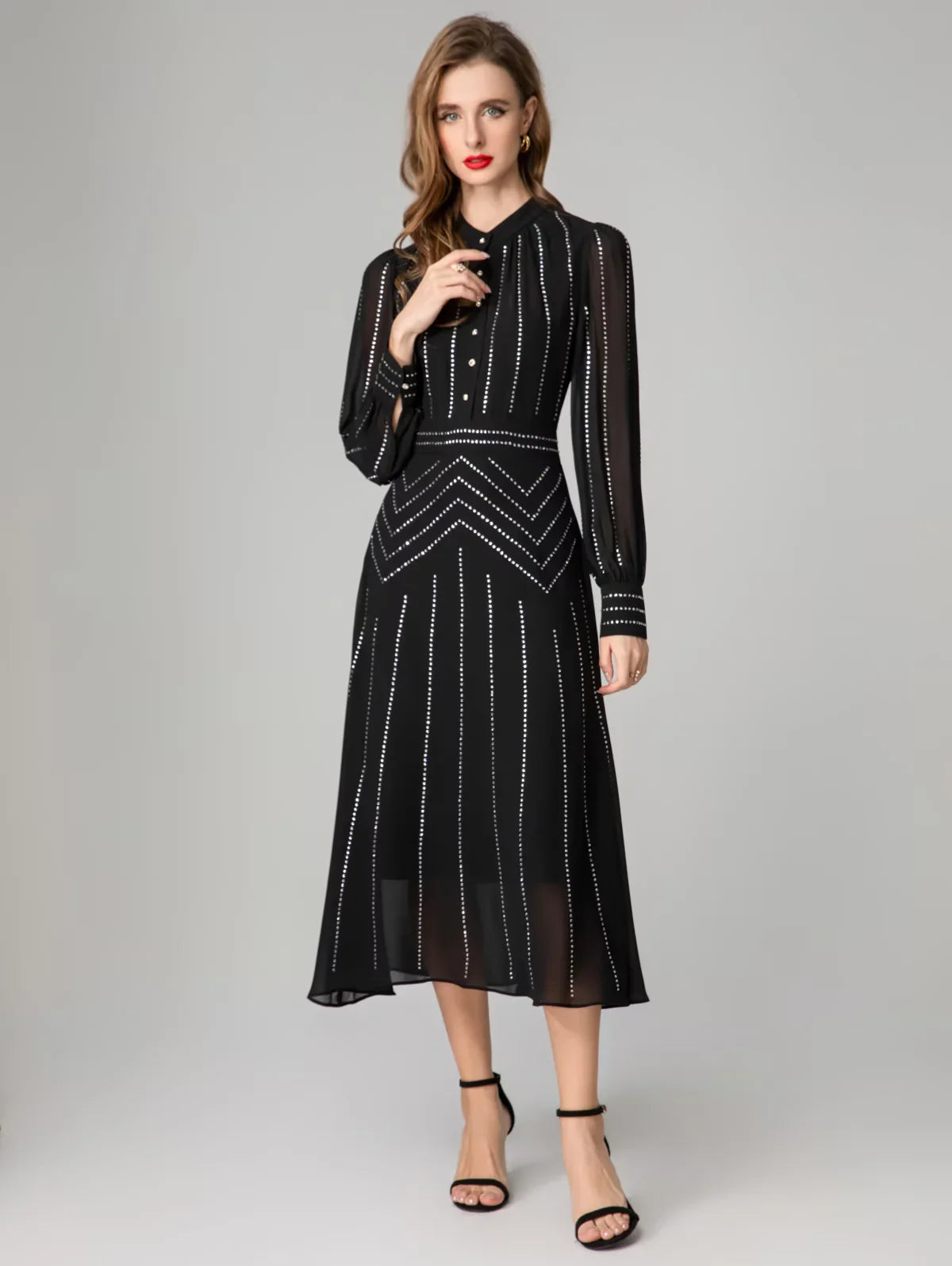 A sophisticated piece for the autumn social season, this midi-length dress offers a polished, structured fit. The A-line silhouette is expertly cut from woven polyester, maintaining an anti-wrinkle finish. It features a sharp stand collar and elegant full-length sleeves, while the striped pattern is beautifully accented with luxurious beading, creating a refined and versatile focal point.