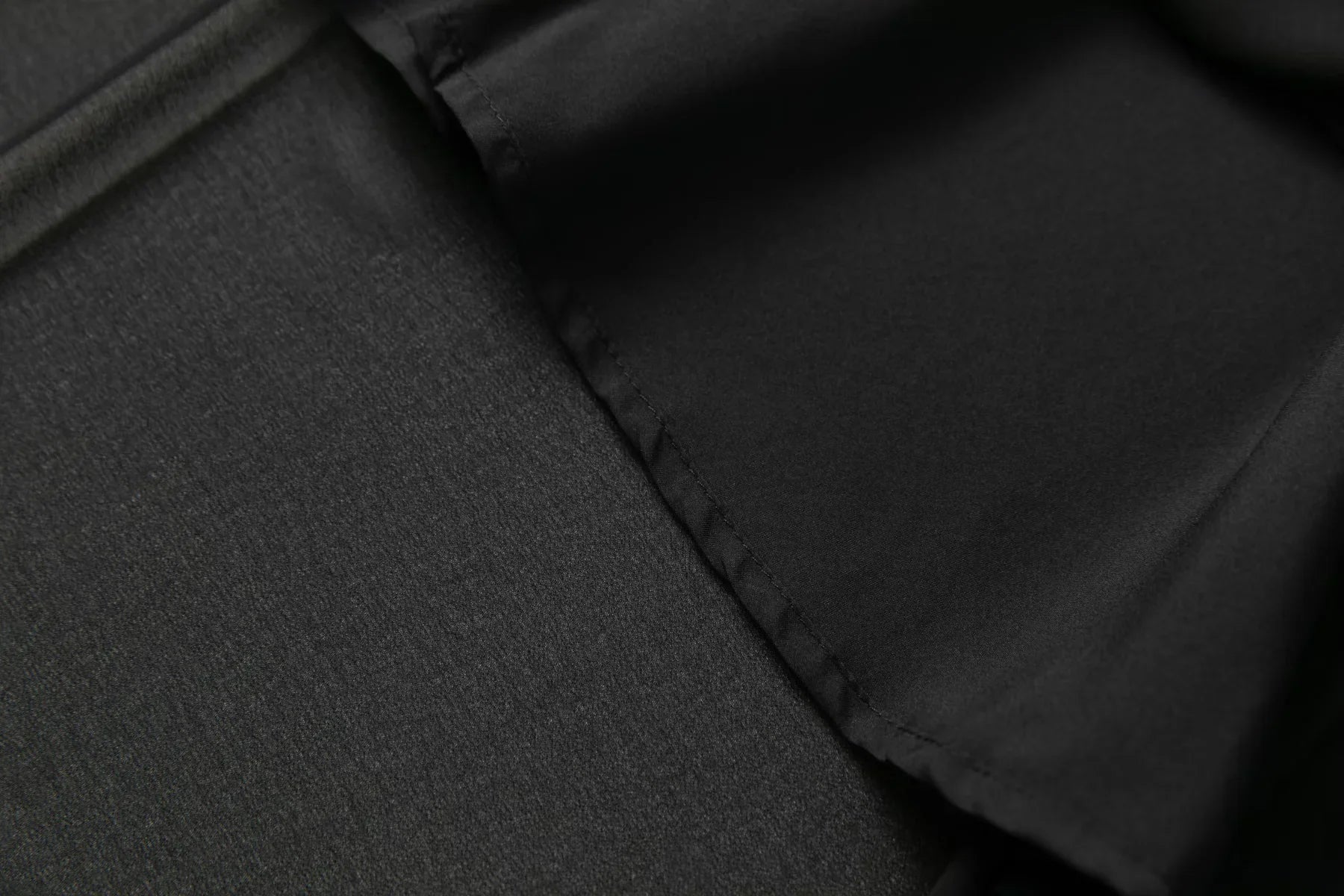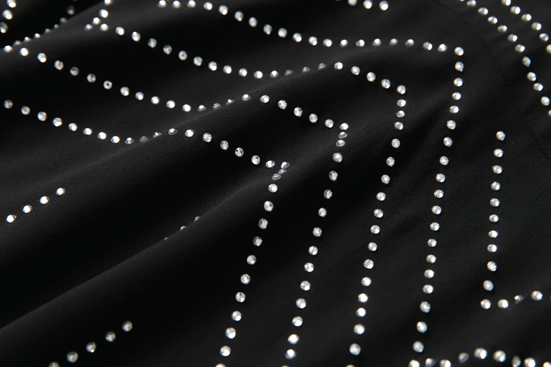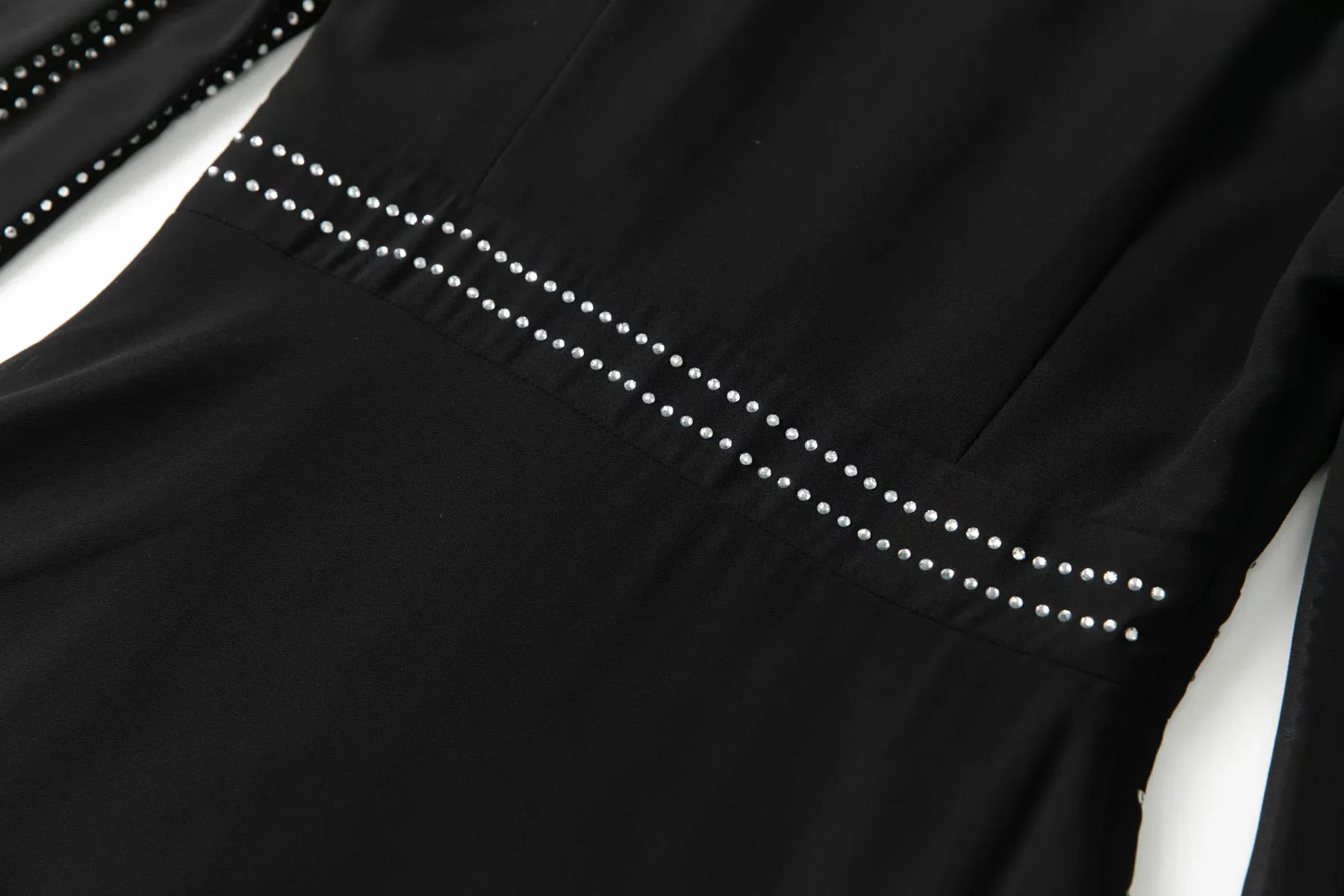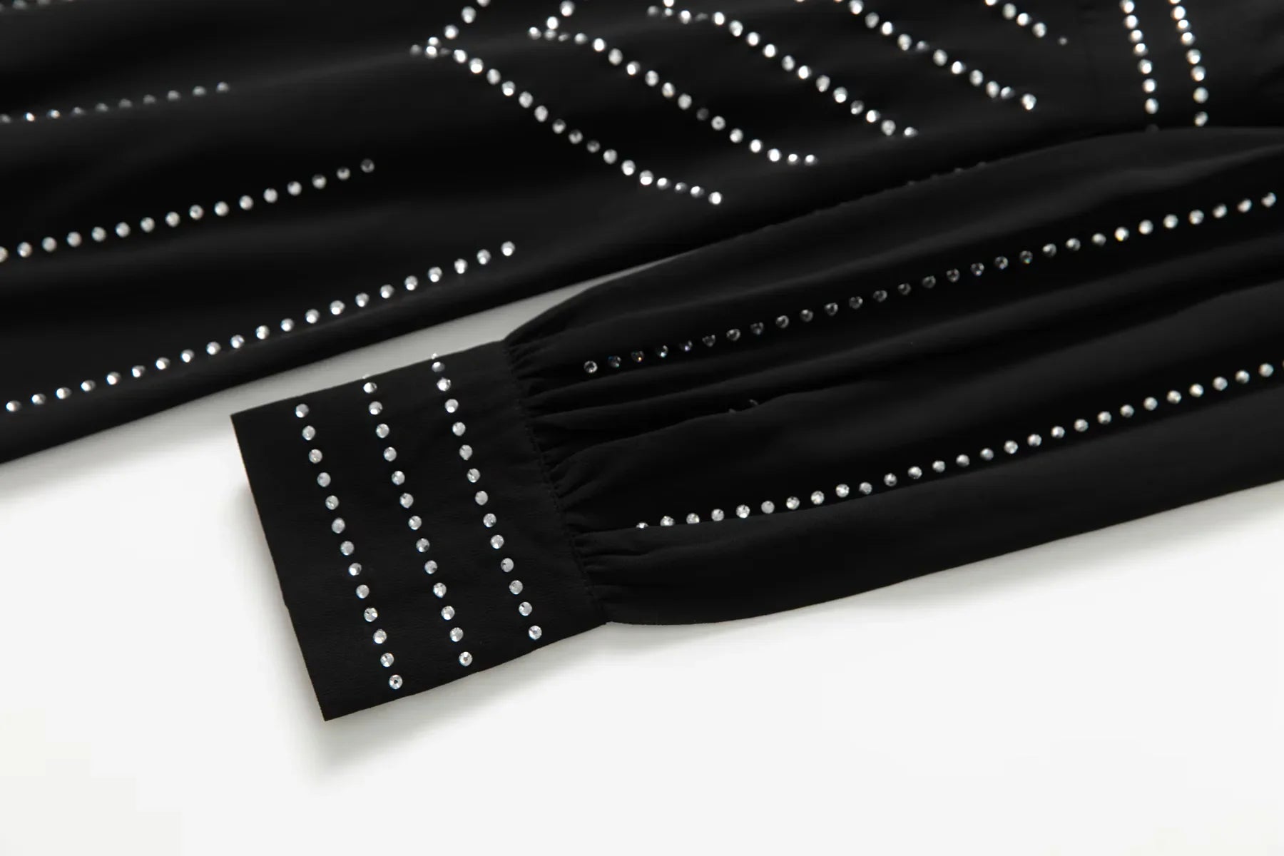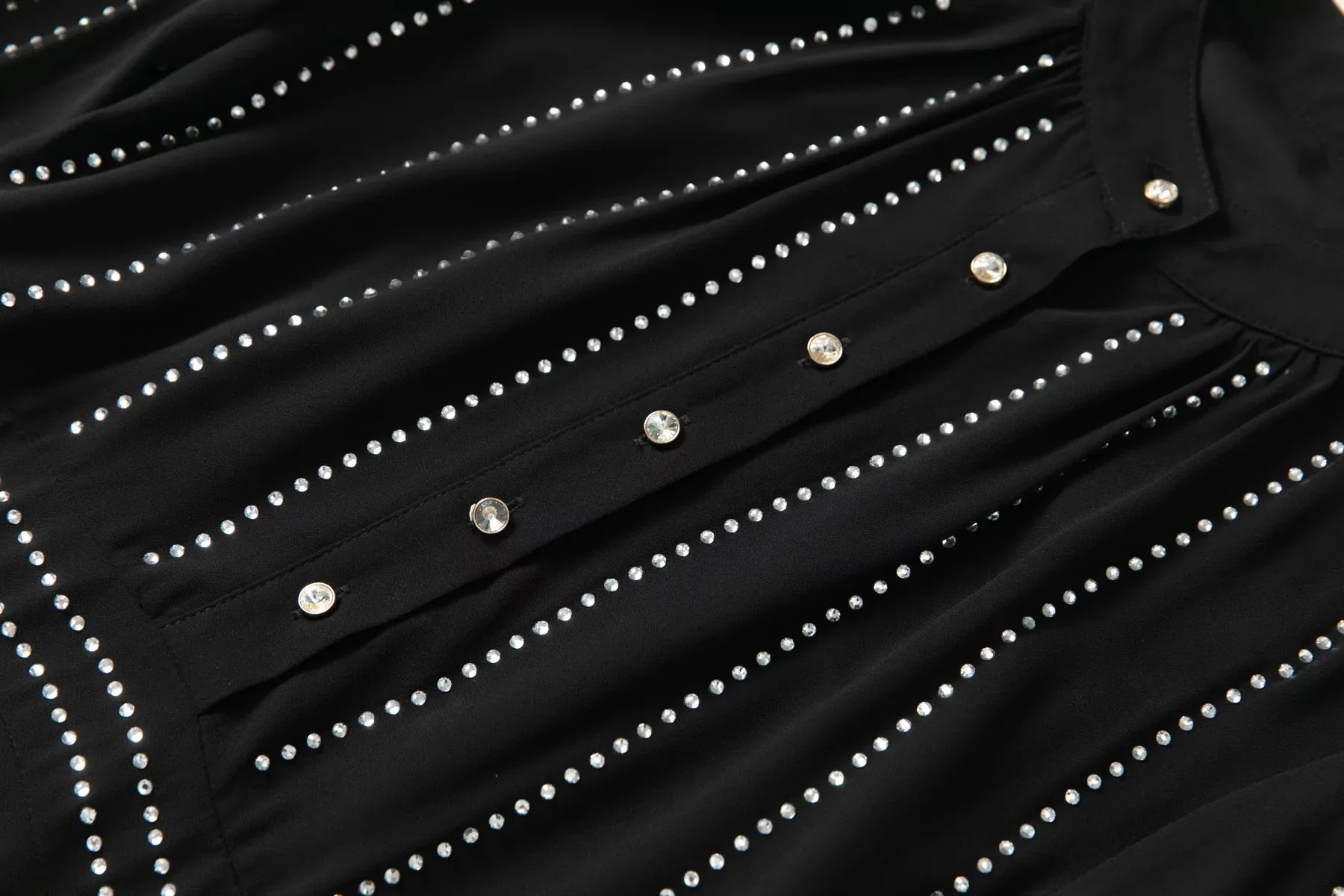 A sophisticated piece for the autumn social season, this midi-length dress offers a polished, structured fit. The A-line silhouette is expertly cut from woven polyester, maintaining an anti-wrinkle finish. It features a sharp stand collar and elegant full-length sleeves, while the striped pattern is beautifully accented with luxurious beading, creating a refined and versatile focal point.
