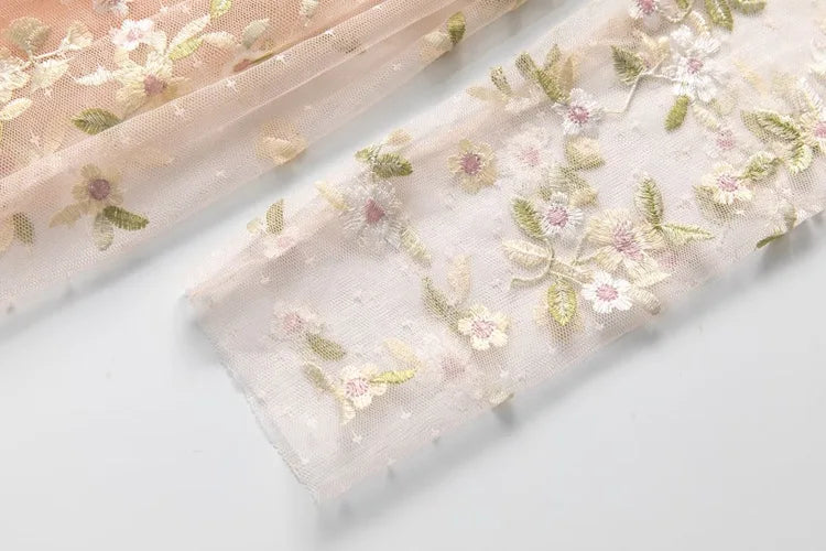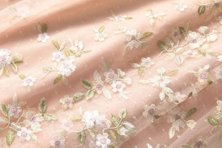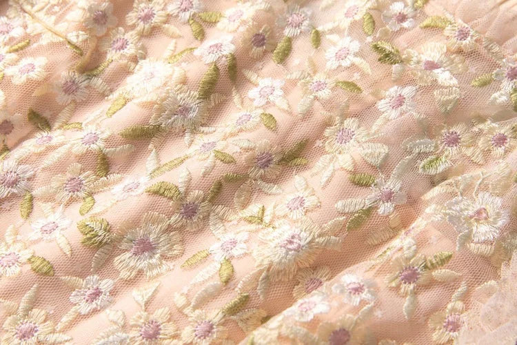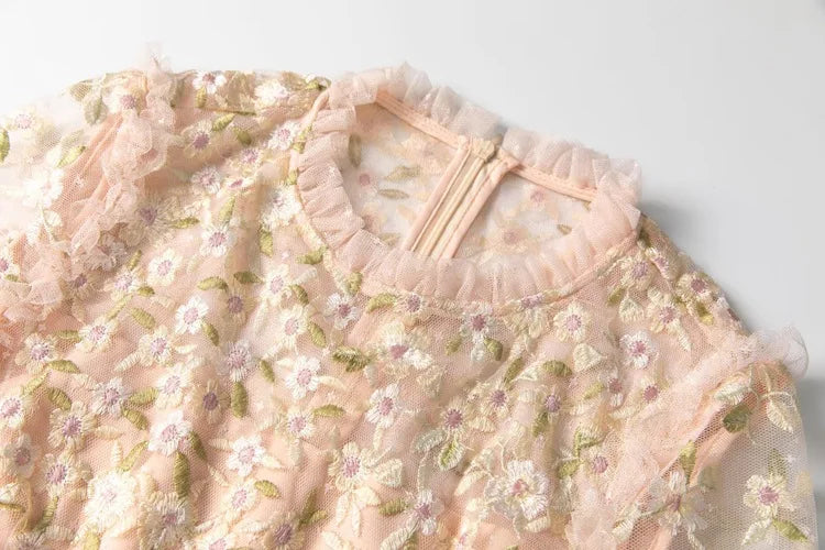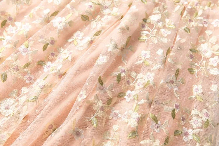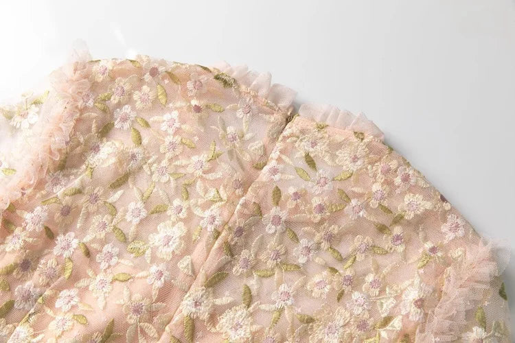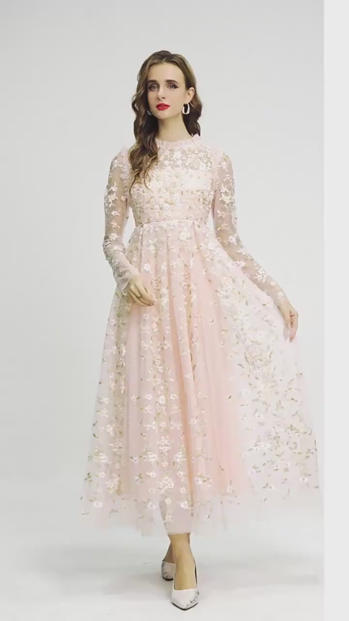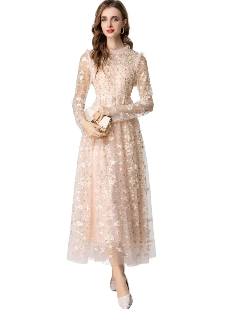A truly romantic choice for autumn parties, this maxi-length dress delivers beautiful movement and vintage texture. Crafted from washable embroidered organza with a soft lining, the knitted polyester and cotton blend ensures a comfortable, anti-wrinkle drape in an elegant A-line silhouette. It features a soft ruffled neckline and graceful full-length sleeves, while rich embroidery enhances the floral pattern, lending a sumptuous, ethereal focus to this memorable look.