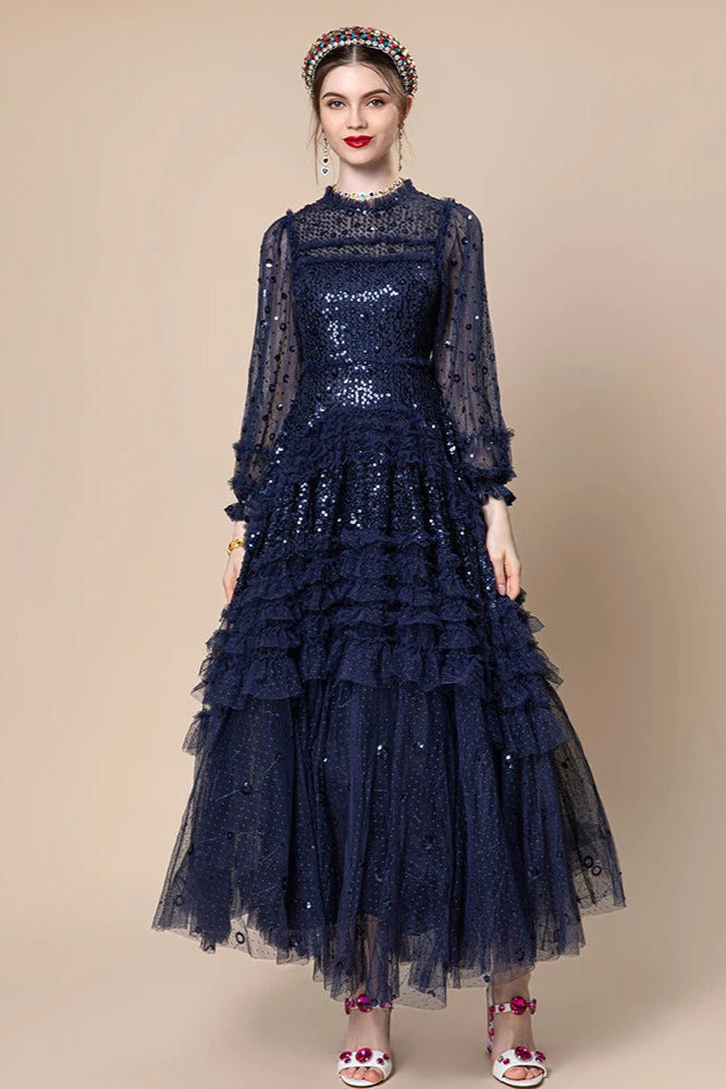 Bauble’s ‘Amaranth’ dress is a showstopper designed to captivate from every angle. It features a classic round neckline and long sheer mesh sleeves that add a touch of intrigue. The bodice is richly adorned with dramatic lace and sequin detailing, creating texture and depth, while the ruffled, tiered skirt brings graceful volume and movement. Perfect for evening affairs where bold elegance takes center stage.
