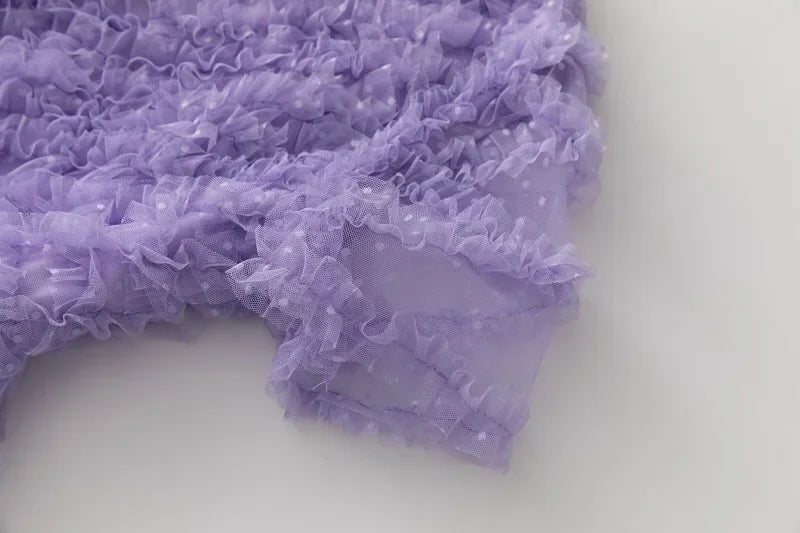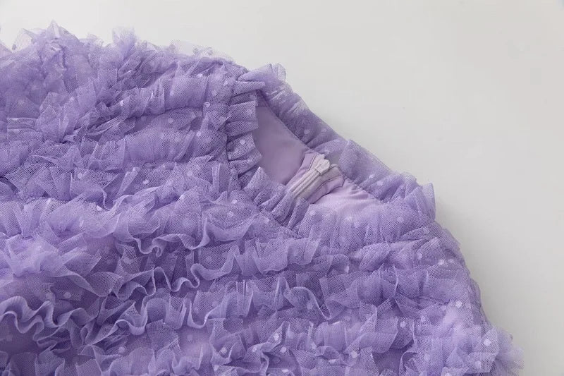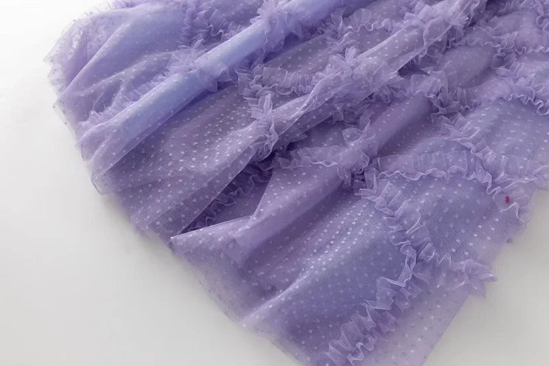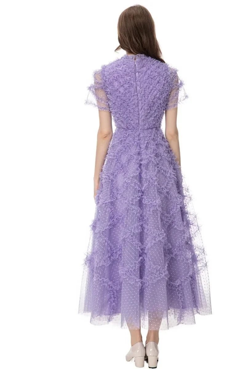 Ready to wear for the warmer months, this maxi-length dress beautifully merges a dramatic silhouette with a sweet, vintage feel. The airy woven polyester fabric features a playful dot pattern and falls into a flattering A-line shape that is both breathable and anti-wrinkle. Framed by a romantic ruffled neckline and delicate short sleeves, this piece easily adapts its style for a high-street look or a sophisticated party.