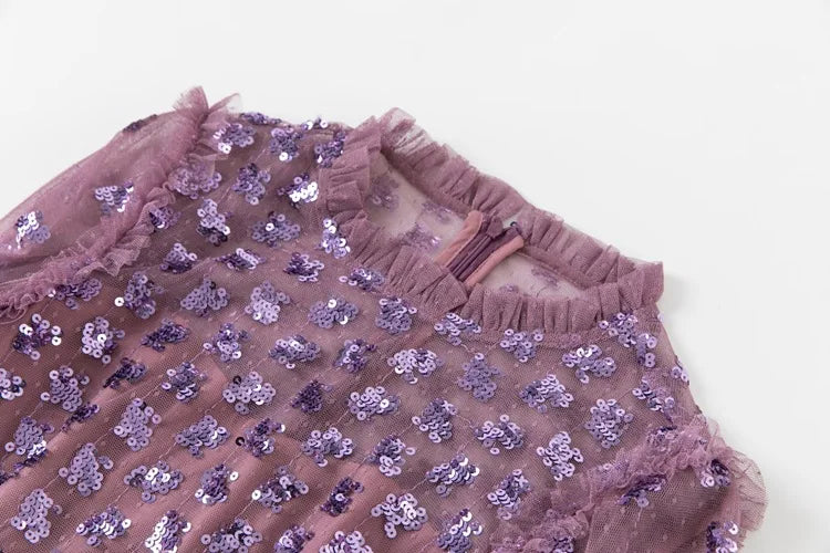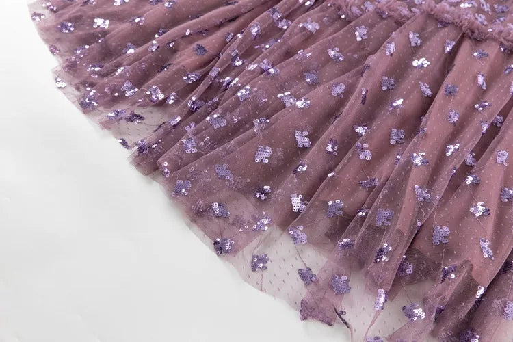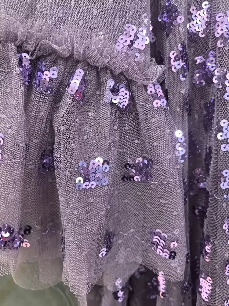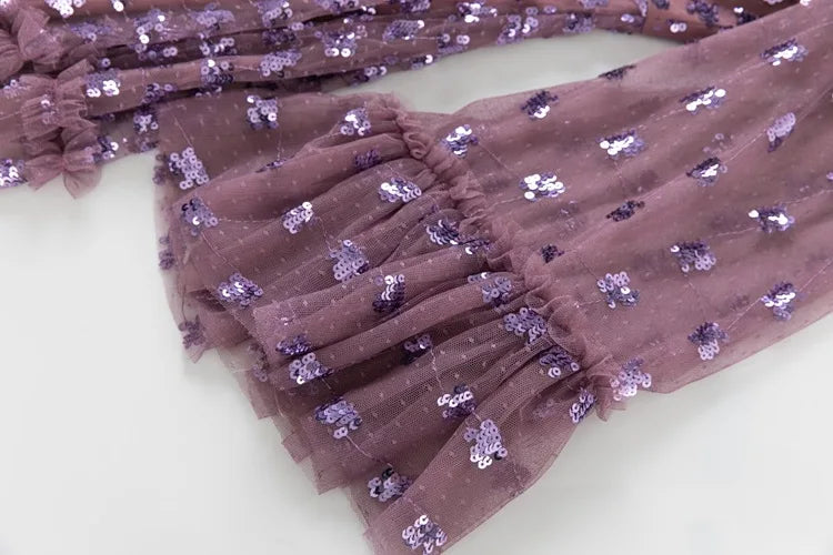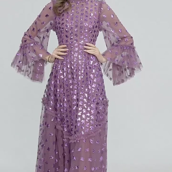 This gown captures a sense of timeless romance through its sheer overlay adorned with intricate embroidery. The delicate fluted sleeves and softly structured A-line silhouette create graceful movement, while the fitted bodice highlights the waist. Designed for refined occasions, it blends classic detailing with a modern, ethereal finish that flatters from every angle.