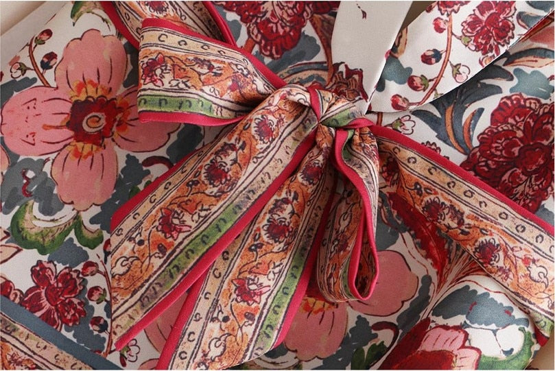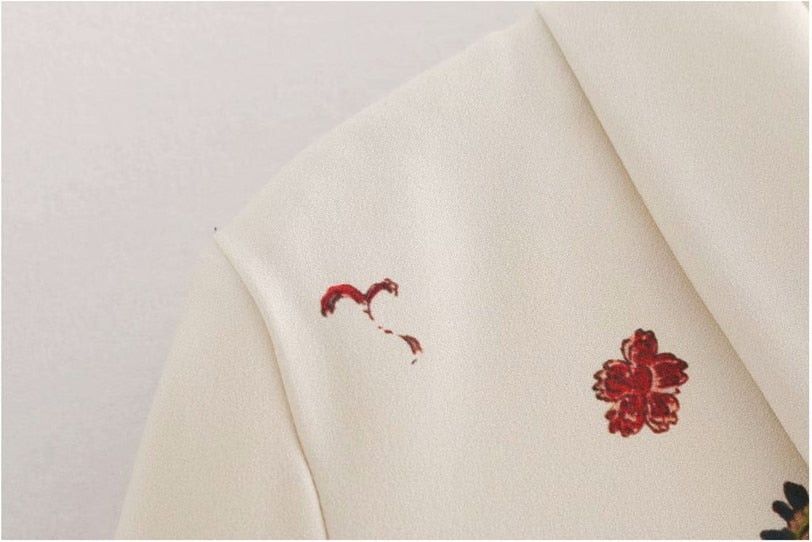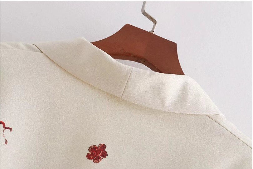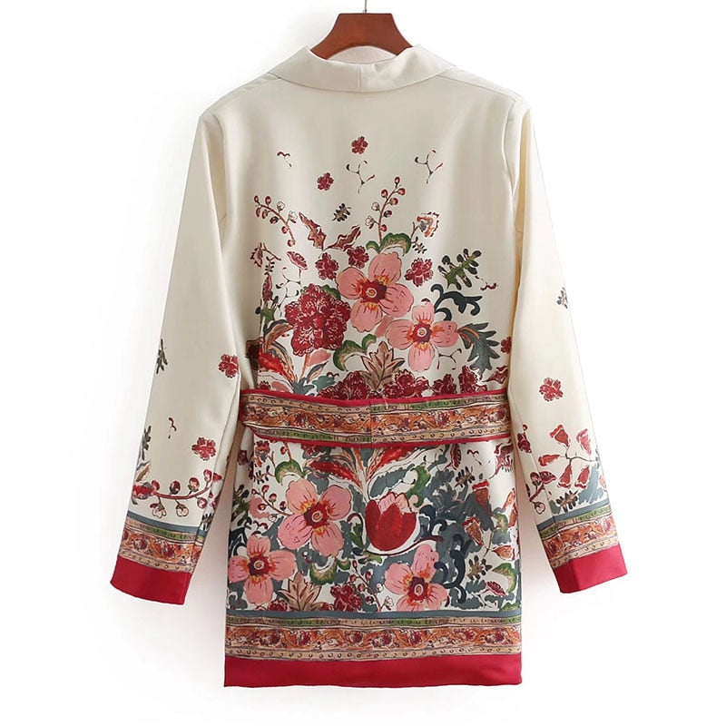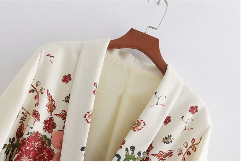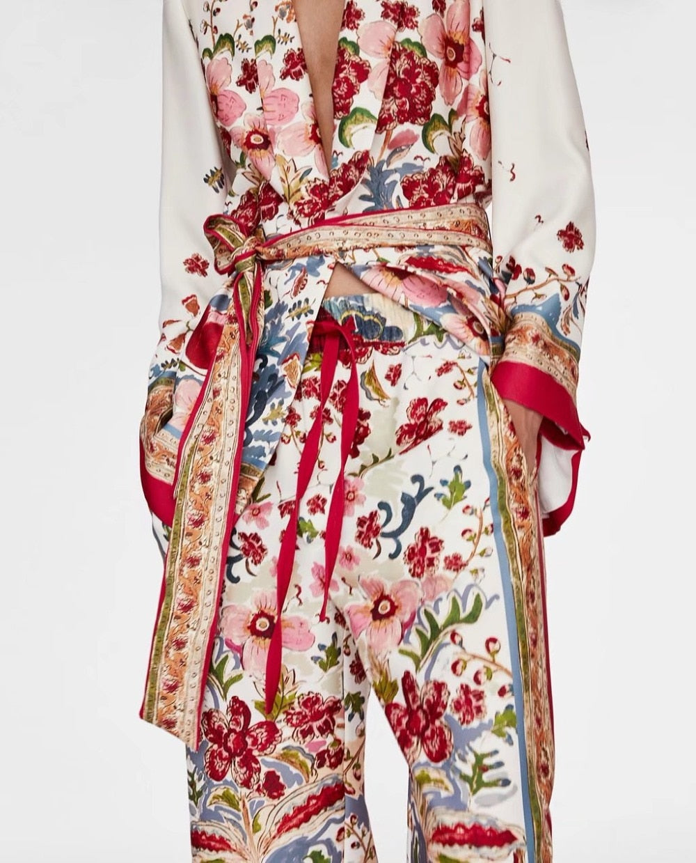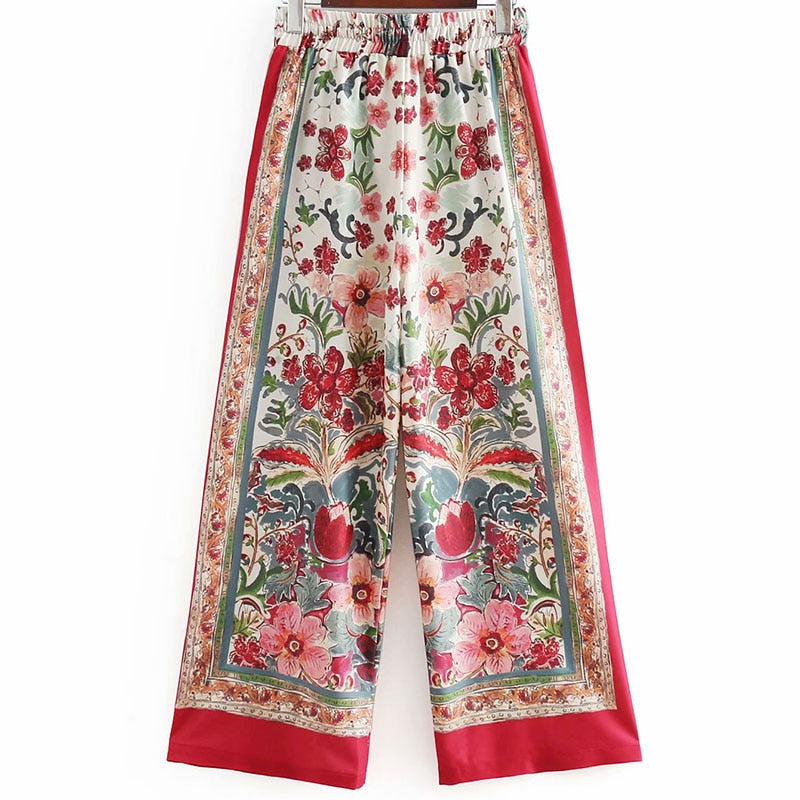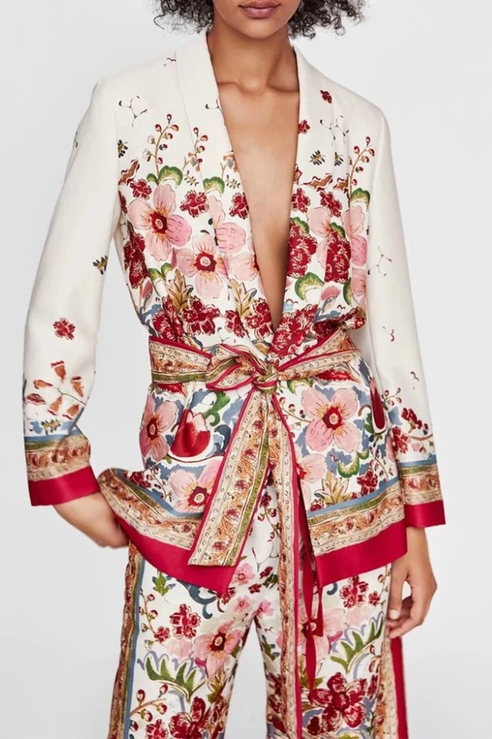 The Micaela set is a fashionable outfit that combines a vintage aesthetic with a contemporary twist. The set features a jacket and pants adorned with a bold, colorful floral print that evokes the style of the 1960s and 70s. The overall effect is a fun and playful outfit that is perfect for adding some retro charm to any wardrobe.