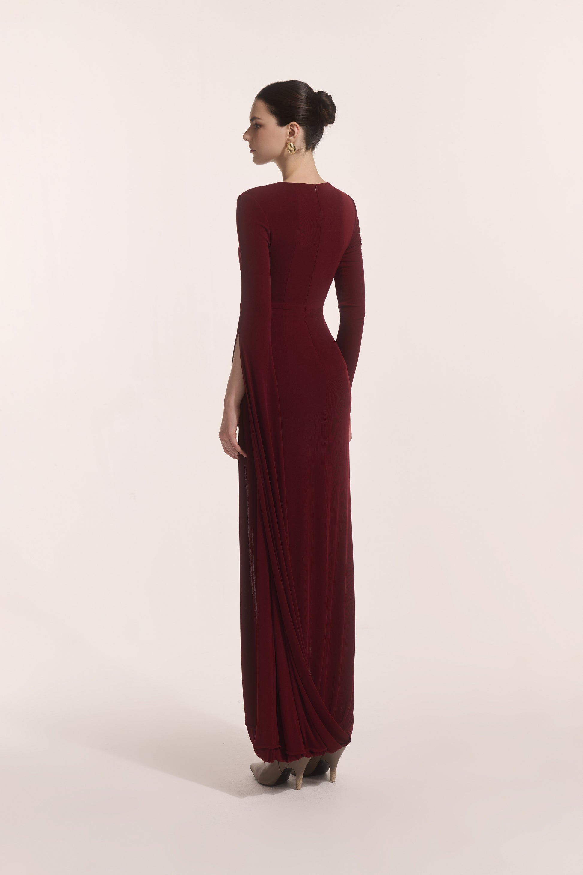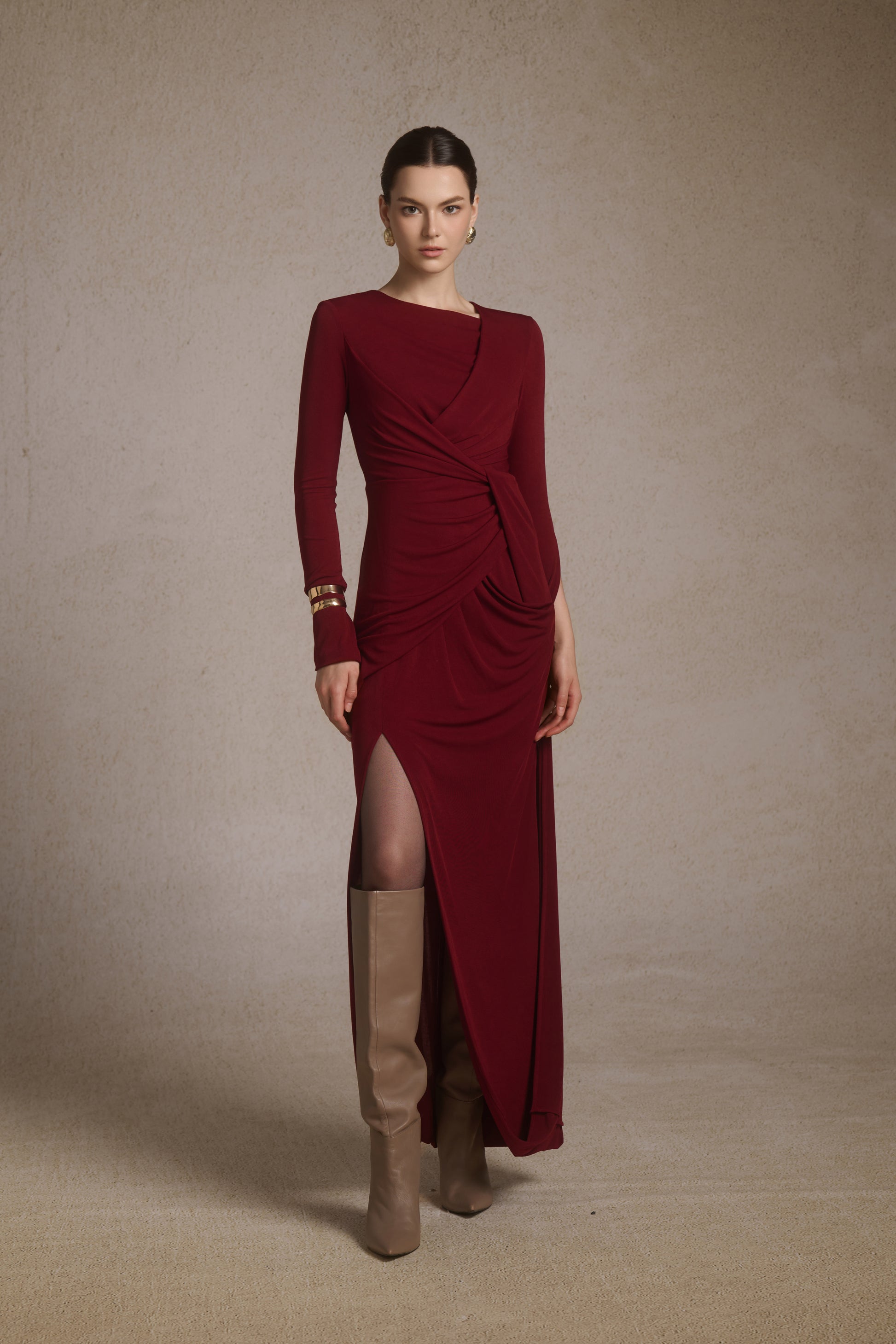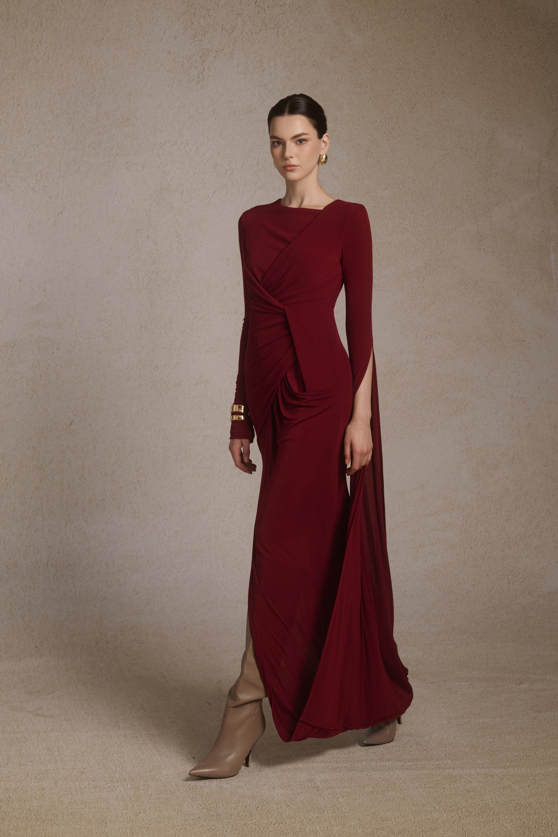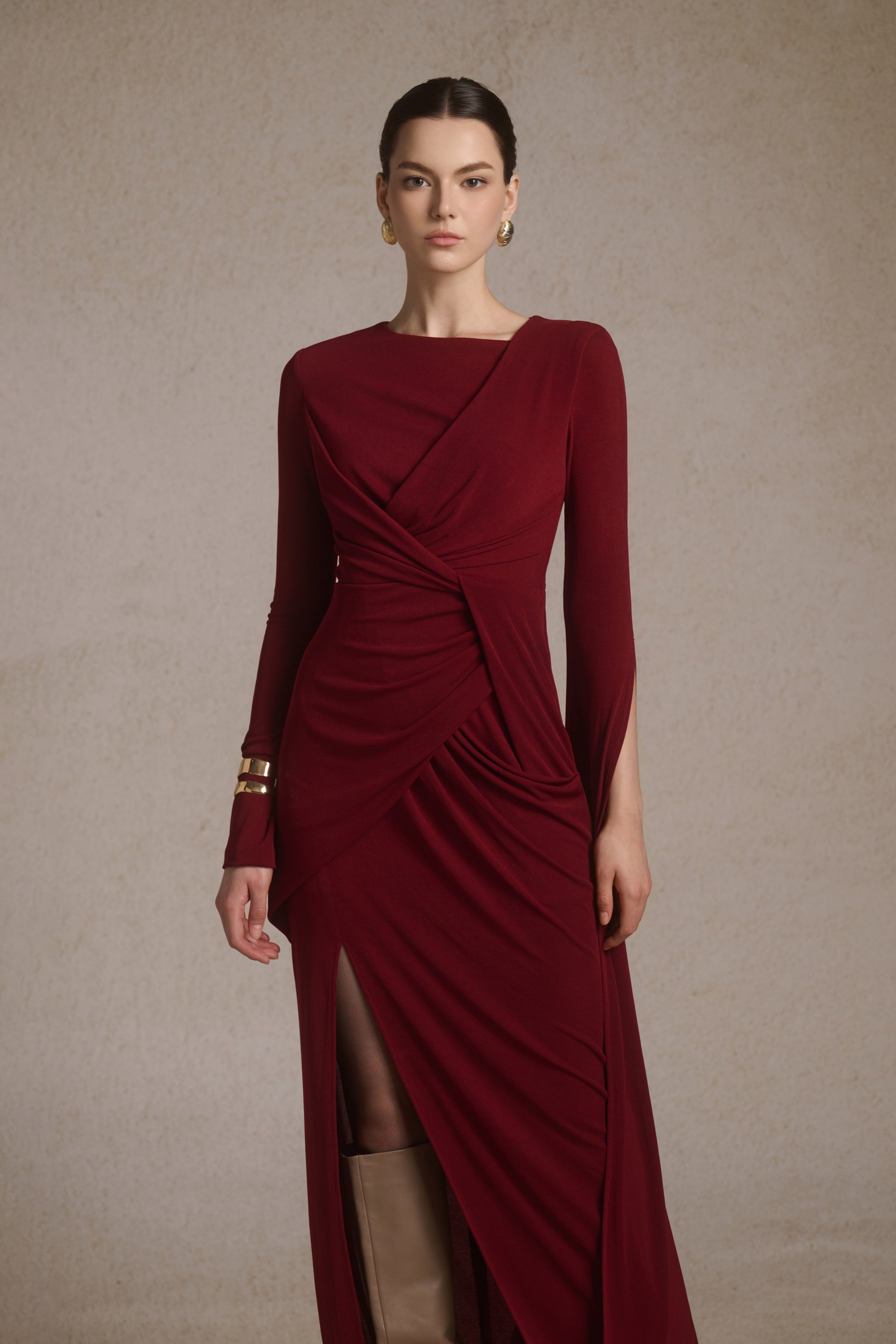 Asymmetrically pleated midi dress with layered hip and extended side-sleeve panel.