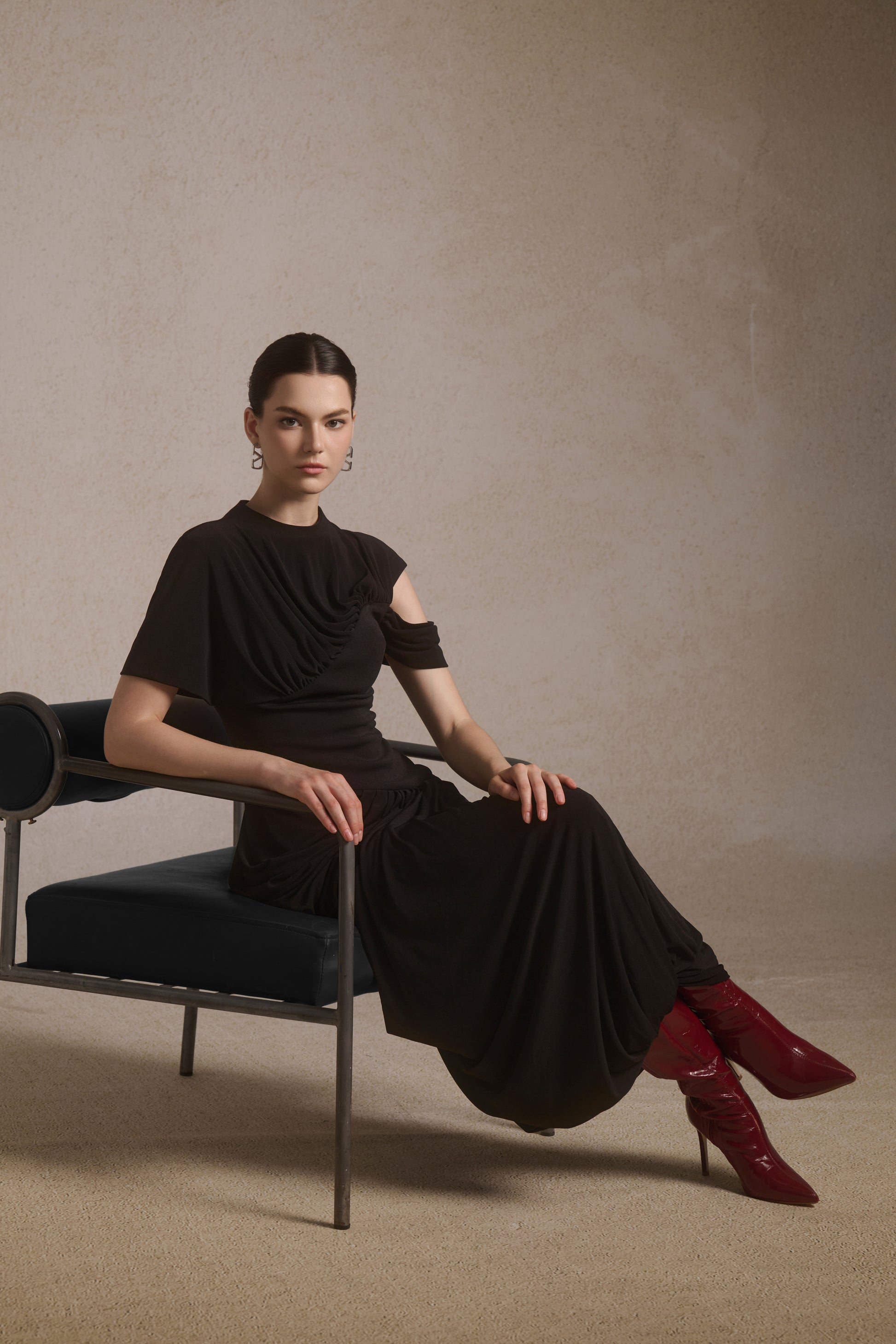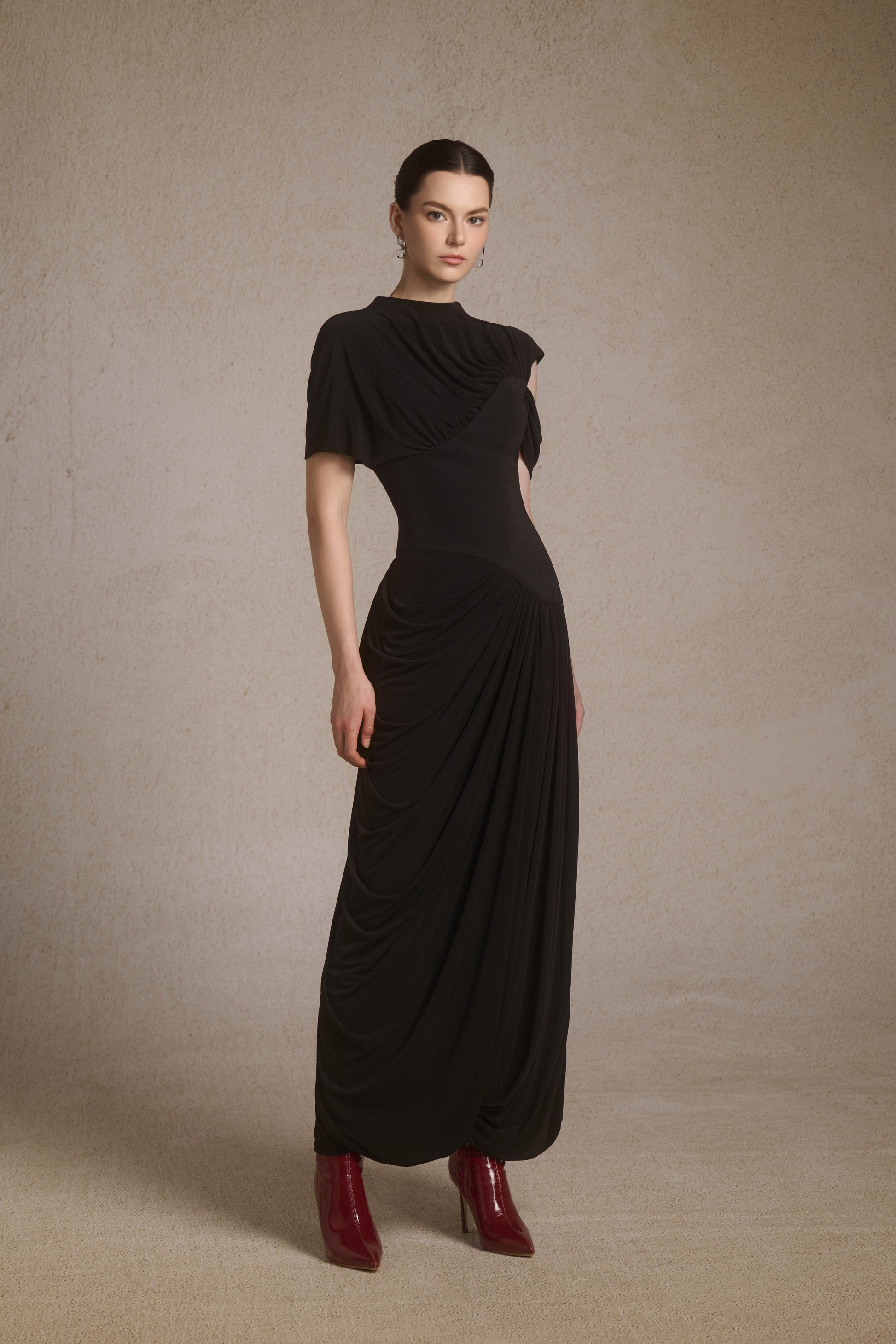 One-shoulder midi dress with draped bodice, corset waist, and fluid asymmetric skirt.