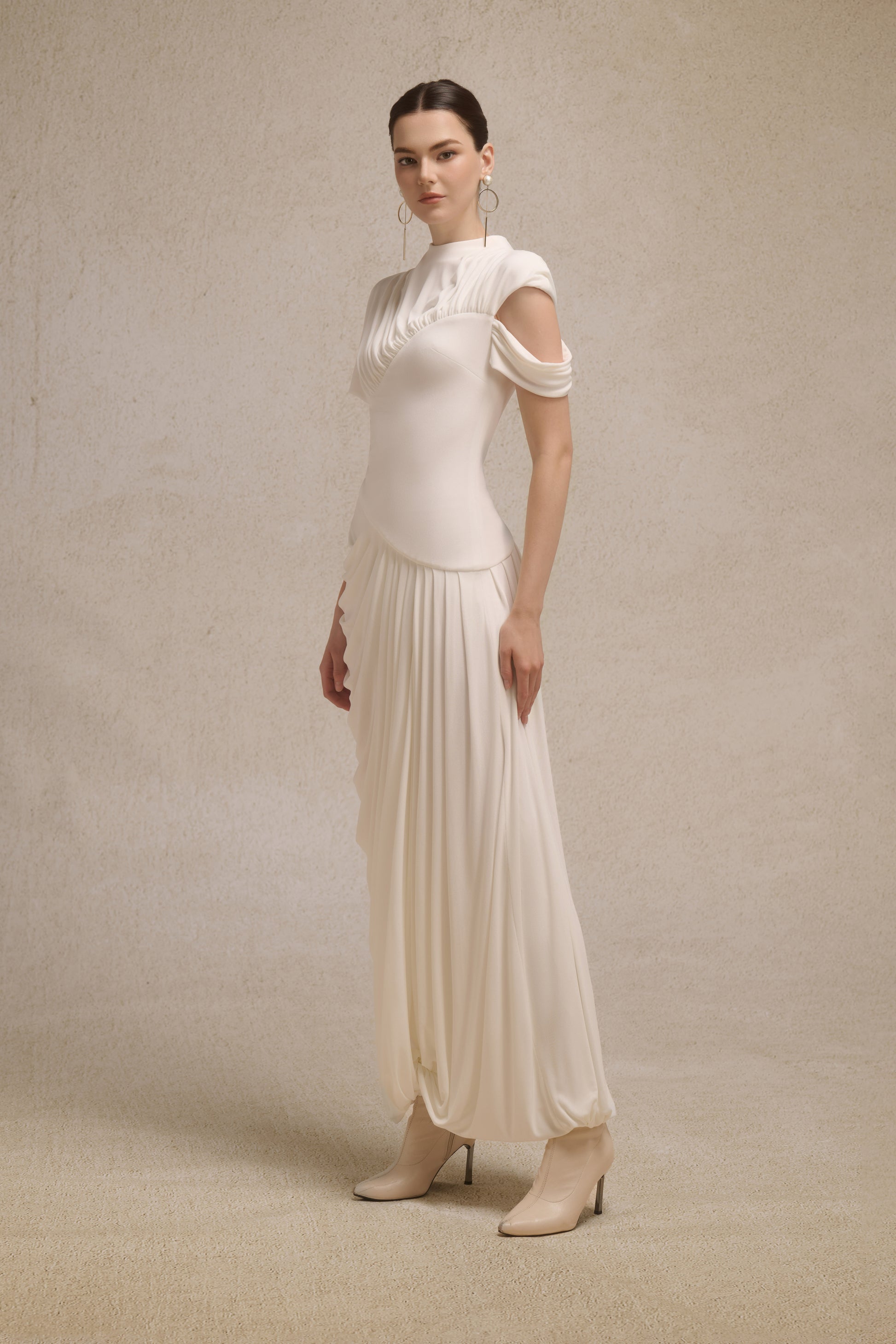 One-shoulder midi dress with draped bodice, corset waist, and fluid asymmetric skirt.