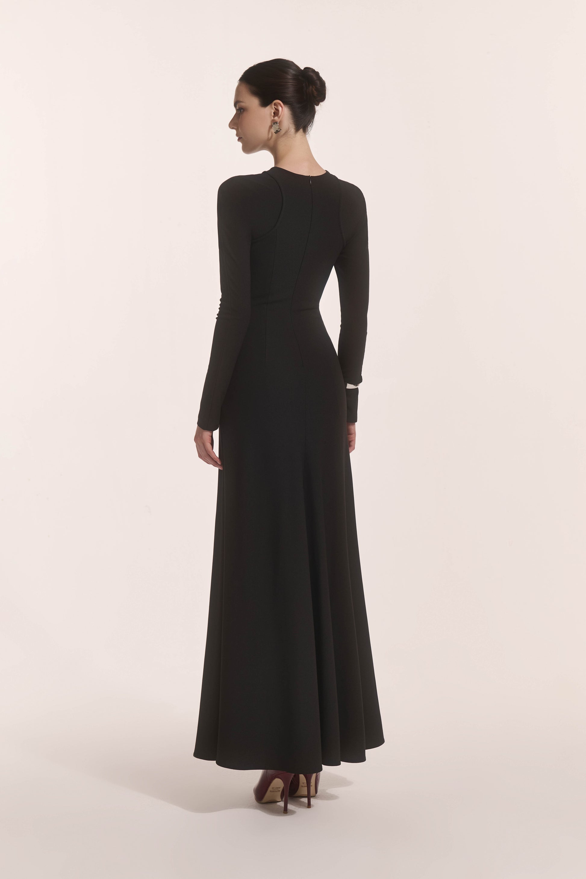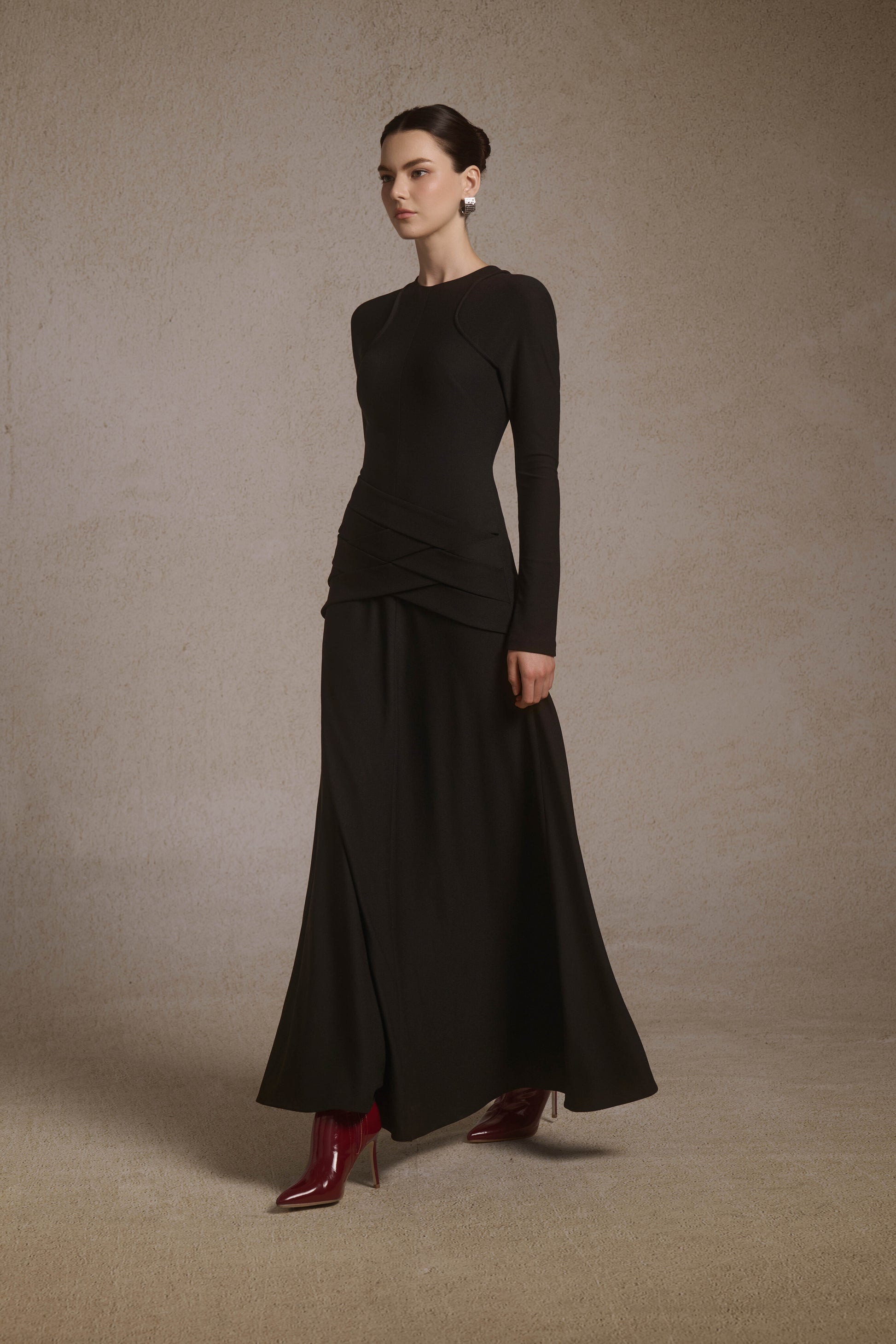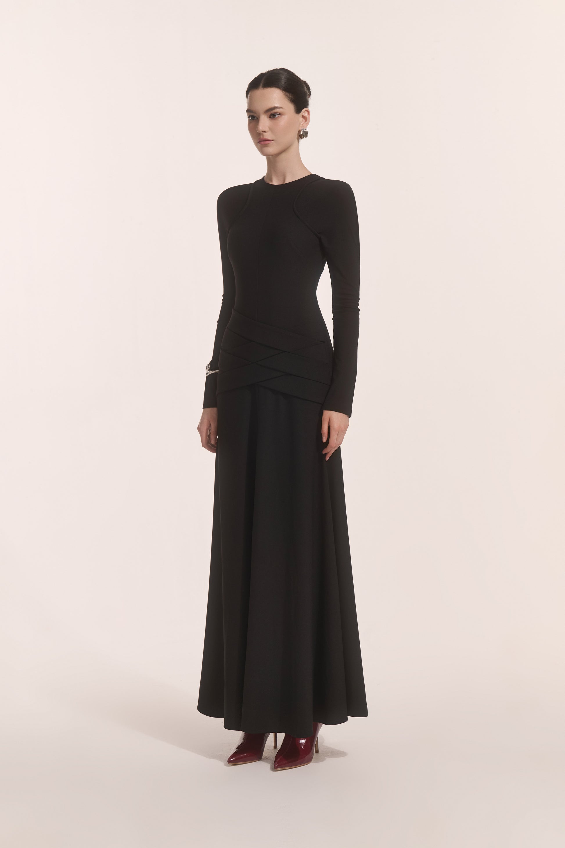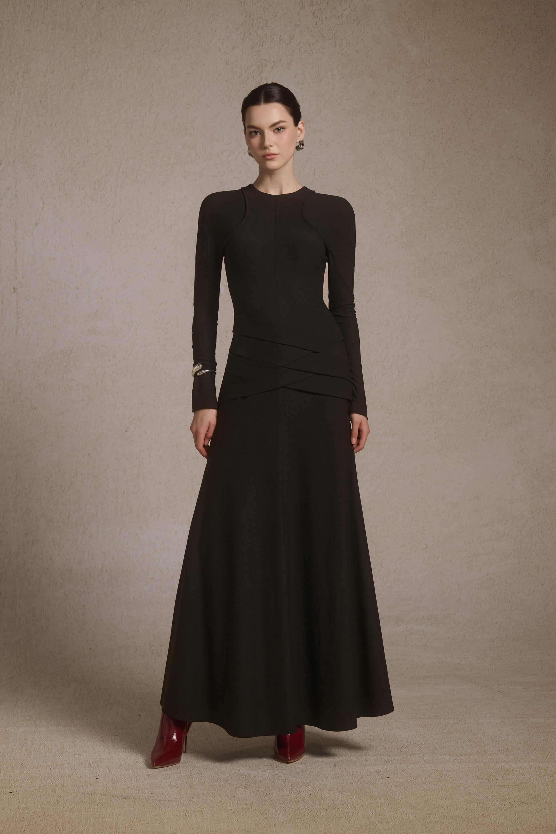 Fitted long-sleeve midi dress with tank-cut shoulders and standout hip lacing.