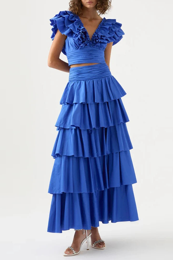 Bauble's 'Primrose' set is daring yet playful. Cut for a slim fit from stretchy fabric, it has ruffled sleeves and a V-neckline. The matching skirt is beautifully tiered to sway as you move.