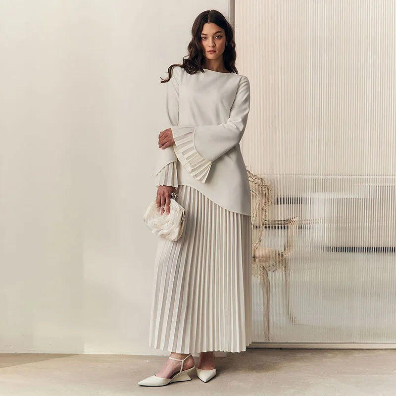 Bauble’s Veloura Dress is a refined take on summertime elegance. Designed with a soft O-neckline, flare sleeves, and a high waist, it effortlessly enhances your silhouette with subtle structure and grace. The pleated skirt moves with ease, while tonal patchwork detailing adds quiet depth to its solid hue. Perfect for garden parties or elegant escapes, this piece balances modern femininity with timeless appeal.