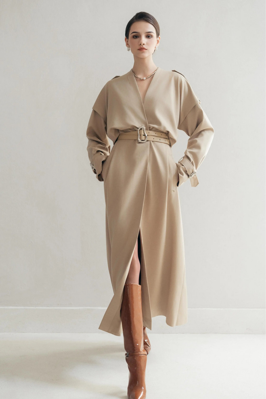 A trench-inspired dress perfectly captures the heart of practical style. Borrowing details from the classic trench coat; epaulettes, button fronts, structured collars, and waist ties. It brings a sense of refinement to utility dressing. The result is a look that’s tailored but easy to wear, polished yet relaxed. Whether in khaki, olive, or cream, this dress gives off a quiet confidence that feels both timeless and modern.