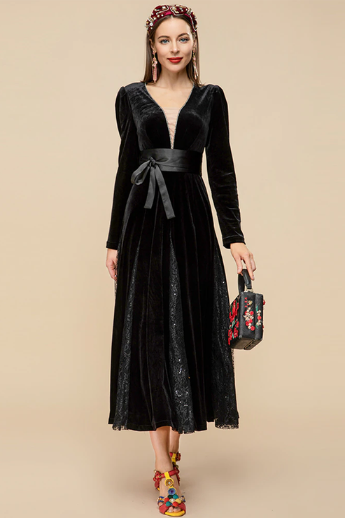 Velvet is the fabric of the season, and if you’re hunting for the perfect piece, the Midnight Sparkle Dress is a must-try. With its plush black velvet, sequin accents, and lace detailing, it strikes the perfect balance of elegance and drama. The belted waist keeps the silhouette flattering, making it an easy pick for everything from cocktail parties to evening soirées.