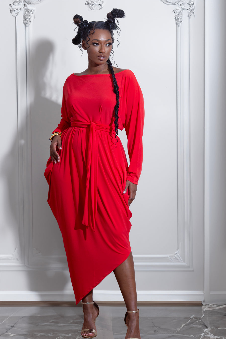 The Zinna Dress is all about making an entrance without even trying. With its asymmetrical cut and pleated satin fabric, it moves beautifully and catches the light in the best way. The unique collar and bold red color give it that elevated, standout vibe perfect for formal nights. Pair it with metallic accessories and you’re instantly party-ready.