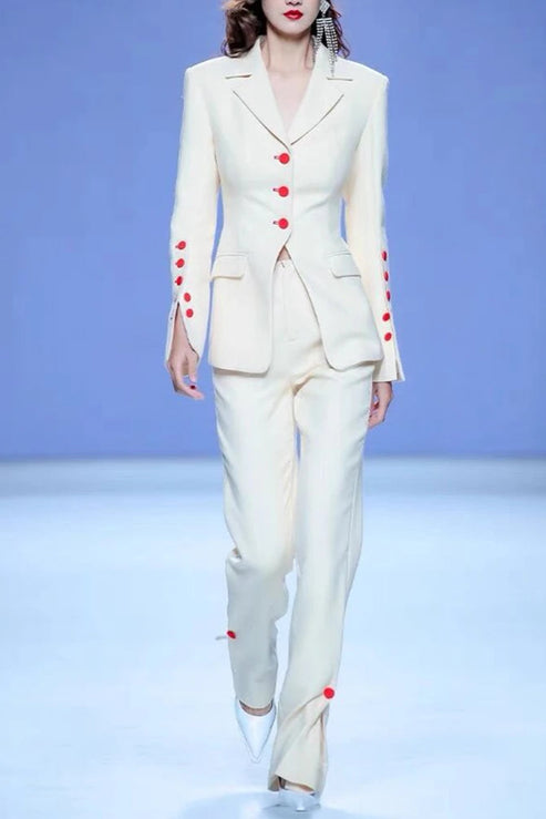 Power dressing made easy—Bauble’s Madrigal Set is the perfect blazer-and-trousers combo for work. Its clean ivory tailoring keeps things polished, while the pop of bright pink buttons adds just the right touch of personality.