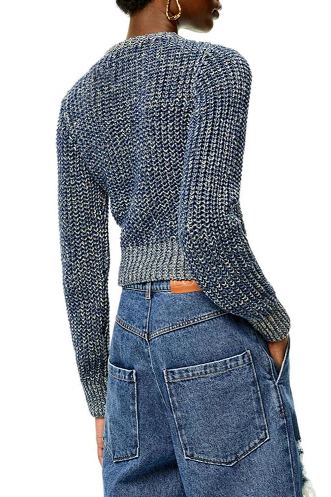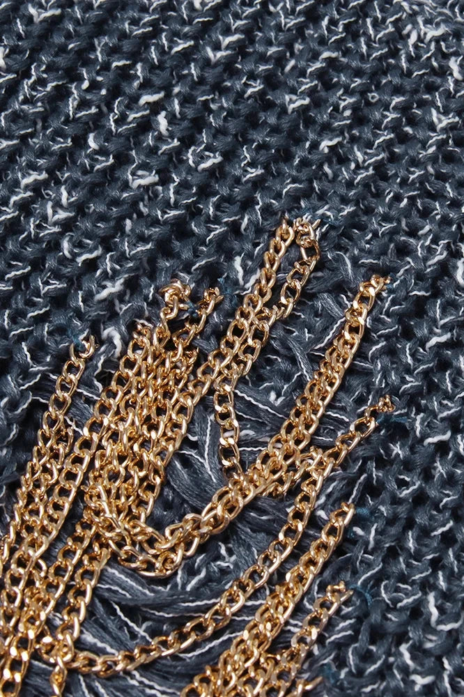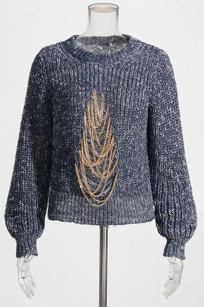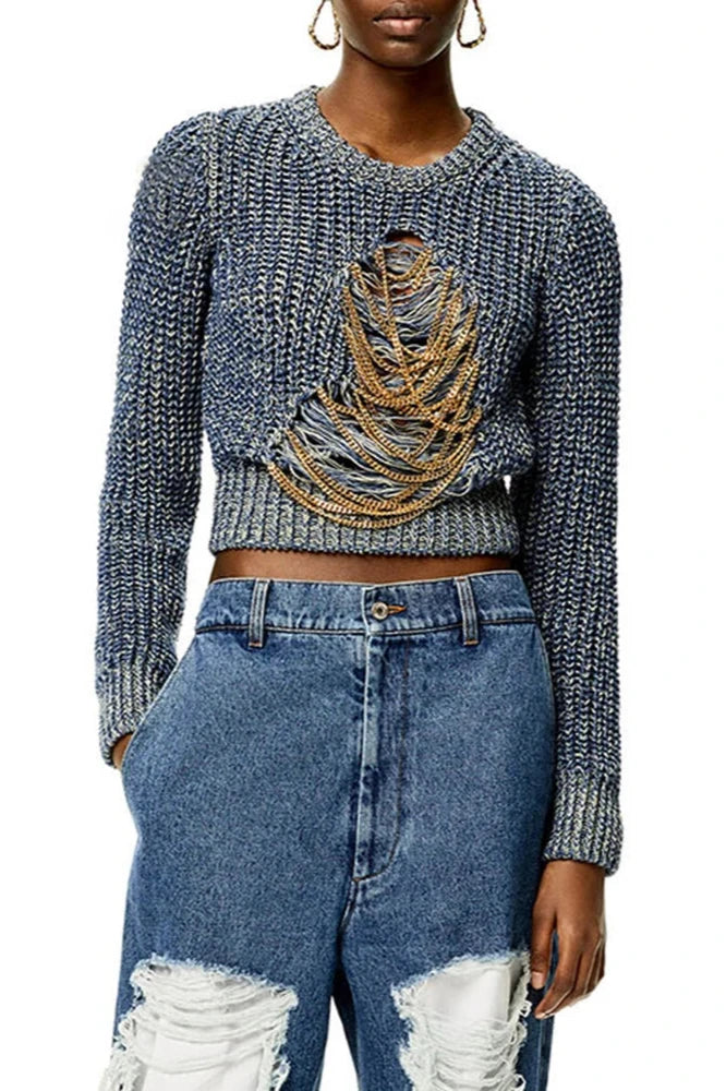 Bauble's 'Argyle' sweater gives the laidback style an elevated feel. It has a slightly loose fit defined by ribbed trims and the star of the show is the distressed front design with gold chain accents creating a visual, trendy effect.