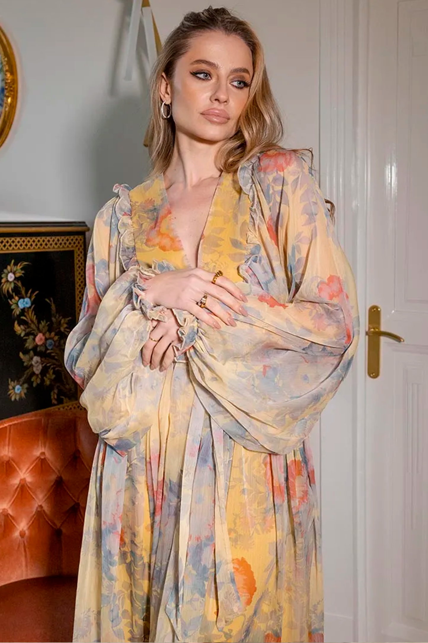 Say goodbye to boring beach dresses and give a warm welcome to the brand new Phoenix Chiffon Dress! Featuring a bandage chiffon fabric, floral long sleeves, and a pleated boho style, you'll be steppin' out in style. Get your summer wardrobe ready with this sizzlin' maxi dress and be sure to turn heads!
