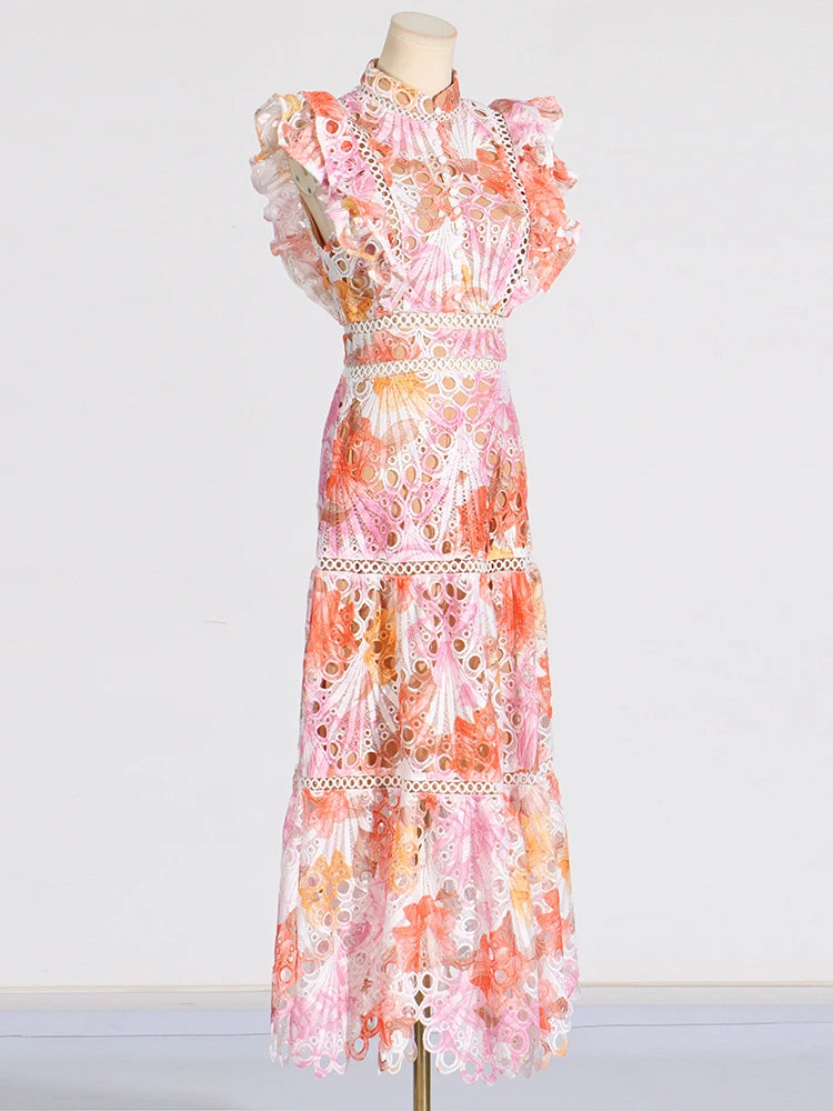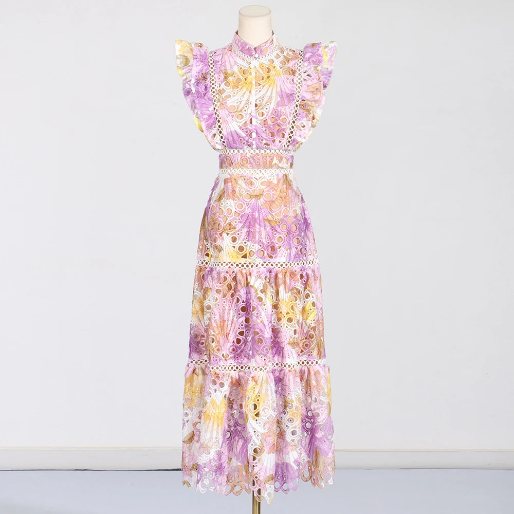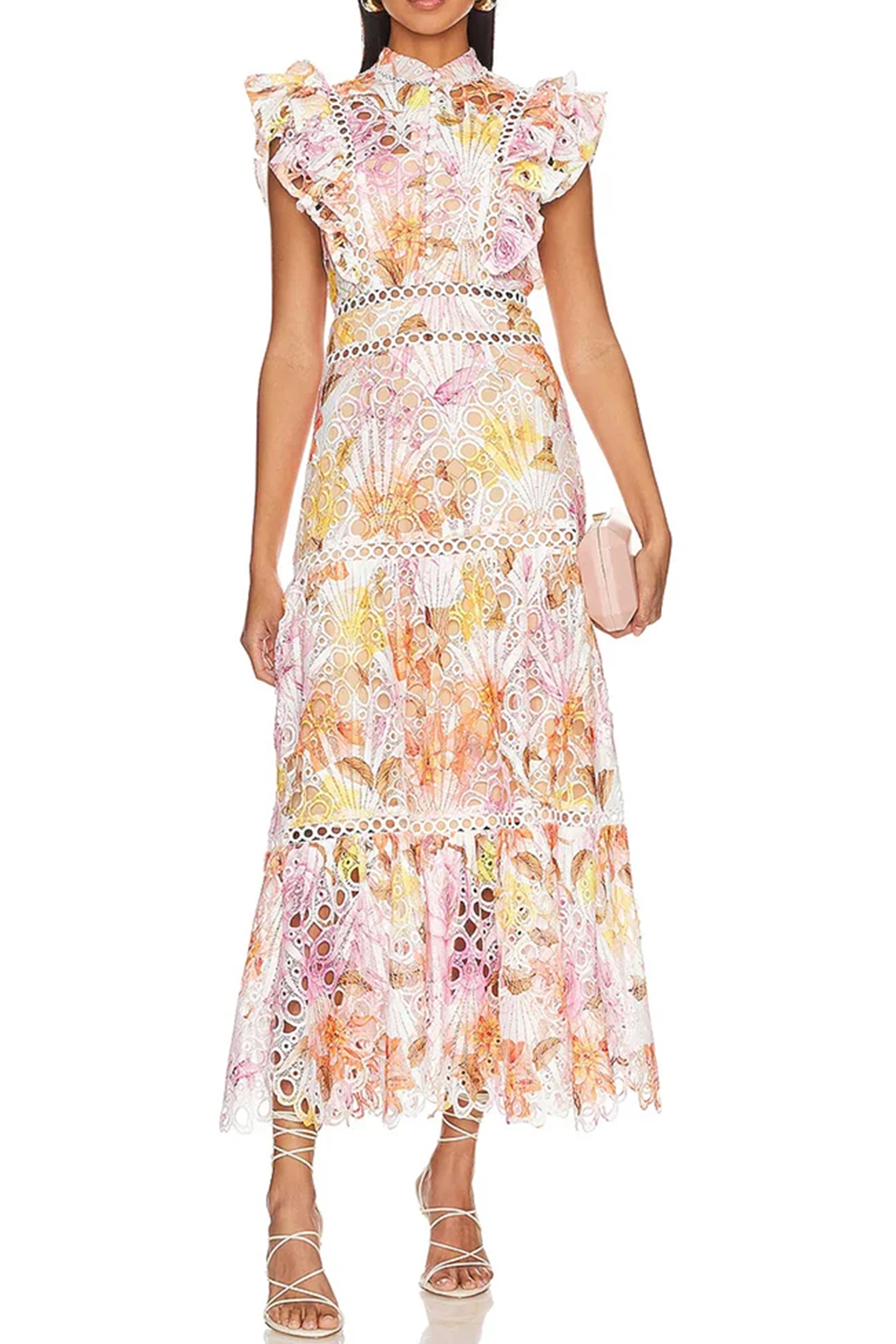 EXCLUSIVE AT BAUBLE BUY. Stacy re-imagines its signature florals every season, and their endless romance remains unchanged. Made from light fabric, this dress is patterned with a colorful array of abstract blooms and has a floaty, tiered design. The collared neckline gives it a smart feel and the butterfly sleeves give is a casual yet classy look.