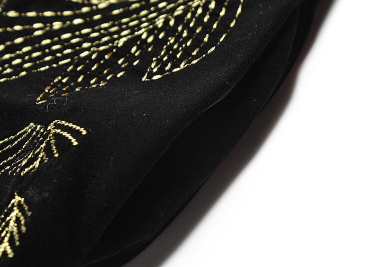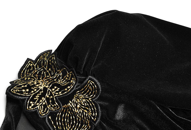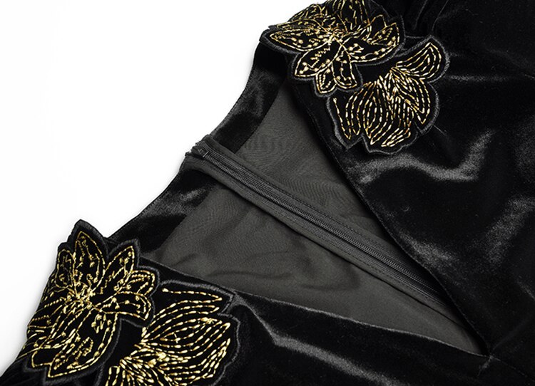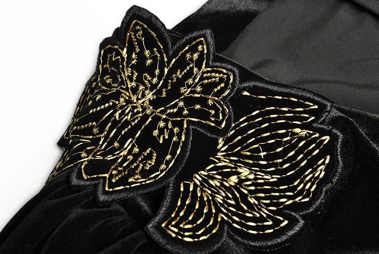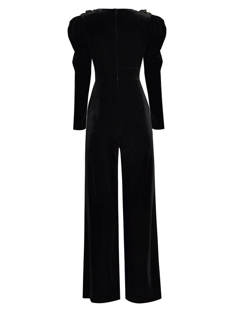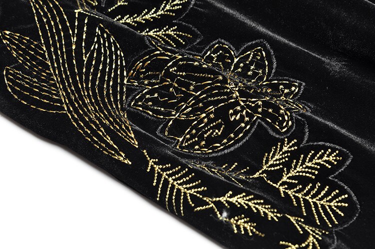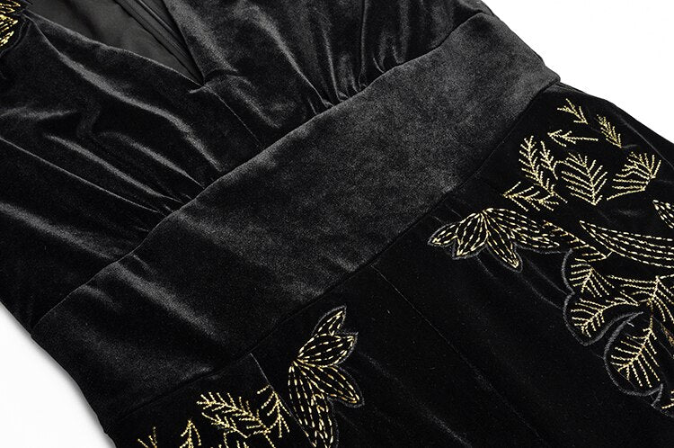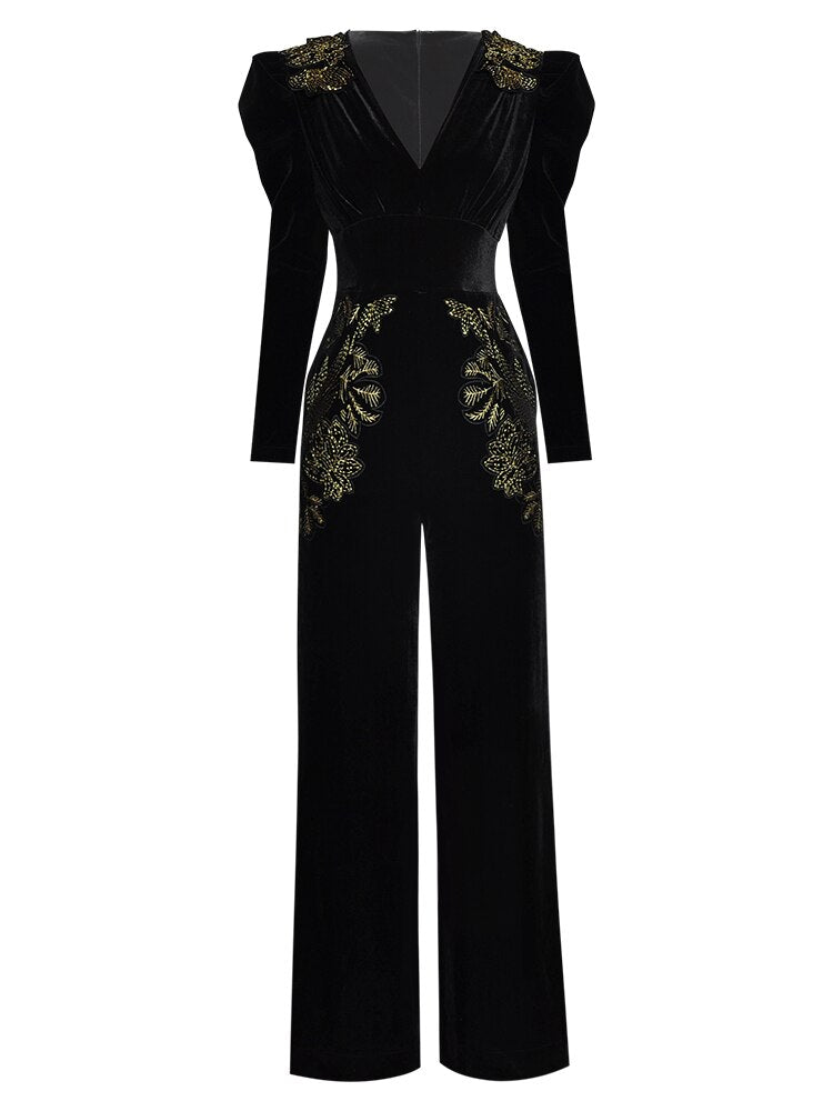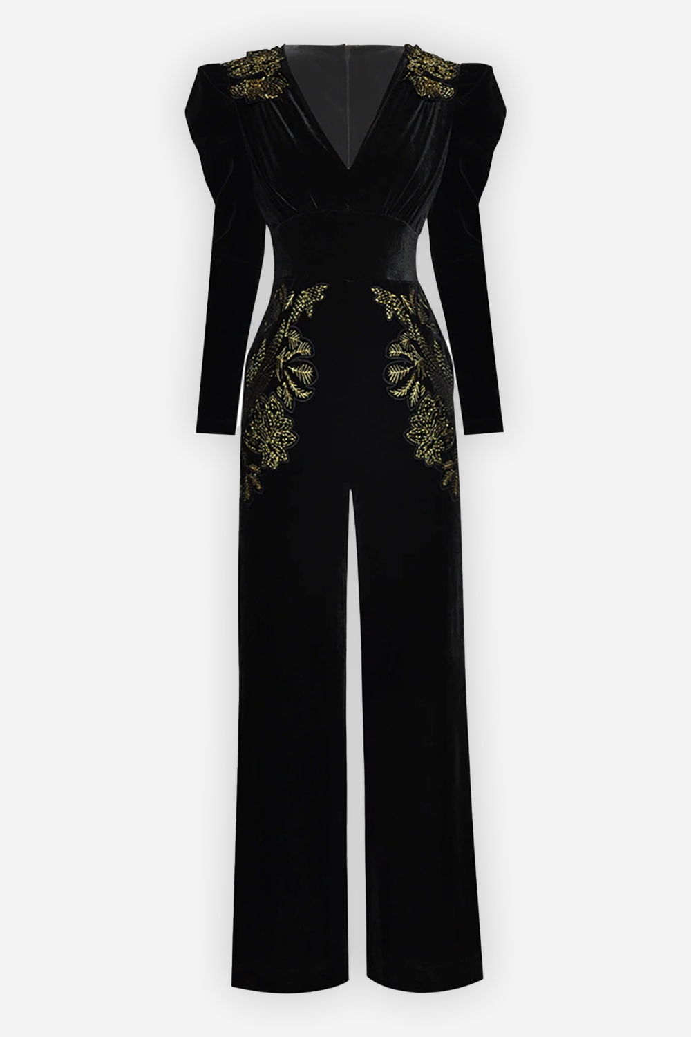 The Vesper jumpsuit is a stunning garment that is perfect for those who want to make a bold statement at a formal event. The jumpsuit features intricate gold embroidery which has a floral pattern, adding a touch of elegance and sophistication to the overall design. The velvet fabric provides a soft and supple texture, while also creating a sense of richness and depth.