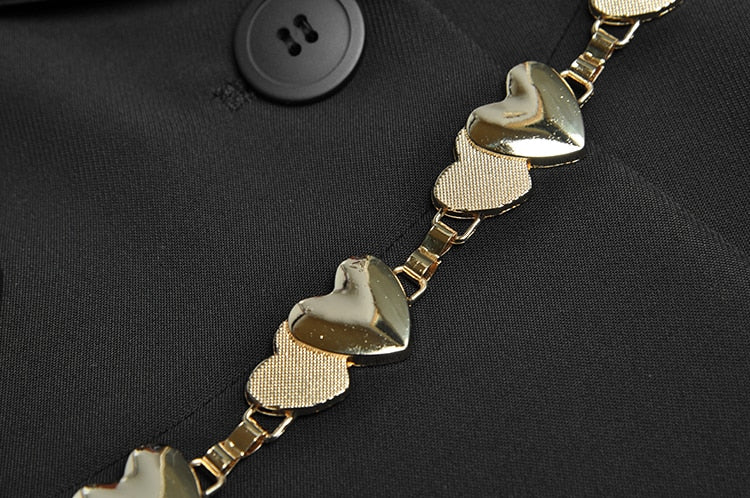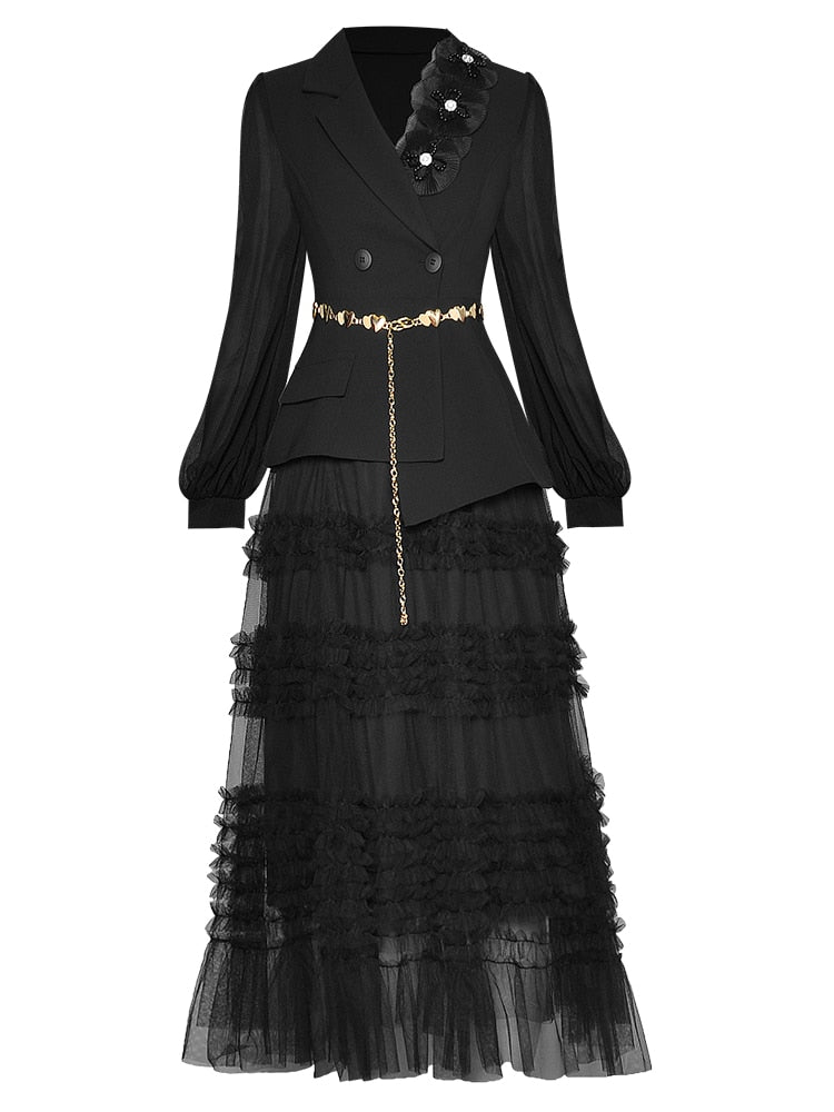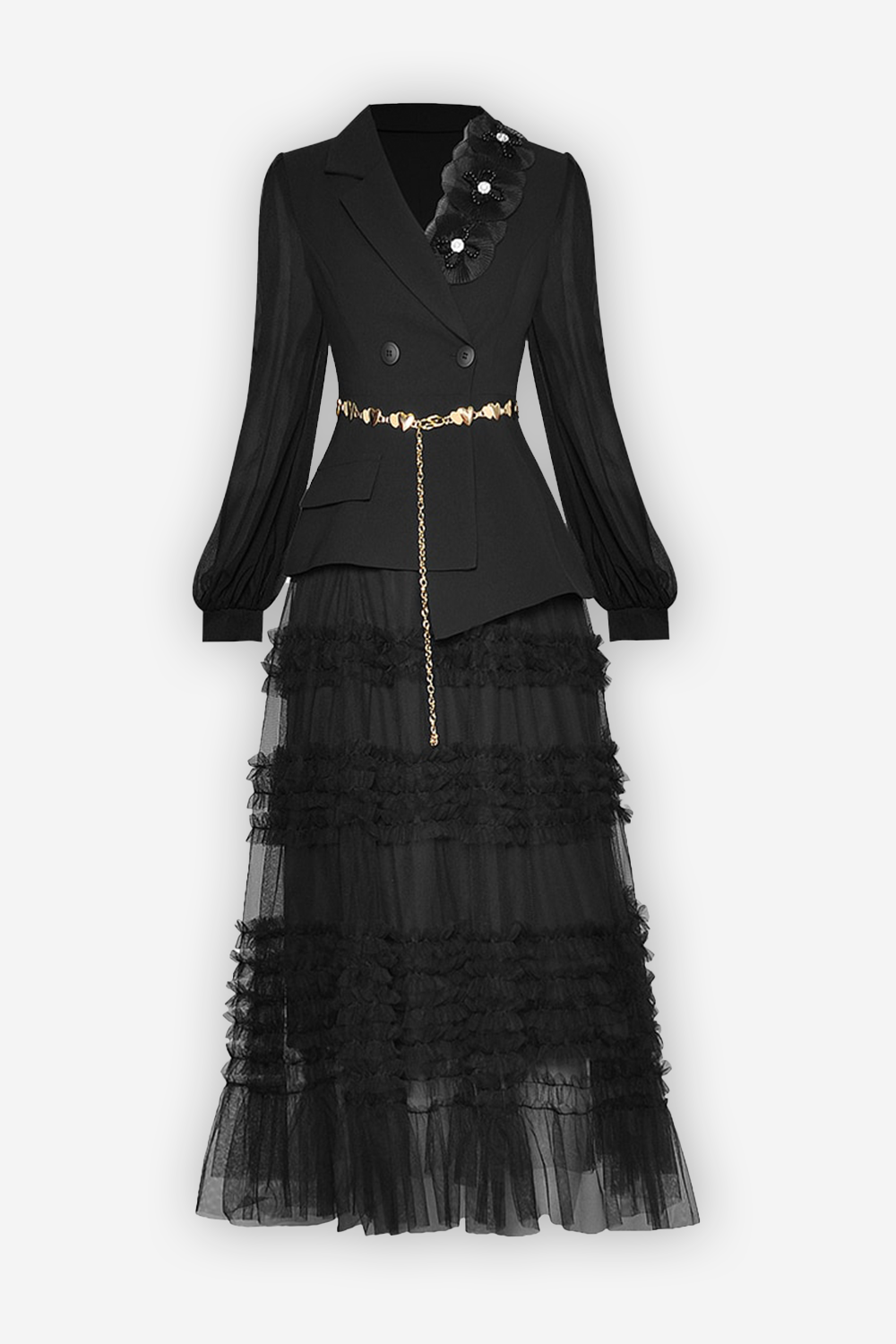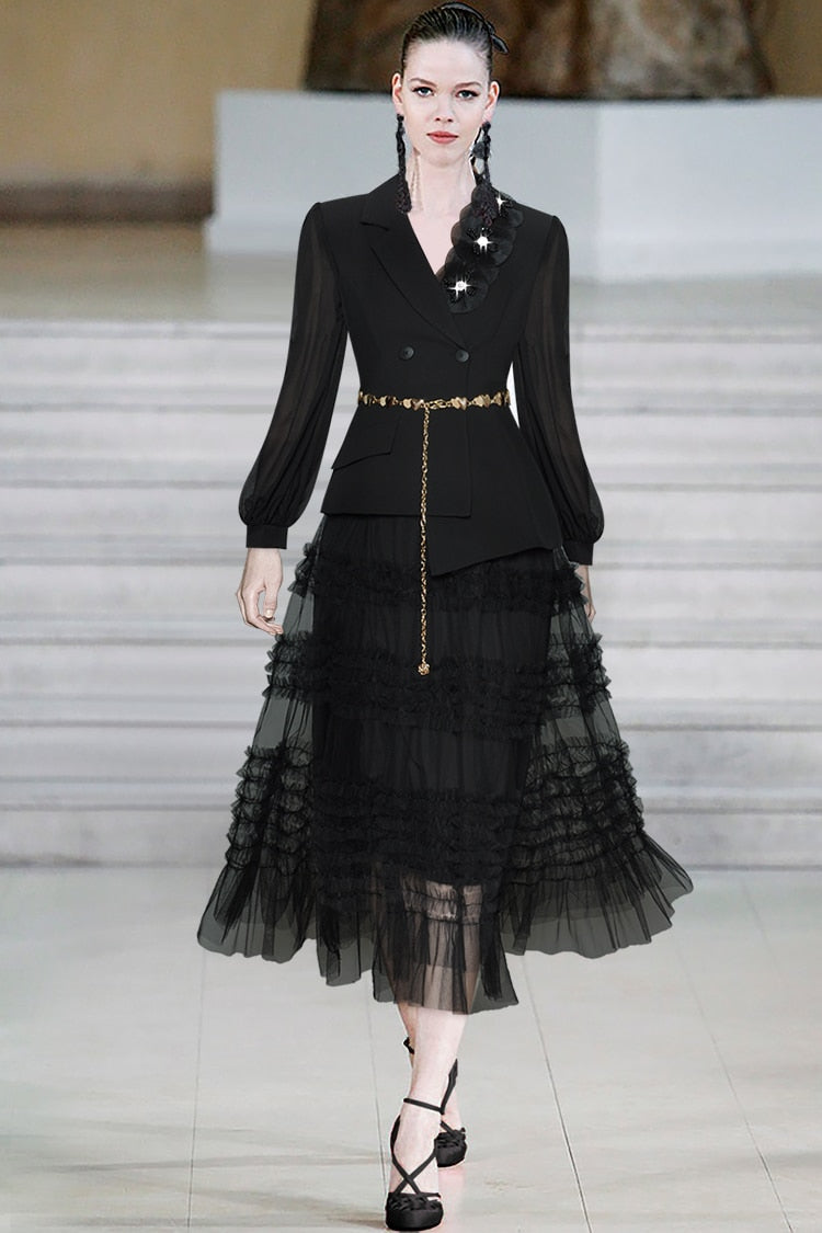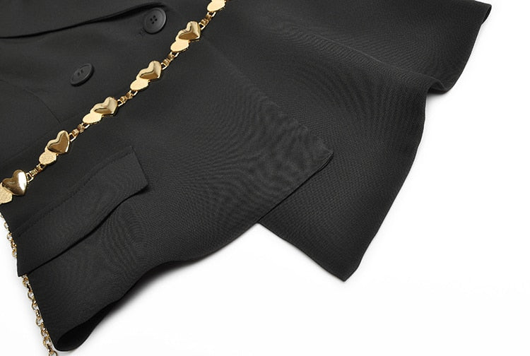 Our buyers can't get enough of the slick, sophisticated outerwear in Bauble's Fall '22 collection. Debuted on the runway, this asymmetrical lace up suit has a notched collar wit intricately embroidered appliques along with a chain belt to define your waist.