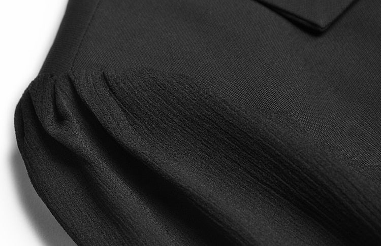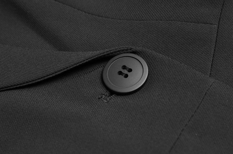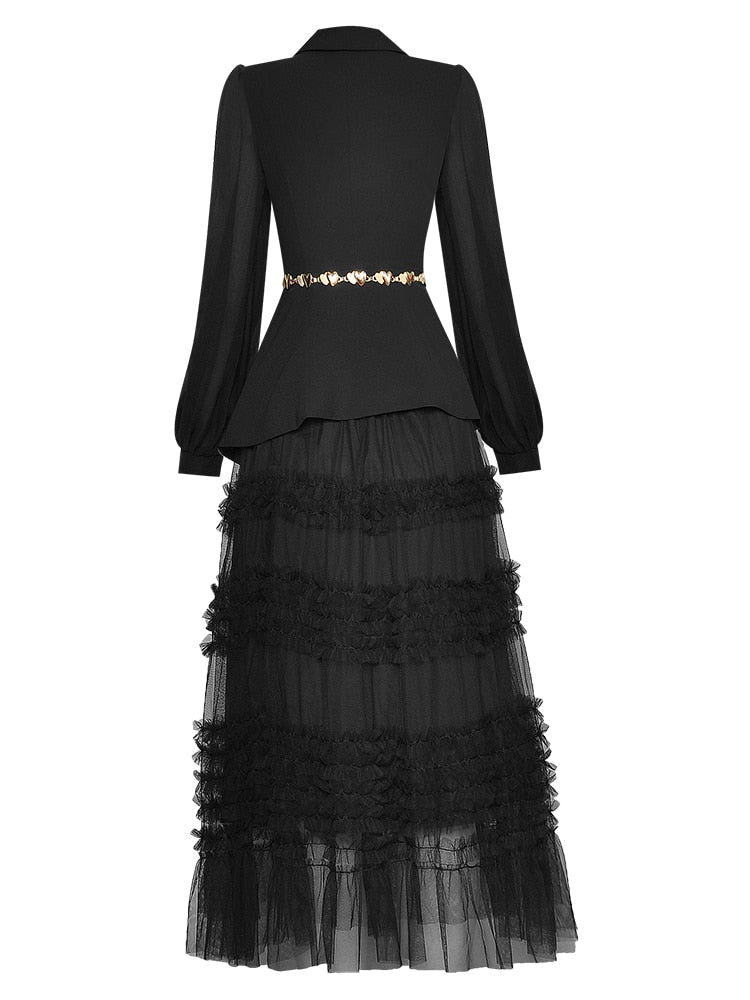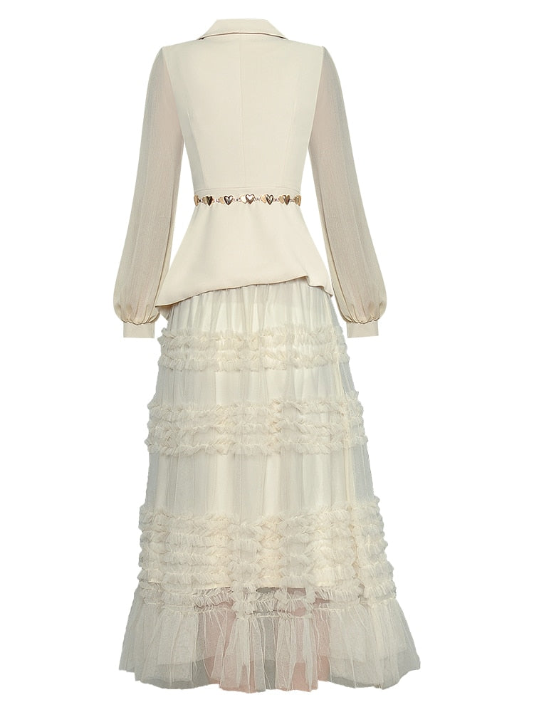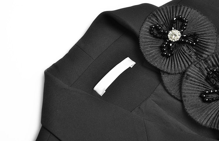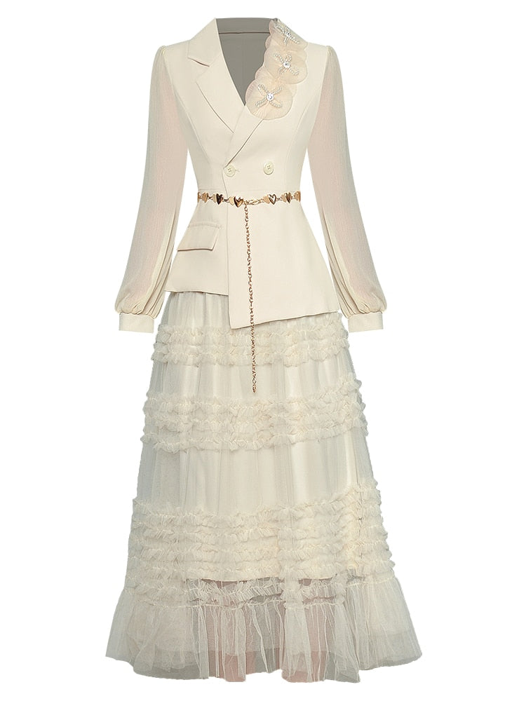 Our buyers can't get enough of the slick, sophisticated outerwear in Bauble's Fall '22 collection. Debuted on the runway, this asymmetrical lace up suit has a notched collar wit intricately embroidered appliques along with a chain belt to define your waist.