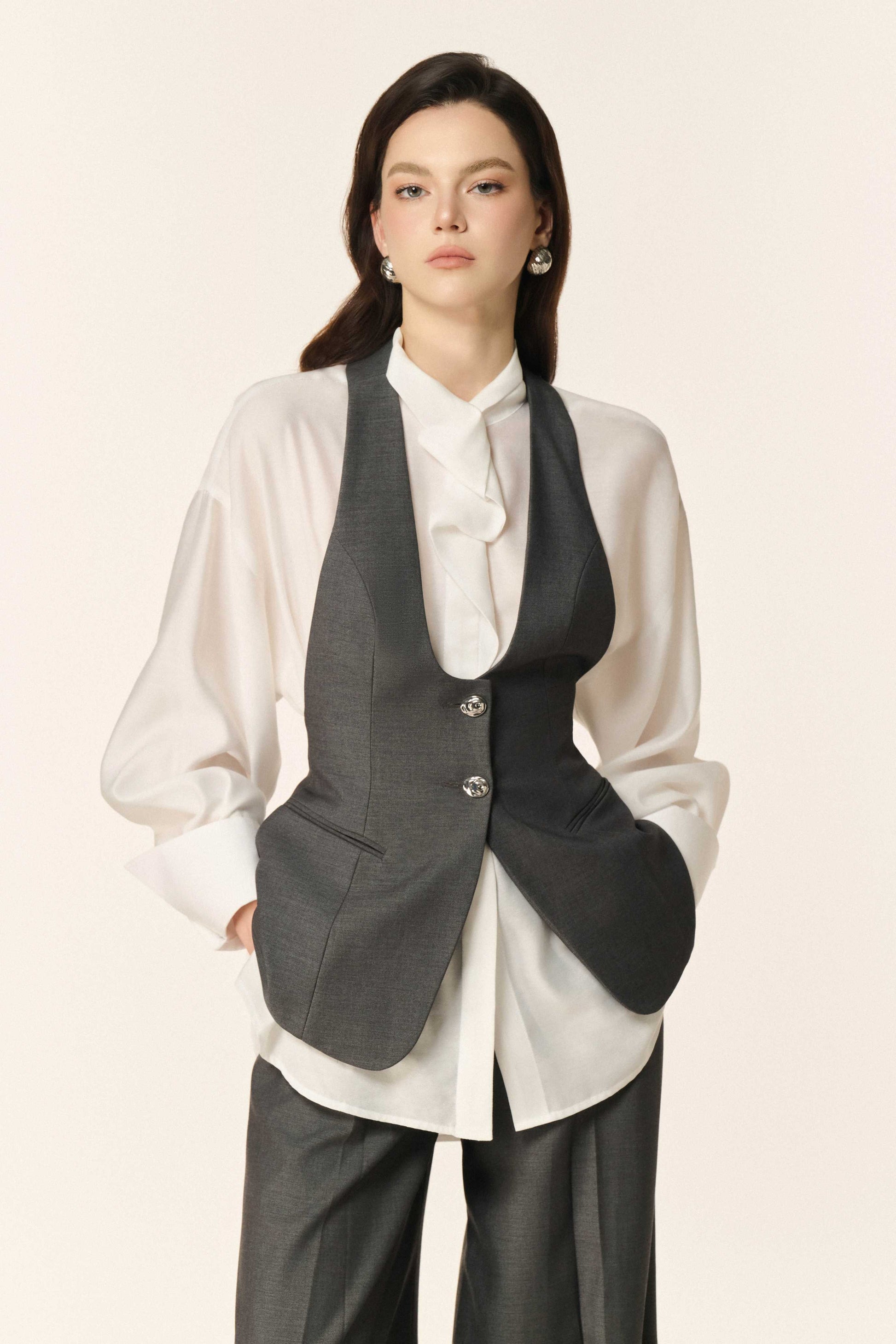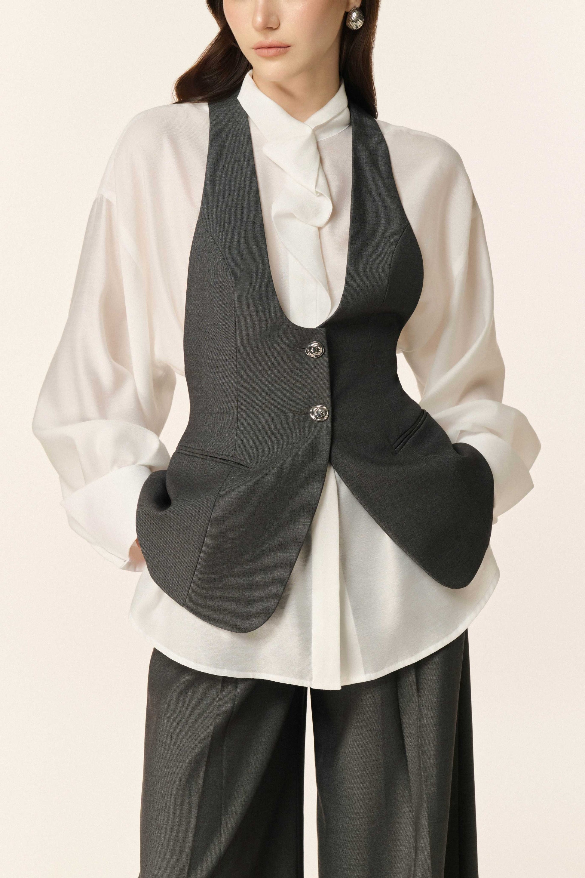 A daring yet elegant vest featuring a deep U neckline and backless halter design. The cinched waist sculpts a flattering hourglass silhouette, enhancing both curves and confidence. Can be worn solo or layered for bold styling versatility.