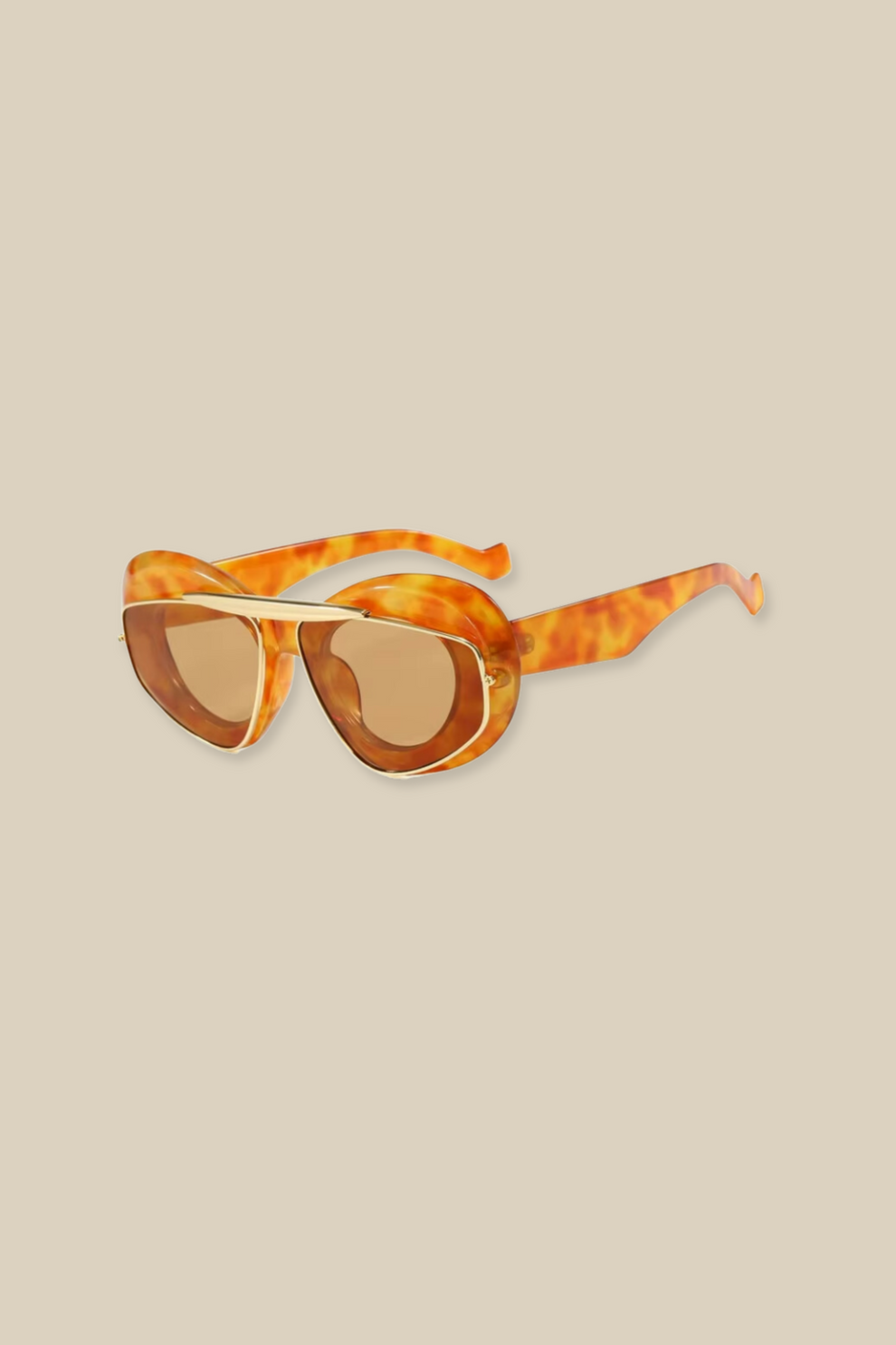 Shield your eyes in high-fashion style with the 'Raze' Sunglasses. Featuring a striking layered design in gold-tone metal, they’re the perfect mix of classic and cool—just like your favorite Olsen-inspired accessories.