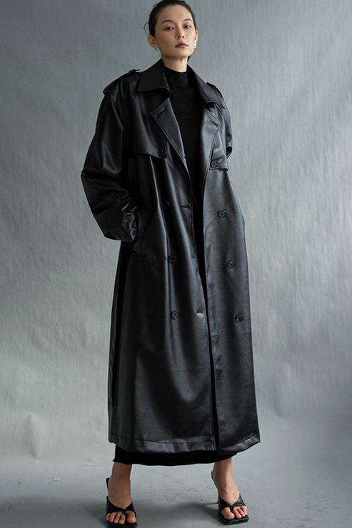 For instant cinematic flair, Bauble’s Ainsley belted leather coat is your scene-stealing upgrade. The slightly loose silhouette, exaggerated lapels, and waist-defining belt give it that luxe, dramatic edge—turning even a simple jeans-and-knit combo into a runway-worthy look.