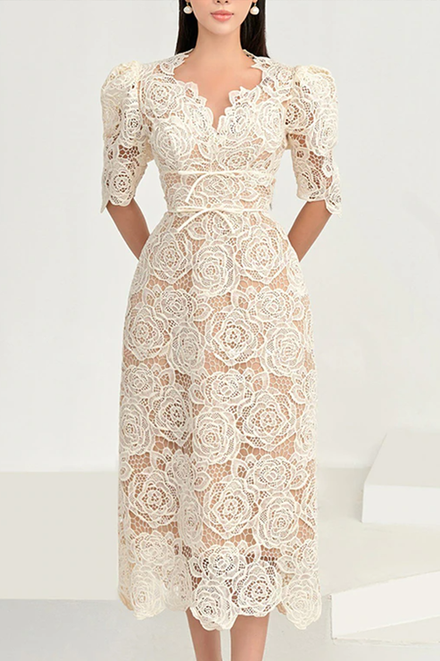 Bauble’s Athena Dress is all about timeless romance. Designed in a flattering high-waisted, slim silhouette, this midi-length piece feels both classic and modern. The delicate hollow-out lace detailing channels soft femininity while its retro-inspired charm makes it perfect for weddings, soirées, or any special evening out.