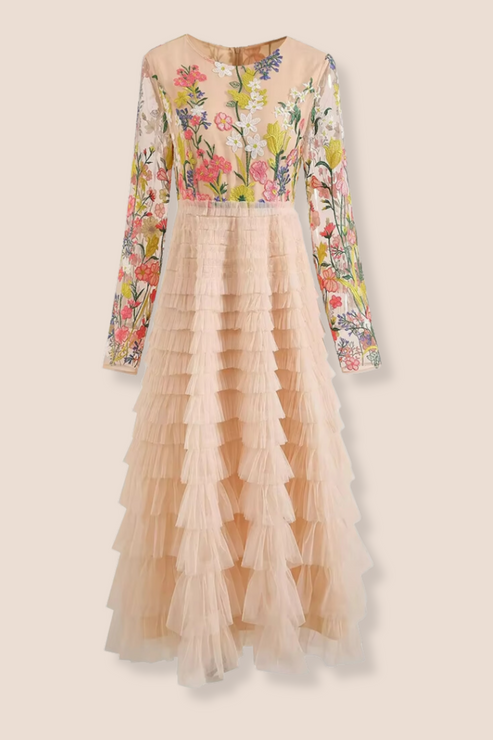 If you love her mix of simplicity and glam, check out Bauble Buy’s Lainey Dress. With its colorful floral embroidery, delicate mesh details, and cascading ruffles, it’s the perfect balance of effortless beauty and statement-making style. Whether you're heading to an evening event or looking for the perfect wedding guest dress, this piece has you covered!