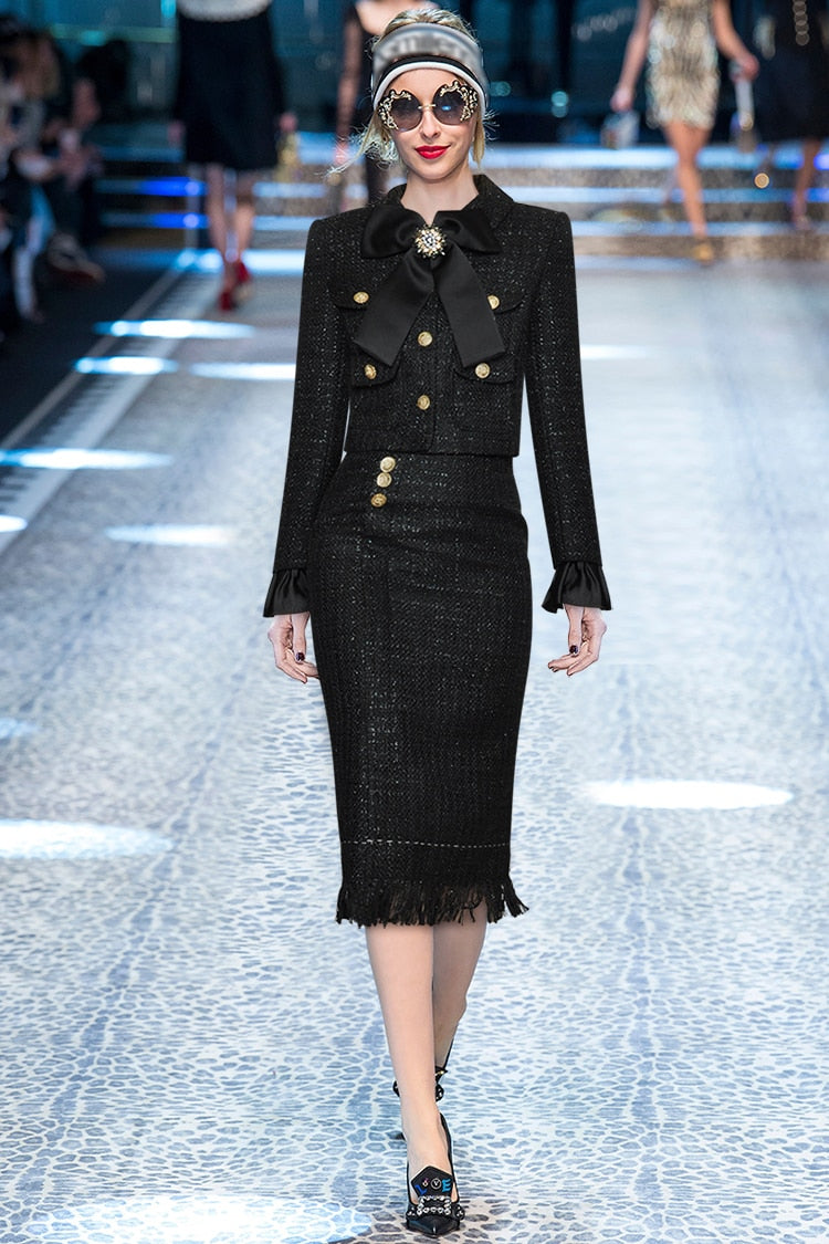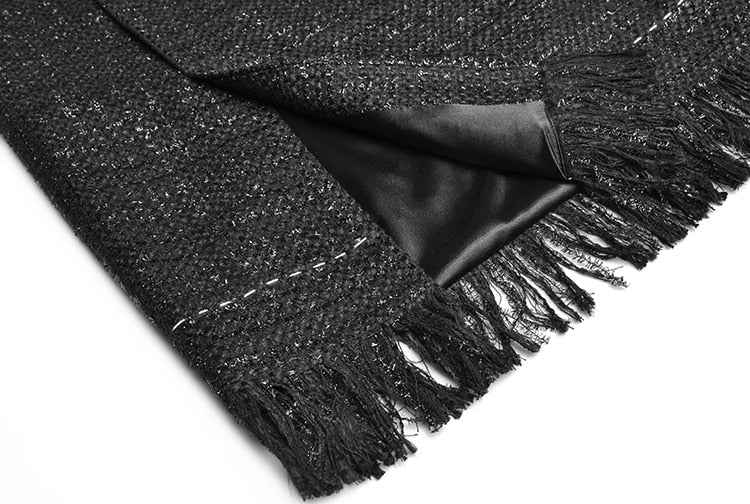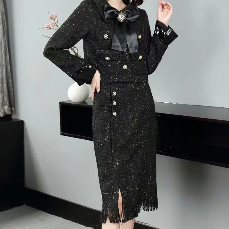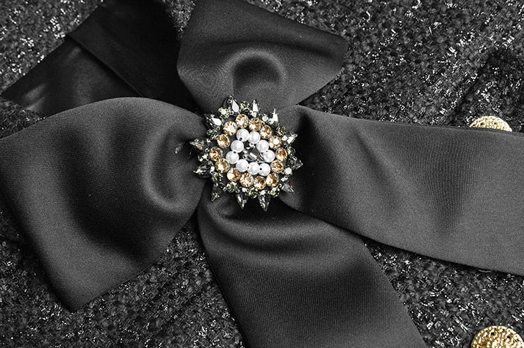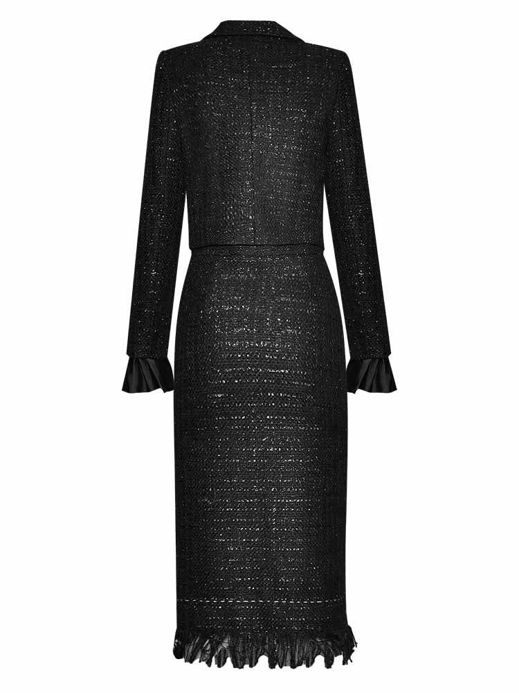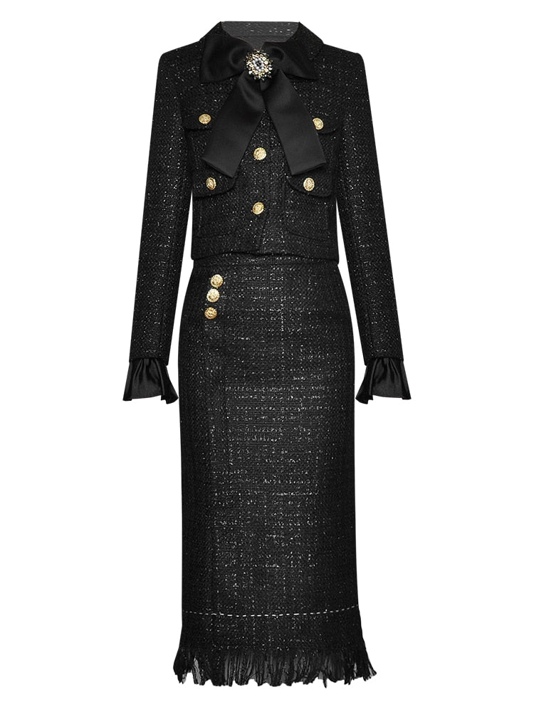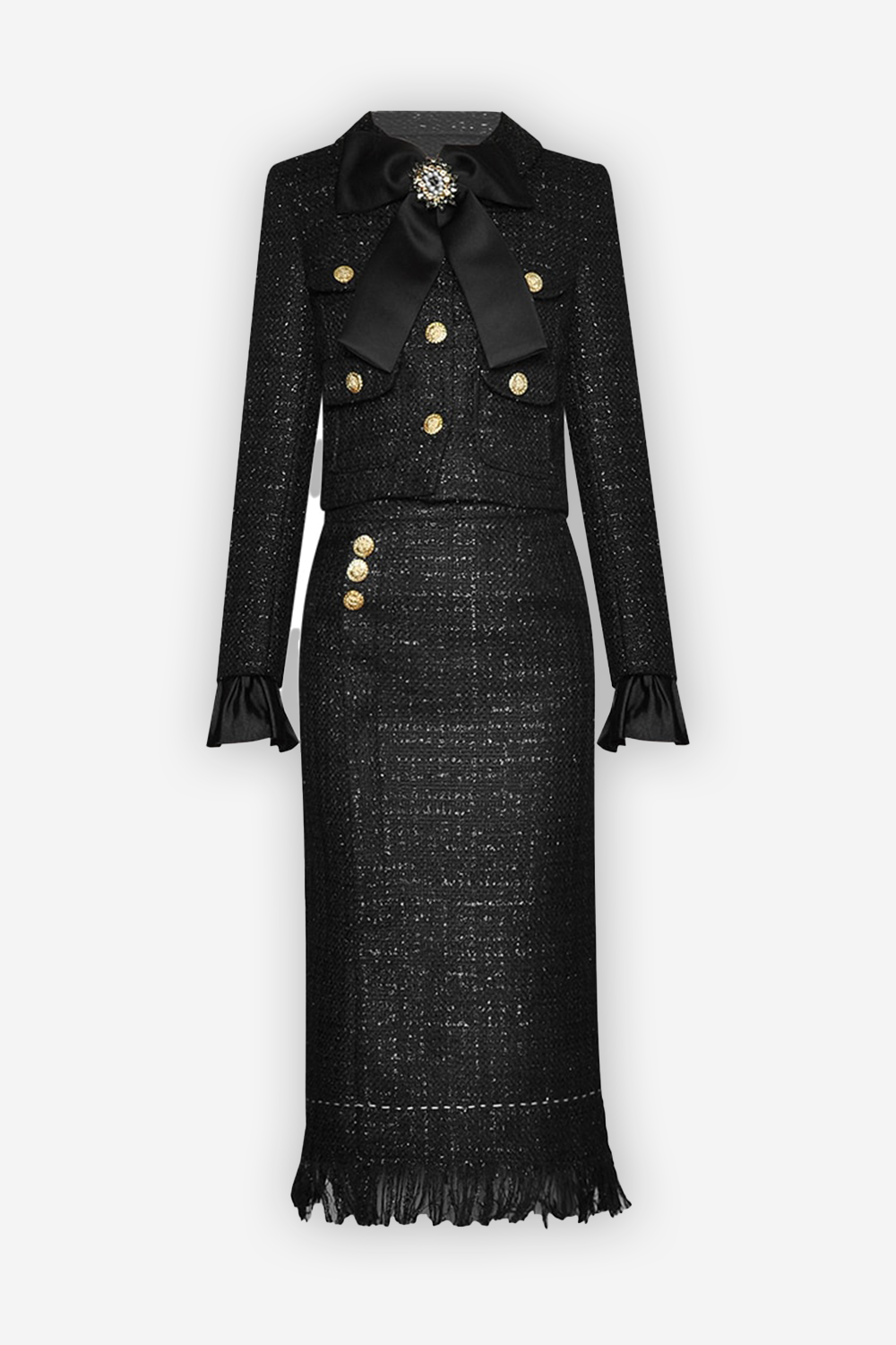 Our buyers can't get enough of the slick, sophisticated outerwear in Bauble's Fall '22 collection. Debuted on the runway, this 2 piece set has a beaded bow with tassels at the hem of the skirt.