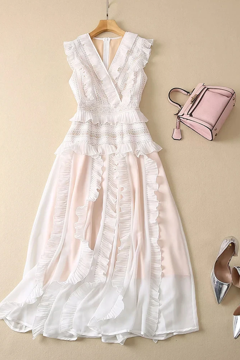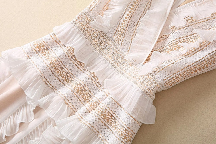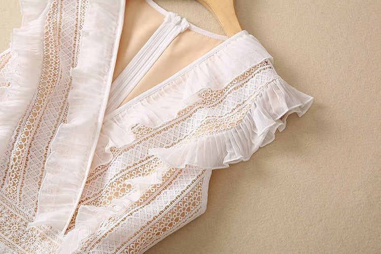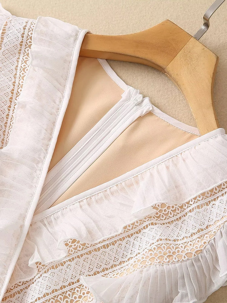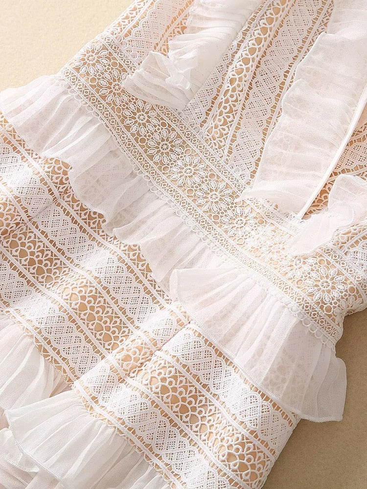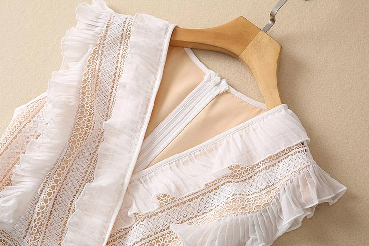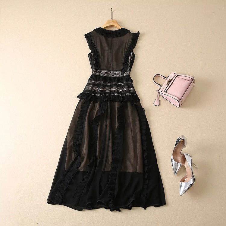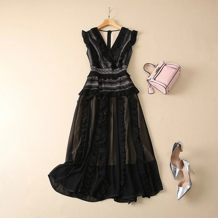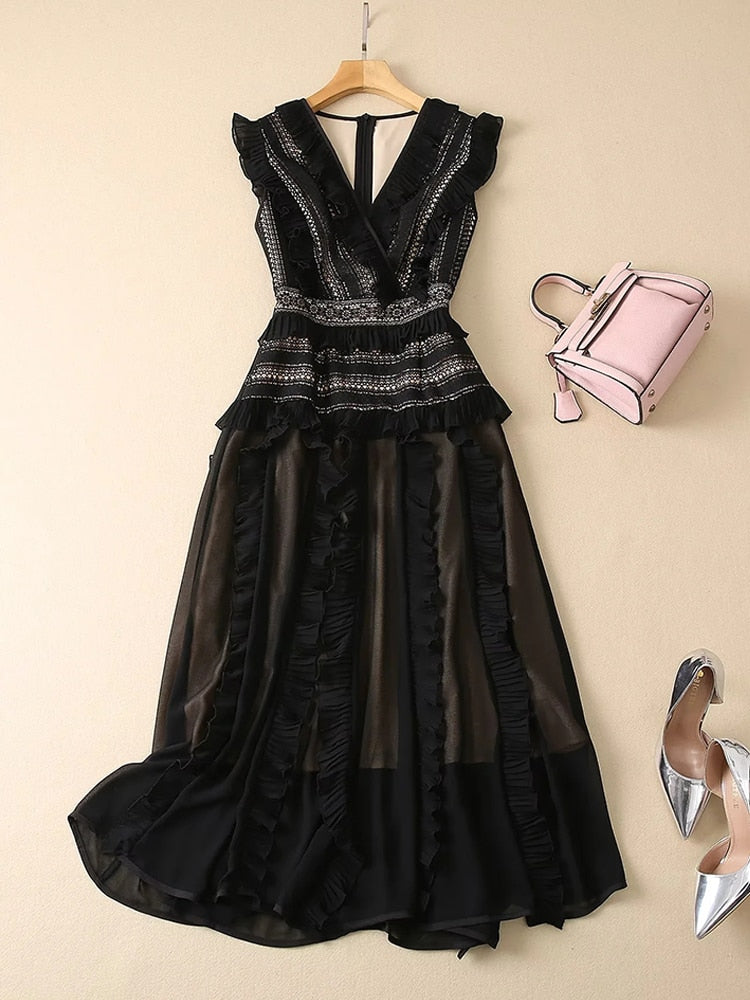 Elevate your look with the Flutterby Ruffles Dress, from this season's Designer Fashion collection. Featuring a timeless V-Neck and a delicate hollow out lace, this elegant dress is sure to turn heads. Crafted with sensitivity and precision, the signature ruffles and striking black and white colors will effortlessly take you from day to night. Enjoy the luxury of effortless style.