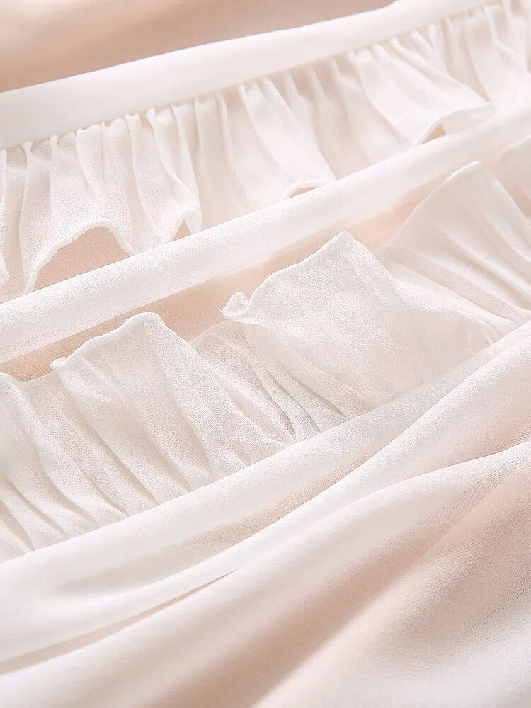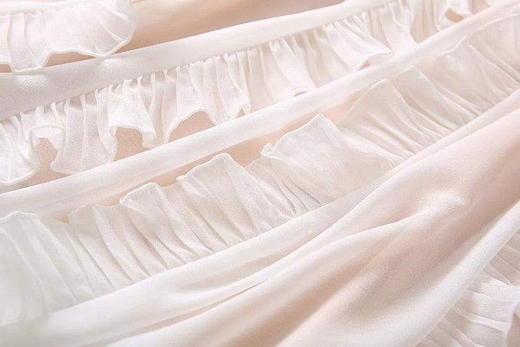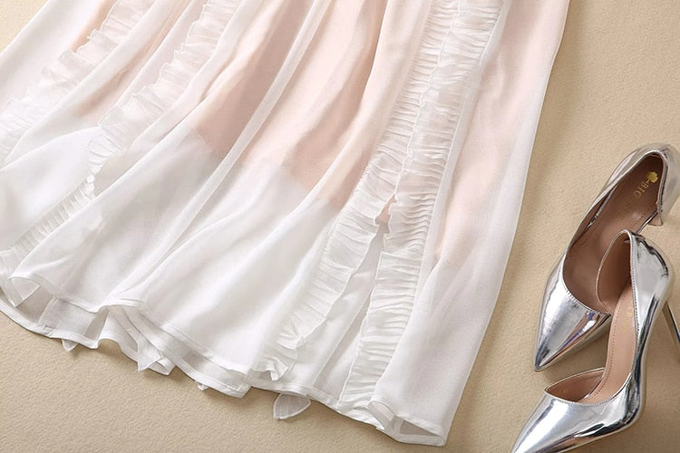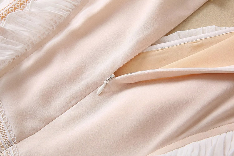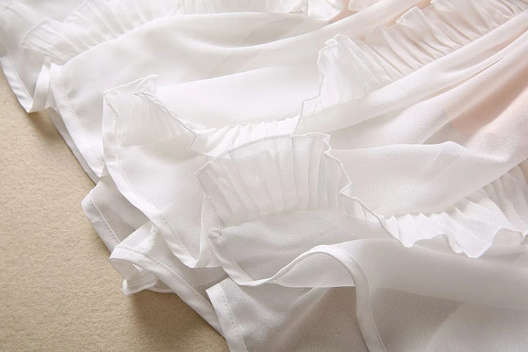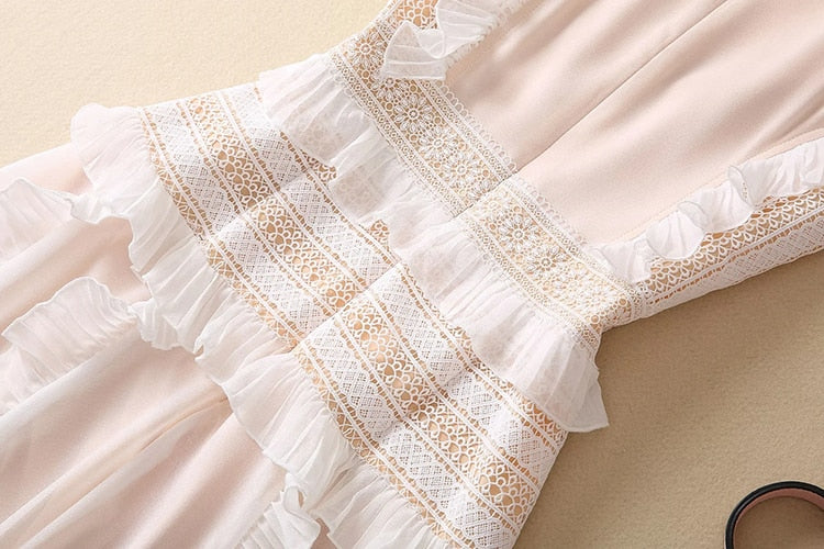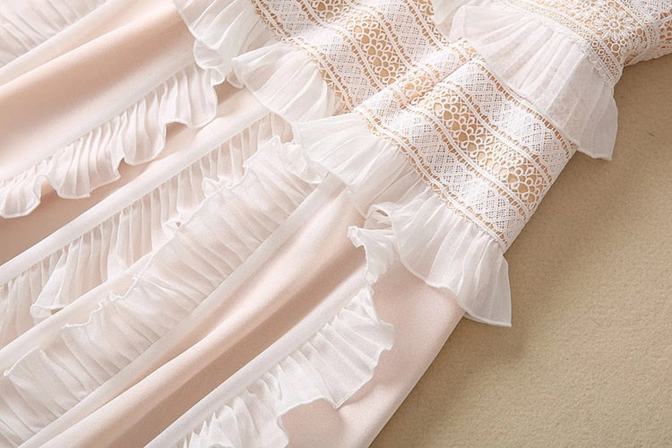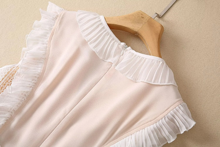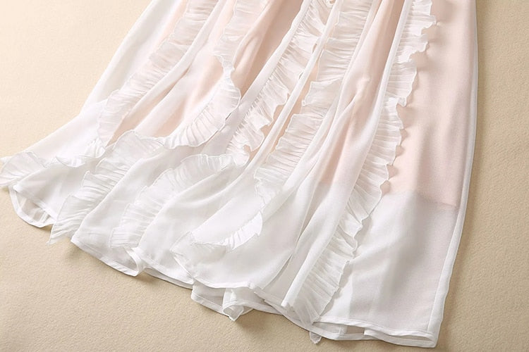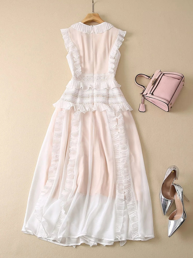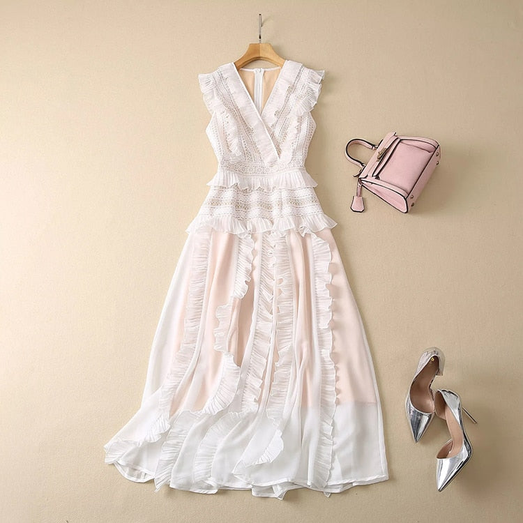 Elevate your look with the Flutterby Ruffles Dress, from this season's Designer Fashion collection. Featuring a timeless V-Neck and a delicate hollow out lace, this elegant dress is sure to turn heads. Crafted with sensitivity and precision, the signature ruffles and striking black and white colors will effortlessly take you from day to night. Enjoy the luxury of effortless style.