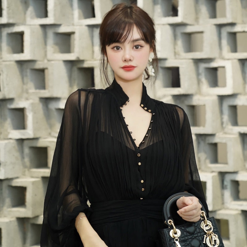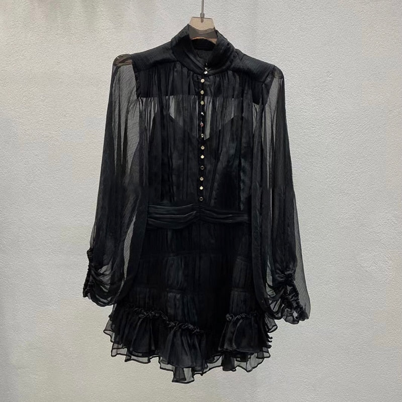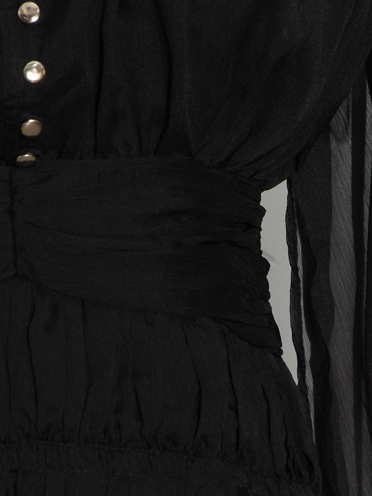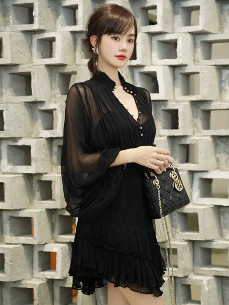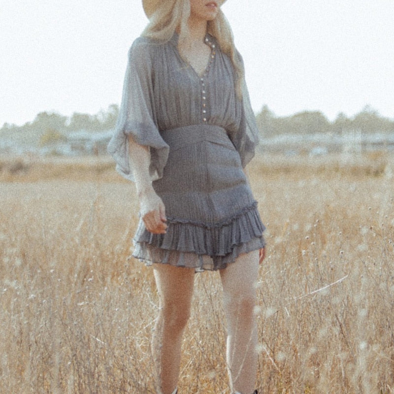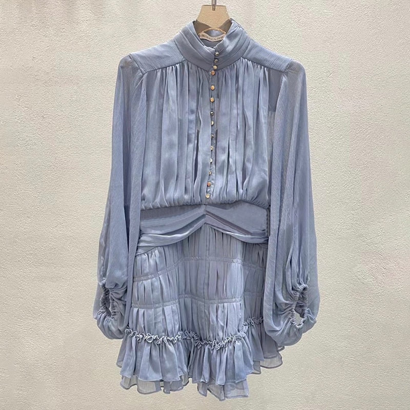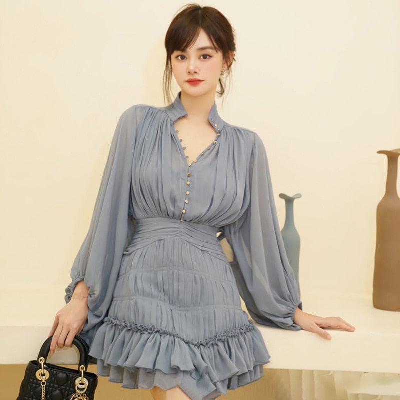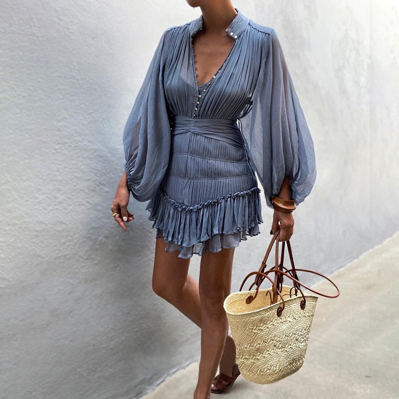 The Temperament Fold Pleated Mini Dress is a stylish and feminine piece with a V-neckline and puff sleeves. It features a flattering high waist and is designed with pleats for a sophisticated touch. The dress is finished with buttons for a classic look, making it perfect for both formal and casual occasions.