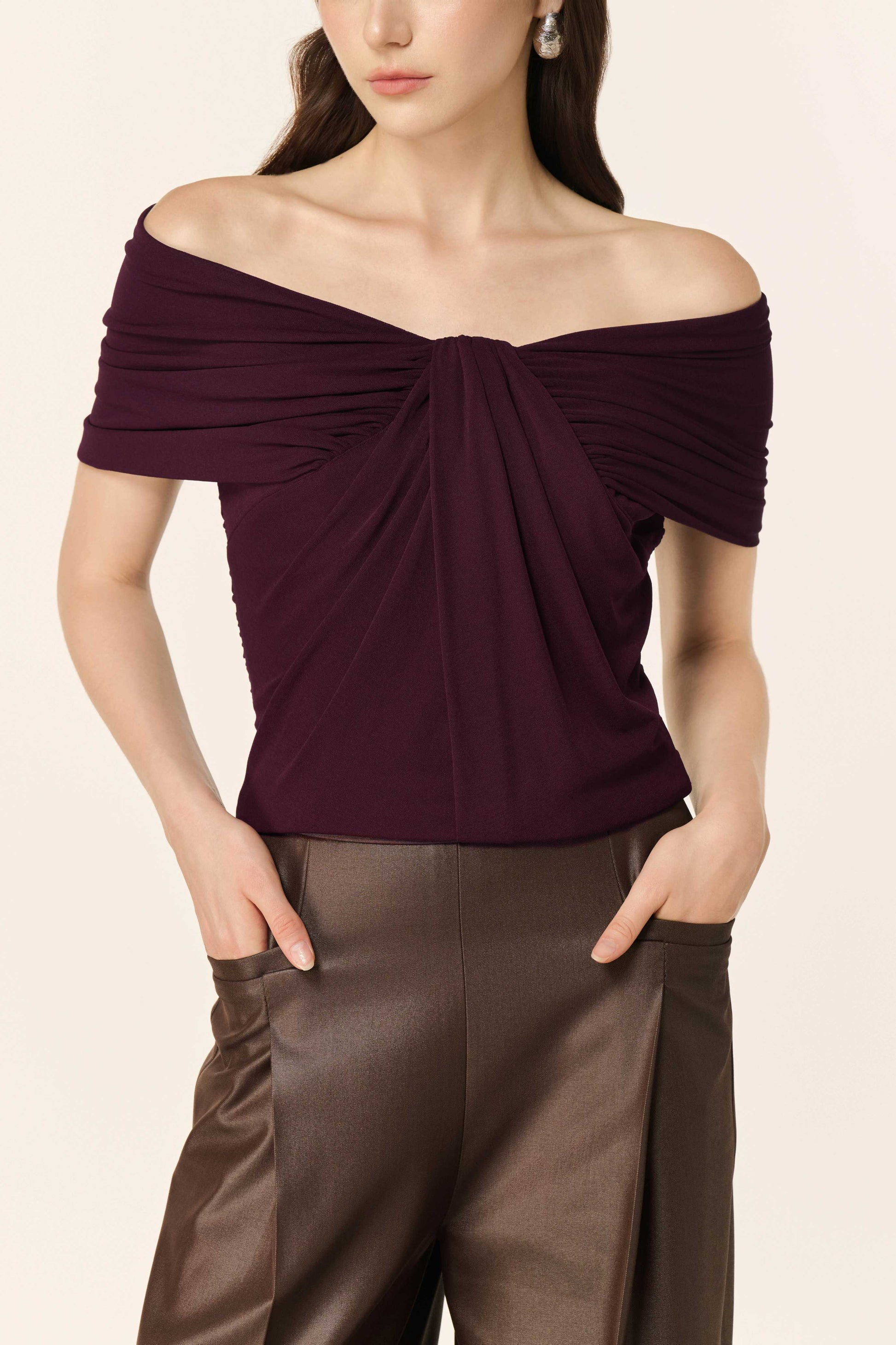 Fitted and flattering, this cropped top features soft ruching and a twisted front detail that accentuates the bust. The off-shoulder silhouette is sensuous yet modern — perfect for daytime outings or evening flair.