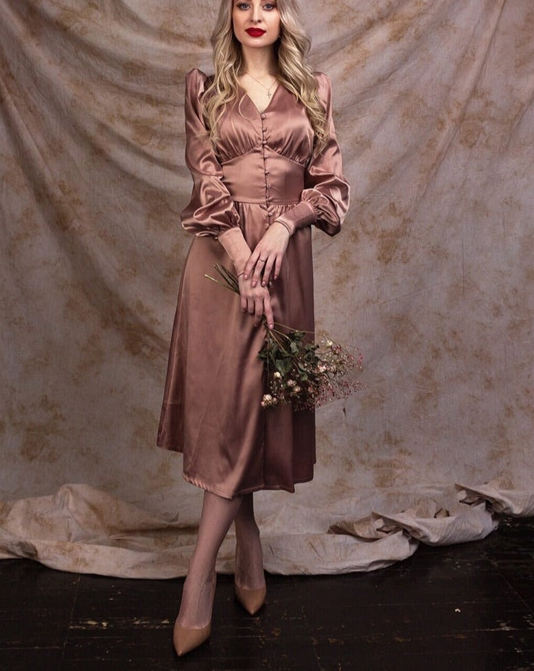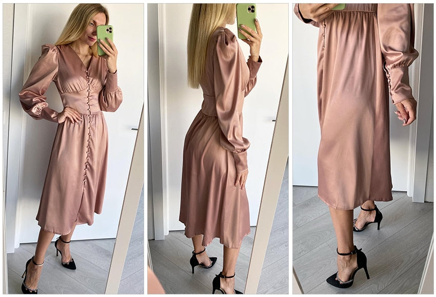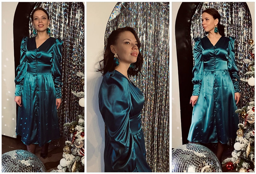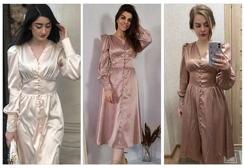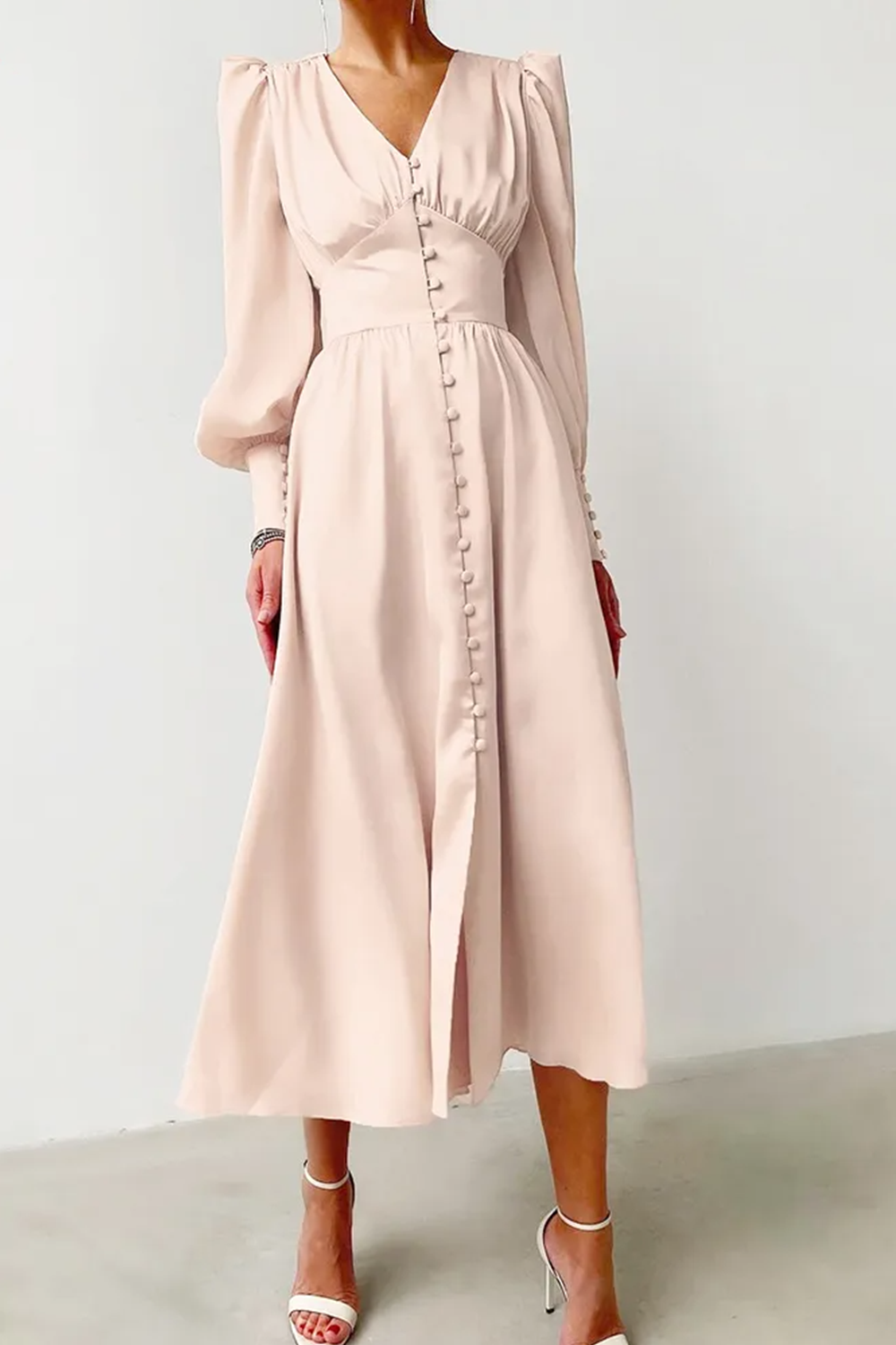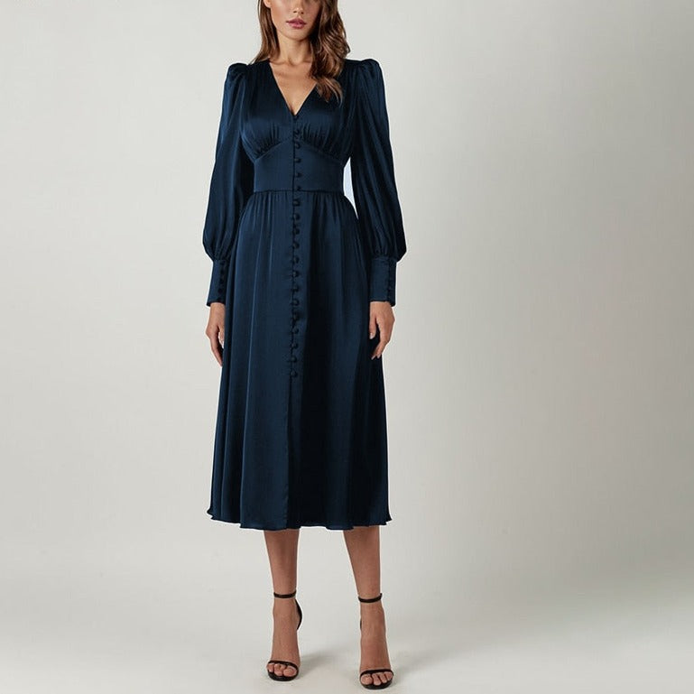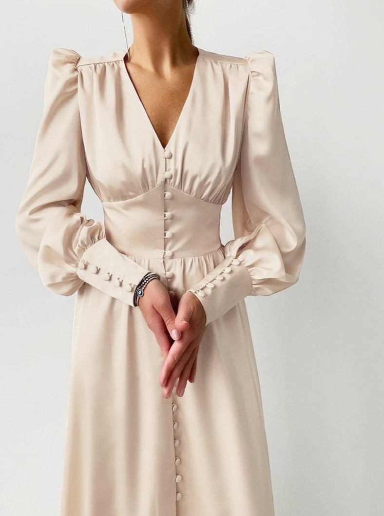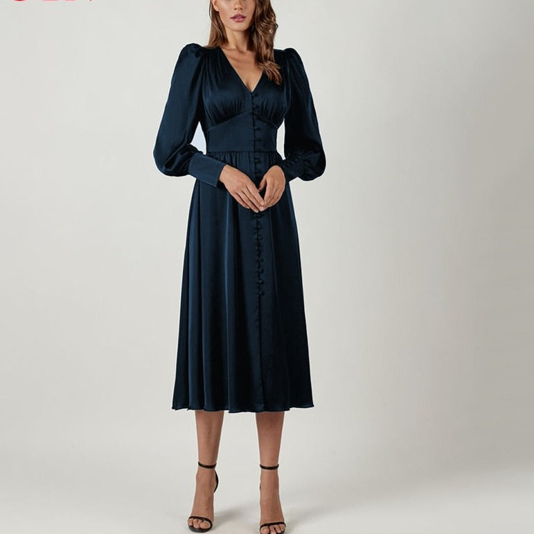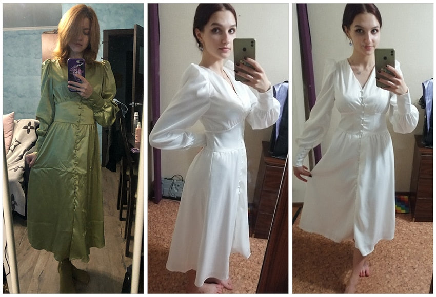 Tranquil Reflections Gown - Feel like a royal in this beautiful White Single Breasted Elegant Dress! Perfect for any special occasion with its High Waist Satin Long Dress and Chic Midi Dresses Lantern sleeve that will have you looking fashion-forward and chic. Make a statement and rock this sassy gown!