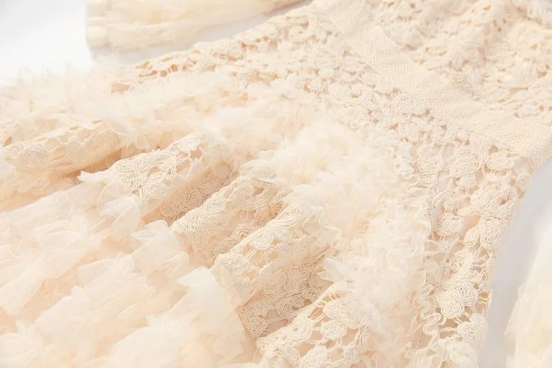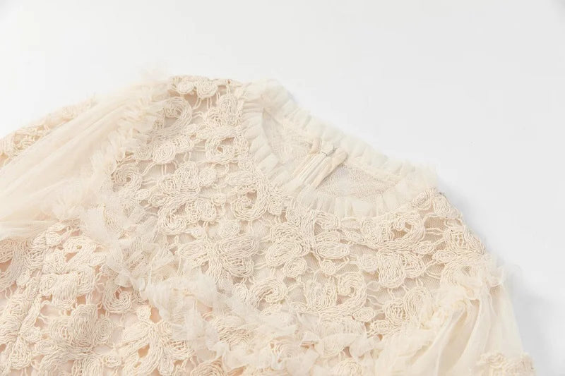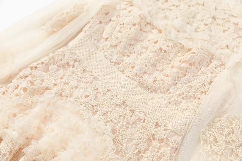 Understated yet refined, this appliquéd maxi dress blends vintage charm with modern ease. The O-neckline and empire waist create a graceful silhouette, while sheer layers of polyester move with soft fluidity. Subtle patchwork detailing adds texture and depth, making it a quietly elegant choice for evening occasions.