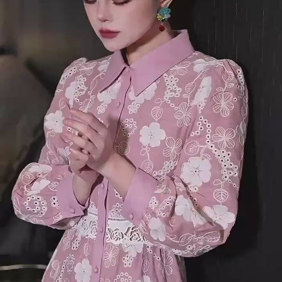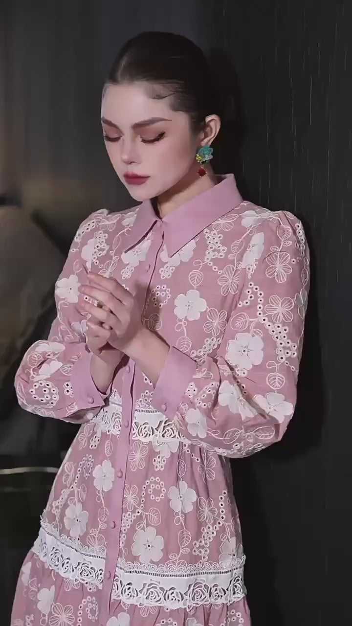 This dress perfectly merges structure and femininity with its collared neckline and full-length button design. The delicate lace panels add refinement, while the softly defined waist flatters the figure. Finished with long sleeves and a graceful A-line silhouette, it’s a versatile piece that transitions effortlessly from daytime gatherings to elegant evening affairs.