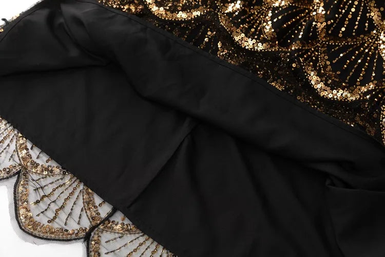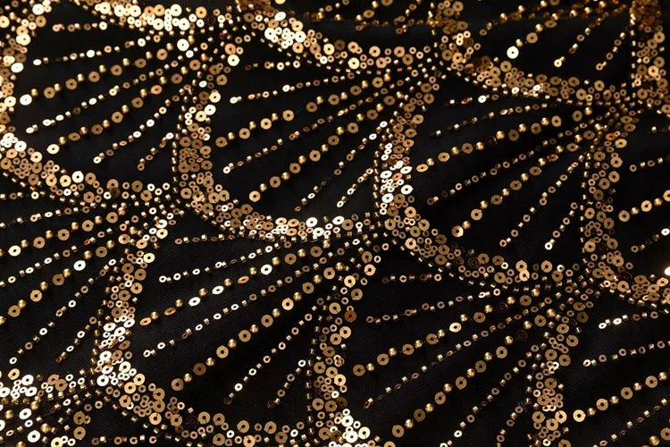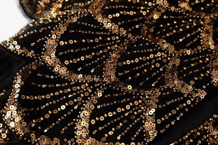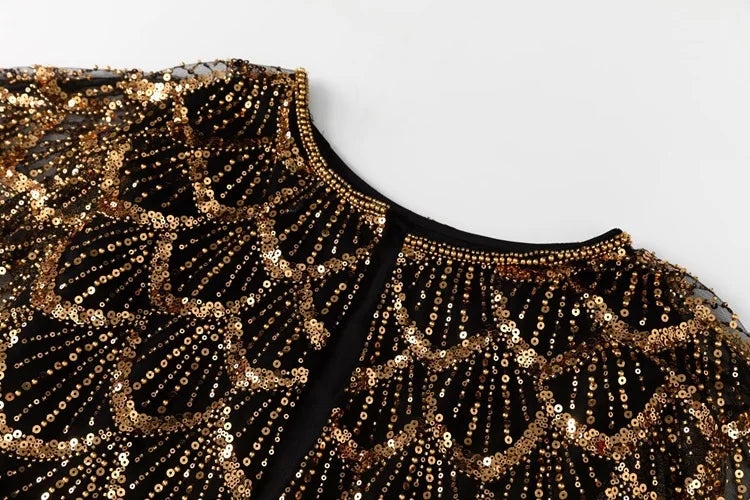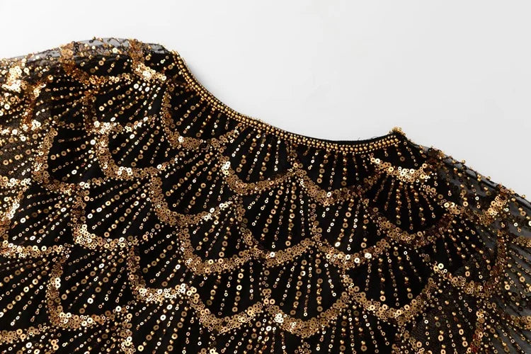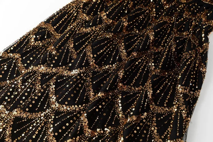 Embrace the sophisticated drama of this maxi-length dress, a beautifully styled piece for the autumn social season. The structured knitted polyester fabric ensures a sleek, anti-wrinkle finish in a flattering A-line silhouette. It features a soft ruffled neckline and graceful full sleeves, while opulent beading richly details the geometric pattern, creating a luxurious, vintage-inspired focal point.