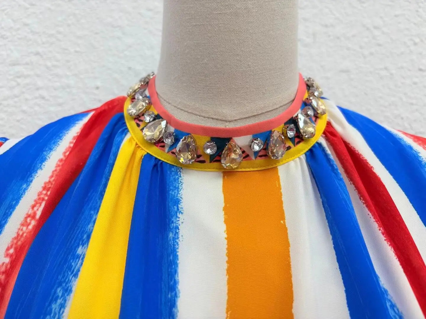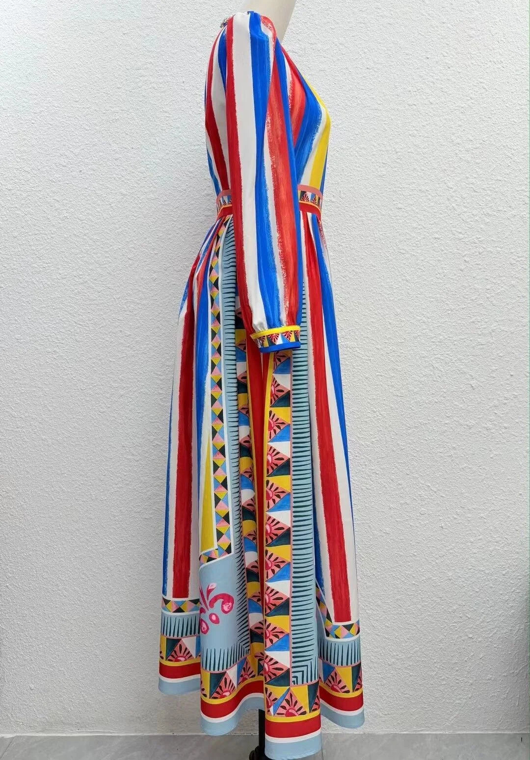 This maxi-length dress is a beautifully structured piece for the autumn social season, offering an essential update to your collection. The A-line silhouette is expertly cut from a comfortable woven blend, ensuring a polished, anti-wrinkle look. A simple O-neckline and graceful full sleeves anchor the design, while beading subtly accents the striped pattern, creating a refined and truly memorable focal point near the empire waistline.
