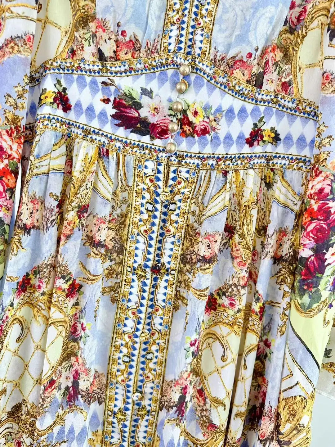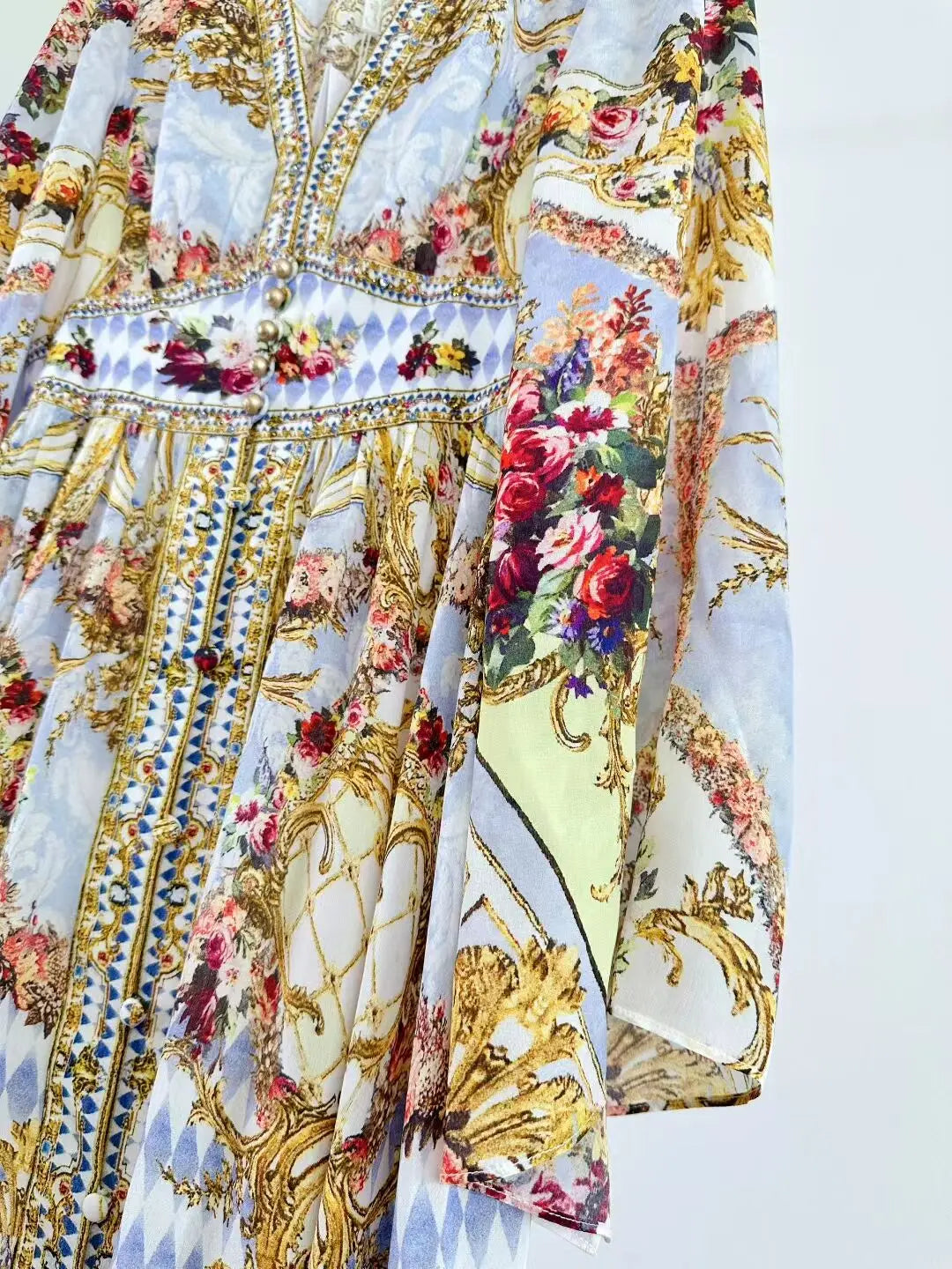 Designed for pure elegance, this maxi gown offers a beautiful, flowing shape and stunning visual appeal, perfect for autumn soirées. The exquisite woven silk ensures a polished, anti-wrinkle drape, realized in a sophisticated A-line silhouette. A flattering V-neck and full sleeves anchor the design, complemented by a striking print pattern and luminous beading that provides a captivating texture.