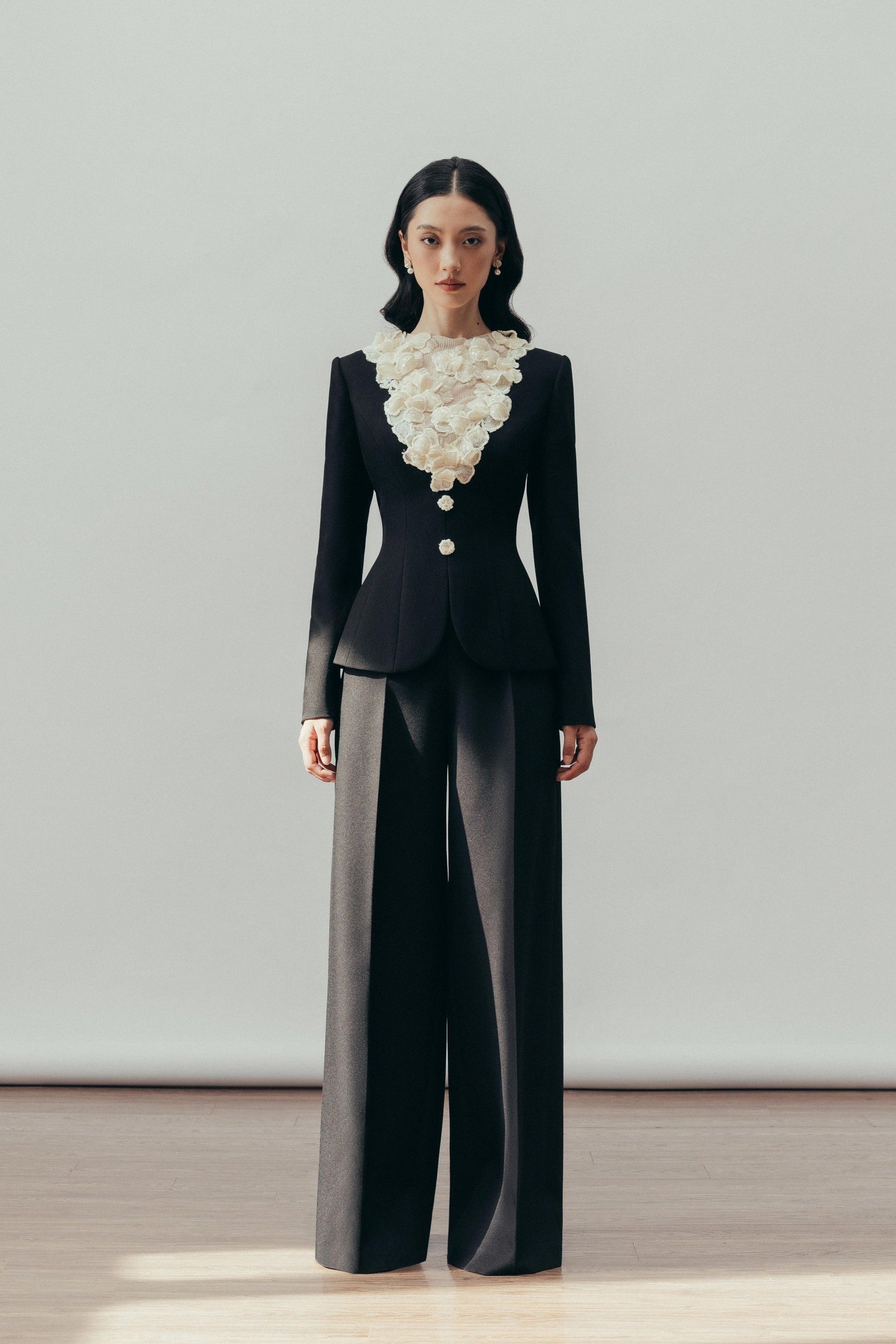 High-waisted, wide-leg pants with an asymmetric pleat.