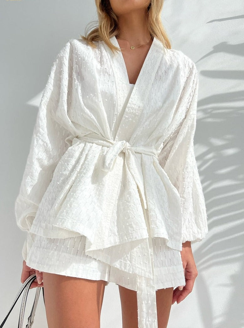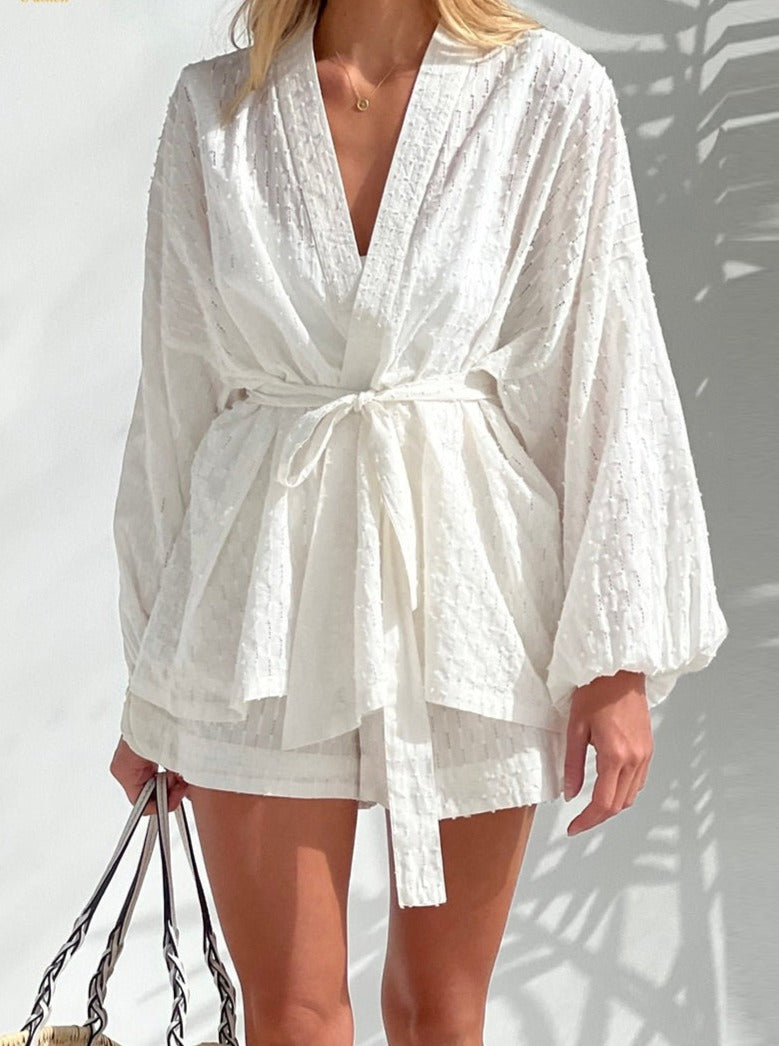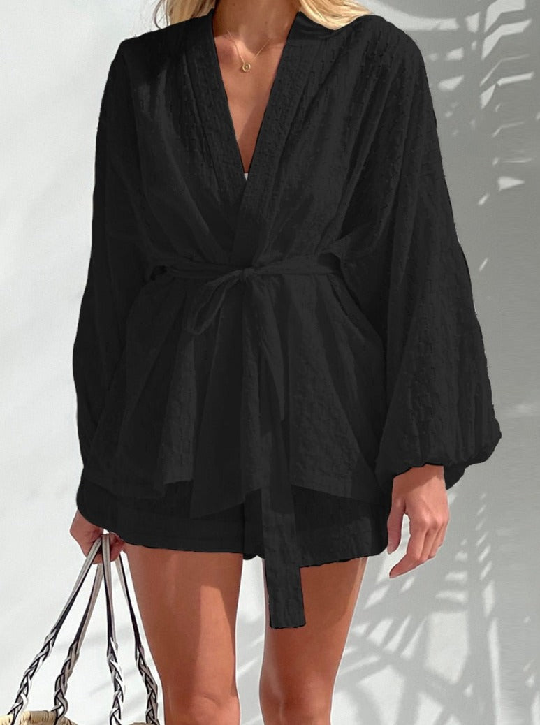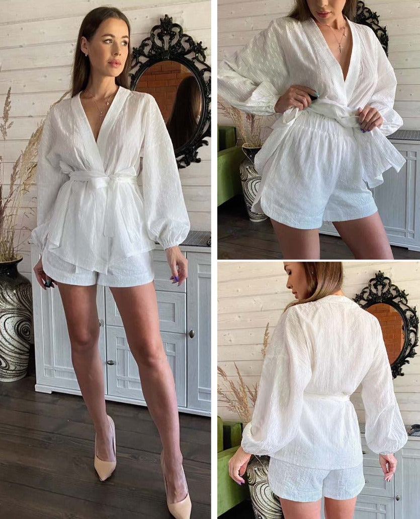 Stay on-trend and comfortable with Astral Harmony's Two Piece Set. This stylish set features a long-sleeved robe top with comfortable-fitting shorts - perfect for lounging at home or slaying the streets! Get the look and feel your best in this chic and sleek ensemble. Ready, set, slay!