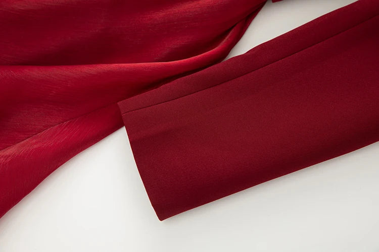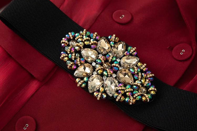 Bauble Buy’s Cassara Dress is a statement in power and poise. Designed with a tailored blazer-inspired bodice, it cinches at the waist with an ornate embellished belt before cascading into flowing chiffon panels. The layered textures create movement and drama, while the deep jewel tone exudes timeless sophistication—perfect for evening galas or elevated formal occasions.