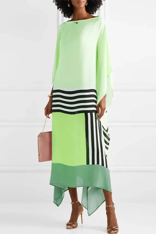 Bauble’s Cortana dress channels modern elegance with its fluid silhouette and striking color-block design. Crafted from airy, lightweight fabric, it features an artful blend of lime, mint, and seafoam tones, grounded by bold monochrome stripes. The asymmetrical hem and relaxed drape move beautifully as you walk. Pair it with minimal heels and a structured bag for an effortlessly elevated look.