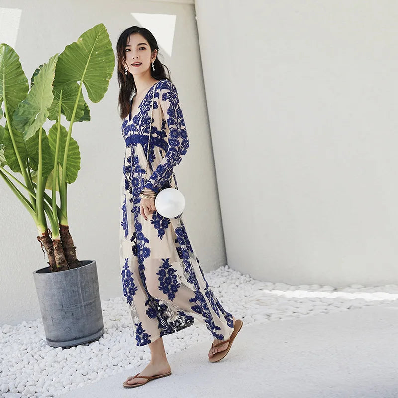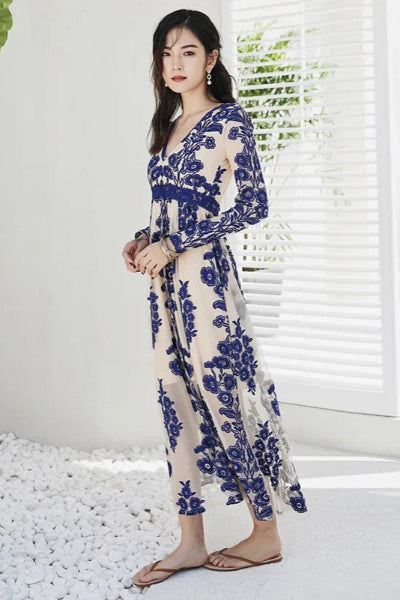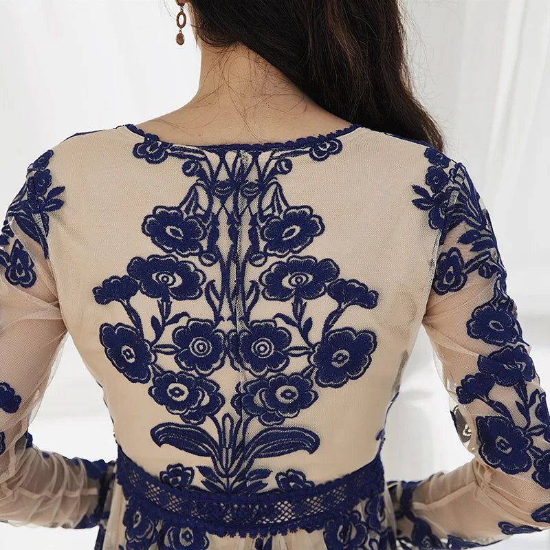 Sleeve Style: Regular | Dresses Length: Maxi Standard | Silhouette: A-Line | Waistline: Empire | Built-in Bra: NO | Style: Party | Weaving method: knitted | Logo/graphic design: embroidered | Technics: embroidered | Feature: anti-wrinkle, Breathable, Dry Cleaning, Sheer Layer | Neckline: V-neck | Fashion Element: Vintage | Sleeve Length(cm): Full | Pattern Type: Floral |