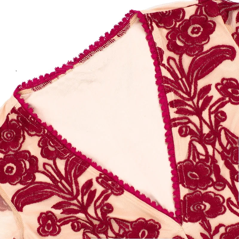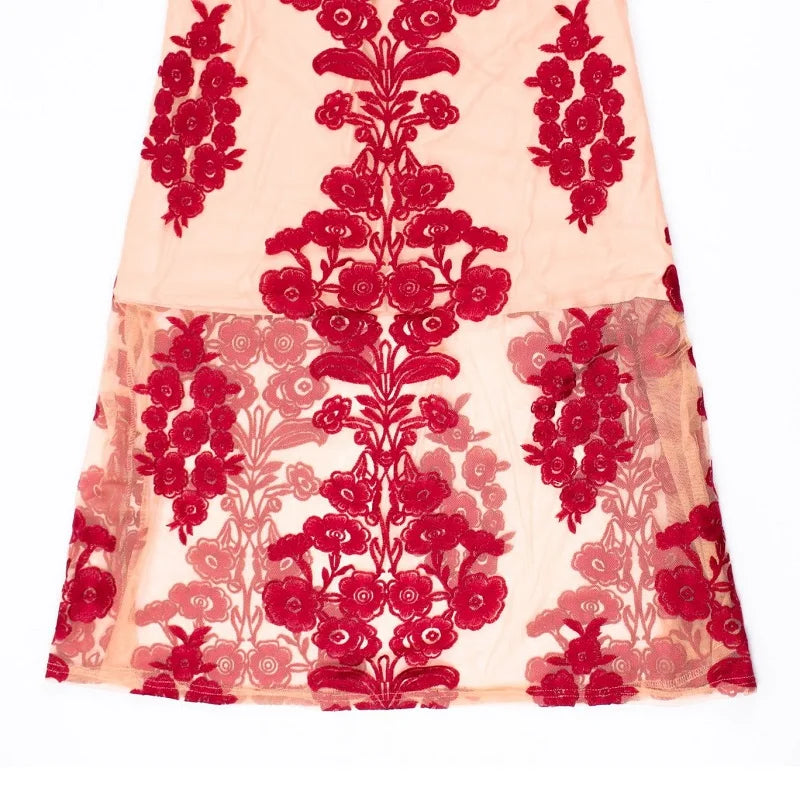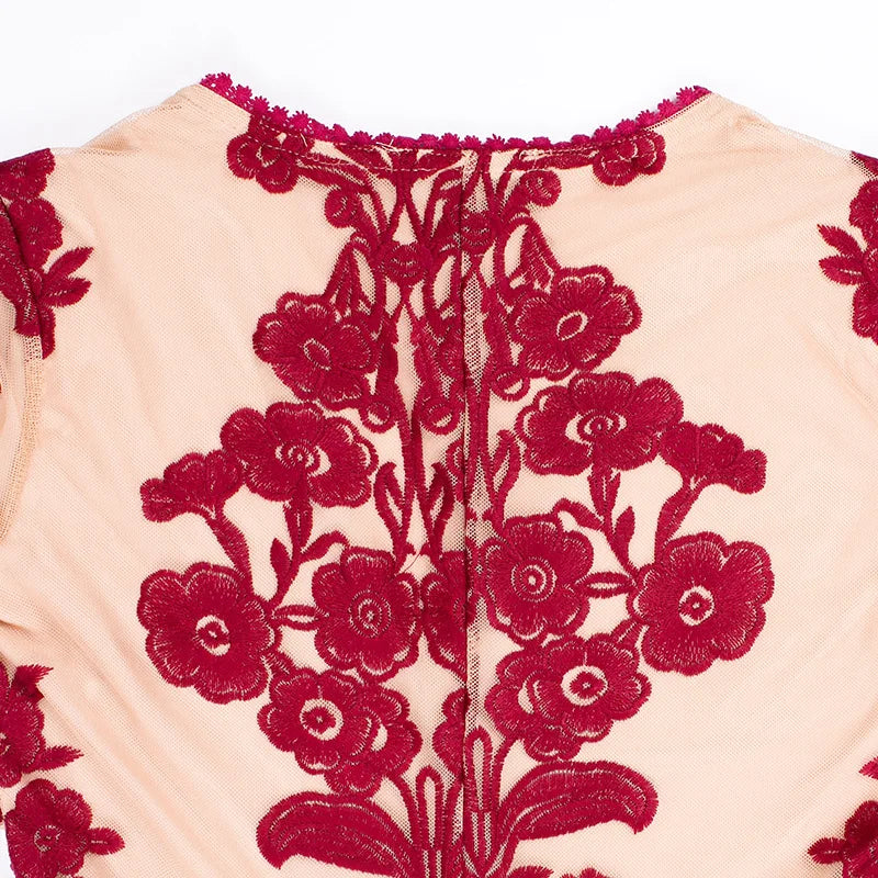 This embroidered floral maxi dress captures timeless sophistication with its flowing A-line silhouette and elegant V-neckline. Crafted from breathable polyester with a sheer layer, it drapes beautifully while offering comfort and ease. The empire waist and full sleeves add a refined finish—perfect for evening events or special occasions.